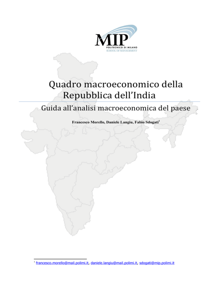 Quadro macroeconomico della Repubblica dell’India Guida all’analisi macroeconomica del paese Francesco Morello, Daniele Langiu, Fabio Sdogati1 1 [email protected], [email protected], [email protected] Indice 1. Introduzione .......................................................................................................... 3 2. Una panoramica dell’attuale situazione economica .................................................... 4 2.1. Alcuni indicatori macroeconomici....................................................................... 6 2.2. Scambi commerciali India-Europa ................................................................... 14 2.3. Scambi commerciali India-Italia ...................................................................... 18 2.4. Dodicesimo Piano Quinquennale ..................................................................... 23 2.4.1. Energia .................................................................................................... 23 2.4.2. Trasporto ................................................................................................. 25 2.4.3. Gestione sostenibile di risorse naturali ........................................................ 25 2.4.4. Trasformazione delle zone rurali ................................................................. 25 2.4.5. Settore agricolo ........................................................................................ 27 2.4.6. Settore manifatturiero ............................................................................... 27 2.5. Prospettive Future per l’India .......................................................................... 30 3. Fare impresa in India............................................................................................ 32 3.1. Politica e relazioni internazionali ...................................................................... 35 3.2. Economia ...................................................................................................... 36 3.3. Finanza e capitali ........................................................................................... 39 3.4. Operatività e Infrastrutture ............................................................................. 39 4. Il Ruolo Globale dell’India ..................................................................................... 41 4.1. La Valuta Nazionale ....................................................................................... 41 4.2. Investimenti diretti esteri................................................................................ 44 4.3. L’India nelle catene globali di produzione ......................................................... 50 Link Consigliati........................................................................................................... 73 Bibliografia ................................................................................................................ 74 2 1. Introduzione Dopo l’indipendenza, avvenuta nel 1947, l’India aderì a politiche socialiste e l’economia fu caratterizzata da interventi protezionistici, da un rilevante ruolo del governo nell’economia e da un ampio settore pubblico. Il commercio e le politiche di investimento estero, invece, erano relativamente liberali. Durante la conversazione con Jawaharlal Nehru, primo premier dell’India, JRD Tata affermò che il settore pubblico avrebbe dovuto realizzare profitti. La risposta di Nehru fu: “Never talk to me about profit, Jeh, it is a dirty word”. Questa frase esprime bene l’idea economica indiana nei primi anni di indipendenza. Nel 1991, per affrontare una crisi della bilancia dei pagamenti l’India ricevette il supporto del Fondo Monetario Internazionale. Questo supporto fu condizionato all’attuazione di riforme economiche, che furono intraprese sotto il primo ministro Narasimha Rao e il suo ministro dell’economia Manmohan Singh. Tramite politiche neoliberali, quali l’apertura al commercio internazionale e agli investimenti esteri, deregolamentazione, un insieme di privatizzazioni, riforme fiscali e misure per il controllo dell’inflazione, il prodotto interno lordo indiano intraprese un percorso di crescita sostenuta. L’India è nona economia al mondo per PIL nominale e la terza a parità dei poteri di acquisto. Dal 1991, ha progressivamente aperto i propri mercati, riducendo i controlli sul commercio estero e sugli investimenti indiretti esteri. Da tale anno, il prodotto interno lordo pro capite indiano ha seguito un andamento costantemente crescente e nel 2010 ha superato le 60,000 rupie, che, ad un tasso medio di 45.8 rupie per dollaro rilevato in tale anno, corrispondo a circa 1,300 dollari statunitensi. In tal modo, ha raggiunto tassi di crescita del PIL molto elevati a metà degli anni 2000, fino al 10.6 % tra il 2009 e il 2010. Insieme a Brasile, Cina e Russia, l'economia indiana è tra quelle a più rapida crescita nel mondo, rallentata in parte dalla crisi finanziaria globale scoppiata nel 2007. A seguito della recessione europea e statunitense, nel primo semestre del 2012 si è verificata la più lenta espansione da almeno un decennio: l’economia, infatti, è cresciuta ad un tasso annuo del 5.3%, in declino rispetto al primo trimestre del 2011 in cui si è registrata una crescita del 9.2%2. 2 Financial Times (31 May 2012), Indian GDP growth slides to 5.3%. 3 2. Una panoramica dell’attuale situazione economica La Repubblica dell’India è un’economia in crescita dal 1980 (Figura 1), la cui intensità è aumentata a seguito della liberalizzazione economica iniziata nel 1991. La prospettiva di crescita per il 2012 si attesta ad un tasso del 5.3% che le permetterà, secondo le stime del Fondo Monetario Internazionale, di raggiungere il prodotto interno italiano nel 2014. In Figura 2 è riportato un confronto internazionale del prodotto interno lordo. Nel 2011, l’India è ultima in questa classifica, m