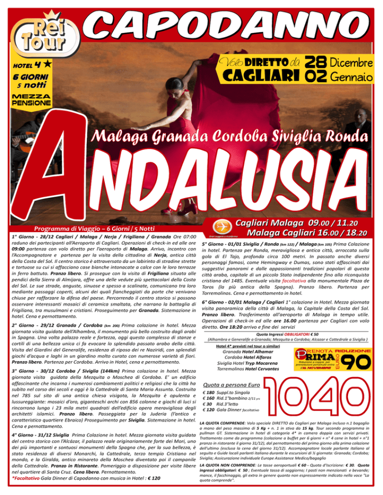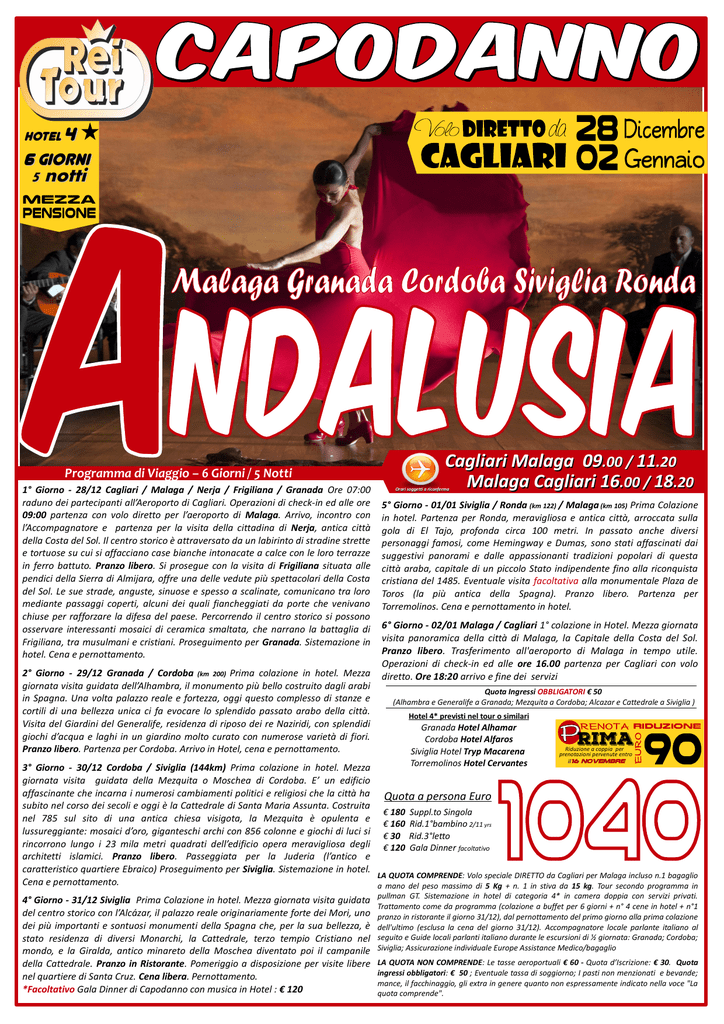 HOTEL 4 6 giorni 5 notti Programma di Viaggio – 6 Giorni / 5 Notti 1° Giorno - 28/12 Cagliari / Malaga / Nerja / Frigiliana / Granada Ore 07:00 raduno dei partecipanti all’Aeroporto di Cagliari. Operazioni di check-in ed alle ore 09:00 partenza con volo diretto per l’aeroporto di Malaga. Arrivo, incontro con l’Accompagnatore e partenza per la visita della cittadina di Nerja, antica città della Costa del Sol. Il centro storico è attraversato da un labirinto di stradine strette e tortuose su cui si affacciano case bianche intonacate a calce con le loro terrazze in ferro battuto. Pranzo libero. Si prosegue con la visita di Frigiliana situata alle pendici della Sierra di Almijara, offre una delle vedute più spettacolari della Costa del Sol. Le sue strade, anguste, sinuose e spesso a scalinate, comunicano tra loro mediante passaggi coperti, alcuni dei quali fiancheggiati da porte che venivano chiuse per rafforzare la difesa del paese. Percorrendo il centro storico si possono osservare interessanti mosaici di ceramica smaltata, che narrano la battaglia di Frigiliana, tra musulmani e cristiani. Proseguimento per Granada. Sistemazione in hotel. Cena e pernottamento. 2° Giorno - 29/12 Granada / Cordoba (km 200) Prima colazione in hotel. Mezza giornata visita guidata dell’Alhambra, il monumento più bello costruito dagli arabi in Spagna. Una volta palazzo reale e fortezza, oggi questo complesso di stanze e cortili di una bellezza unica ci fa evocare lo splendido passato arabo della città. Visita del Giardini del Generalife, residenza di riposo dei re Naziridi, con splendidi giochi d’acqua e laghi in un giardino molto curato con numerose varietà di fiori. Pranzo libero. Partenza per Cordoba. Arrivo in Hotel, cena e pernottamento. Cagliari Malaga 09.00 / 11.20 Malaga Cagliari 16.00 / 18.20 Orari soggetti a riconferma 5° Giorno - 01/01 Siviglia / Ronda (km 122) / Malaga (km 105) Prima Colazione in hotel. Partenza per Ronda, meravigliosa e antica città, arroccata sulla gola di El Tajo, profonda circa 100 metri. In passato anche diversi personaggi famosi, come Hemingway e Dumas, sono stati affascinati dai suggestivi panorami e dalle appassionanti tradizioni popolari di questa città araba, capitale di un piccolo Stato indipendente fino alla riconquista cristiana del 1485. Eventuale visita facoltativa alla monumentale Plaza de Toros (la più antica della Spagna). Pranzo libero. Partenza per Torremolinos. Cena e pernottamento in hotel. 6° Giorno - 02/01 Malaga / Cagliari 1° colazione in Hotel. Mezza giornata visita panoramica della città di Malaga, la Capitale della Costa del Sol. Pranzo libero. Trasferimento all'aeroporto di Malaga in tempo utile. Operazioni di check-in ed alle ore 16.00 partenza per Cagliari con volo diretto. Ore 18:20 arrivo e fine dei servizi Quota Ingressi OBBLIGATORI € 50 (Alhambra e Generalife a Granada; Mezquita a Cordoba; Alcazar e Cattedrale a Siviglia ) Hotel 4* previsti nel tour o similari Granada Hotel Alhamar Cordoba Hotel Alfaros Siviglia Hotel Tryp Macarena Torremolinos Hotel Cervantes rima Riduzione a coppia per prenotazioni pervenute entro il16 Novembre 3° Giorno - 30/12 Cordoba / Siviglia (144km) Prima colazione in hotel. Mezza giornata visita guidata della Mezquita o Moschea di Cordoba. E’ un edificio affascinante che incarna i numerosi cambiamenti politici e religiosi che la città ha Quota a persona Euro subito nel corso dei secoli e oggi è la Cattedrale di Santa Maria Assunta. Costruita € 180 Suppl.to Singola nel 785 sul sito di una antica chiesa visigota, la Mezquita è opulenta e € 160 Rid.1°bambino 2/11 yrs lussureggiante: mosaici d’oro, giganteschi archi con 856 colonne e giochi di luci si € 30 Rid.3°letto rincorrono lungo i 23 mila metri quadrati dell’edificio opera meravigliosa degli € 120 Gala Dinner facoltativo architetti islamici. Pranzo libero. Passeggiata per la Juderia (l’antico e caratteristico quartiere Ebraico) Proseguimento per Siviglia. Sistemazione in hotel. LA QUOTA COMPRENDE: Volo speciale DIRETTO da Cagliari per Malaga incluso n.1 bagaglio Cena e pernottamento. a mano del peso massimo di 5 Kg + n. 1 in stiva da 15 kg. Tour secondo programma in 4° Giorno - 31/12 Siviglia Prima Colazione in hotel. Mezza giornata visita guidata del centro storico con l’Alcázar, il palazzo reale originariamente forte dei Mori, uno dei più importanti e sontuosi monumenti della Spagna che, per la sua bellezza, è stato residenza di diversi Monarchi, la Cattedrale, terzo tempio Cristiano nel mondo, e la Giralda, antico minareto della Moschea diventato poi il campanile della Cattedrale. Pranzo in Ristorante. Pomeriggio a disposizione per visite libere nel quartiere di Santa Cruz. Cena libera. Pernottamento. *Facoltativo Gala Dinner di Capodanno con musica in Hotel : € 120 pullman GT. Sistemazione in hotel di categoria 4* in camera doppia con servizi privati. Trattamento come da programma (colazione a buffet per 6 giorni + n° 4 cene in hotel + n°1 pranzo in ristorante il giorno 31/12), dal pernottamento del primo giorno alla prima colazione dell'ultimo (esclusa la cena del giorno 31/12). Accompagnatore locale parlante italiano al seguito e Guide locali parlanti italiano durante le escursioni di ½ giornata: Granada; Cordoba; Siviglia; Assicurazione individuale Europe Assistance Medico/bagaglio LA QUOTA NON COMPRENDE: Le tasse aeroportuali € 60 - Quota d’Iscrizione: € 30. Quota ingressi obbligatori: € 50 ; Eventuale tassa di soggiorno; I pasti non menzionati e bevande; mance, il facchinaggio, gli extra in genere quanto non espressamente indicato nella voce "La quota comprende".