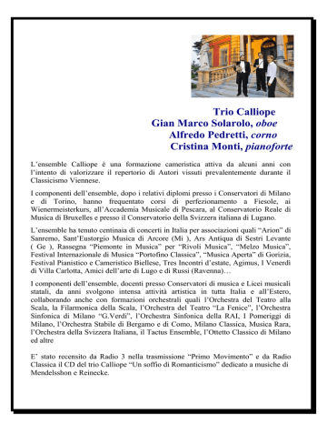 Trio Calliope Gian Marco Solarolo, oboe Alfredo Pedretti, corno Cristina Monti, pianoforte L’ensemble Calliope è una formazione cameristica attiva da alcuni anni con l’intento di valorizzare il repertorio di Autori vissuti prevalentemente durante il Classicismo Viennese. I componenti dell’ensemble, dopo i relativi diplomi presso i Conservatori di Milano e di Torino, hanno frequentato corsi di perfezionamento a Fiesole, ai Wienermeisterkurs, all’Accademia Musicale di Pescara, al Conservatorio Reale di Musica di Bruxelles e presso il Conservatorio della Svizzera italiana di Lugano. L’ensemble ha tenuto centinaia di concerti in Italia per associazioni quali “Arion” di Sanremo, Sant’Eustorgio Musica di Arcore (Mi ), Ars Antiqua di Sestri Levante ( Ge ), Rassegna “Piemonte in Musica” per “Rivoli Musica”, “Melzo Musica”, Festival Internazionale di Musica “Portofino Classica”, “Musica Aperta” di Gorizia, Festival Pianistico e Cameristico Biellese, Tres Incontri d’estate, Agimus, I Venerdì di Villa Carlotta, Amici dell’arte di Lugo e di Russi (Ravenna)… I componenti dell’ensemble, docenti presso Conservatori di musica e Licei musicali statali, da anni svolgono intensa attività artistica in tutta Italia e all’Estero, collaborando anche con formazioni orchestrali quali l’Orchestra del Teatro alla Scala, la Filarmonica della Scala, l’Orchestra del Teatro “La Fenice”, l’Orchestra Sinfonica di Milano “G.Verdi”, l’Orchestra Sinfonica della RAI, I Pomeriggi di Milano, l’Orchestra Stabile di Bergamo e di Como, Milano Classica, Musica Rara, l’Orchestra della Svizzera Italiana, il Tactus Ensemble, l’Ottetto Classico di Milano ed altre E’ stato recensito da Radio 3 nella trasmissione “Primo Movimento” e da Radio Classica il CD del trio Calliope “Un soffio di Romanticismo” dedicato a musiche di Mendelsshon e Reinecke. Le proposte 2015 “Songs, colonne sonore e… un pizzico di Romanticismo” Carl Reinecke Trio op.188 per oboe, corno e pianoforte Allegro moderato - Scherzo (Molto vivace) Adagio - Finale (Allegro ma non troppo) Georg Gershwin Songs They cant’t take that away from me Embraceable you Summertime I got rhythm Bess, you is my woman now Let’s call the whole thing off Jerry Goldsmith Katia ( 1990 ) ( dal film “ The Russia house “ arr. di Luigi Giachino ) Nino Rota The Godfather Suite ( 1972 ) ( dal film “ Il Padrino“ arr. di Luigi Giachino ) Ennio Morricone Gabriel’s Oboe ( 1986 ) ( dal film “ The mission“, arr. di Luigi Giachino) C’era una volta il West ( 1968 ) ( dal film omonimo arr. di Luigi Giachino ) “La musica tra parole e immagini” Michael Nyman “Film Suite” trascrizione di Francesco di Fiore per il Trio Calliope Chasing sheep is best left to shepherds (dal film The Draughtsman’s Contract ) Time lapse ( dal film A zed and two noughts ) If ( dal film The diary of Anne Frank ) Here to there - The promise ( dal film The Piano ) Georg Gershwin Songs They cant’t take that away from me - Oh, Lady be good Embraceable you - Summertime I got rhythm - It ain’t necessarily so Bess, you is my woman now - Let’s call the whole thing off Jerry Goldsmith Katia ( 1990 ) ( dal film “ The Russia house “ arr. di Luigi Giachino ) Nino Rota The Godfather Suite ( 1972 ) ( dal film “ Il Padrino“ arr. di Luigi Giachino ) Nicola Piovani La vita è bella ( 1997) ( dal film “La vita è bella” arr. di Luigi Giachino) Ennio Morricone Gabriel’s Oboe ( 1986 ) ( dal film “ The mission“, arr. di Luigi Giachino) C’era una volta il West ( 1968 ) ( dal film omonimo arr. di Luigi Giachino ) “Capolavori poco noti del Romanticismo tedesco” Carl Reinecke Trio in la minore op.188 per oboe, corno e pianoforte Allegro moderato Scherzo (Molto vivace) Adagio Finale (Allegro ma non troppo) Heinrich von Herzogenberg Trio in re maggiore op.61 per oboe, corno e pianoforte Allegretto Presto Andante con moto Allegro Gian Marco Solarolo Nato a Tortona, si è diplomato in oboe presso il Conservatorio"Verdi" di Torino e in Didattica della musica presso il Conservatorio "Vivaldi" di Alessandria . Si è successivamente perfezionato in Belgio presso il Reale Conservatorio di Musica di Bruxelles, nella classe di P.Dombrecht, ottenendo il "1° prix" e il diploma superiore. Ha frequentato negli anni '84/85 il corso di oboe barocco e di strumenti rinascimentali tenuto da M.Piguet presso la Schola Cantorum Basiliensis di Basilea. Ha seguito inoltre in diverse sedi corsi estivi di perfezionamento con O.Zoboli,A.Bernardini e, per la musica da camera, B.Canino, P.Borgonovo e M.Holtzel e si è perfezionato presso l'Accademia Musicale Pescarese con H.Elhorst. Ha collaborato con l'Orchestra Sinfonica di Torino della RAI, con l'Orchestra Stabile di Bergamo e con diversi altri gruppi cameristici e orchestrali come l'Orchestra Barocca Italiana, l'Orchestra Barocca del "Santo Spirito" di Torino, l'Orchestra da Camera di Linz (Austria), l'Orchestra da Camera "Musica Rara" e la Verdi Barocca da Milano. Ha partecipato a importanti rassegne come l'Aterforum di Ferrara, il Festival di Musica Antica di Savona, l'Europa Musica Festival, il Festival di Magadino e il "Settembre Musica" di Torino. Ha effettuato registrazioni radiofoniche per la RAI Radio3, la RTSI, la Radio Vaticana, la Radio Nazionale Spagnola 2 e incisioni discografiche per la Bongiovanni di Bologna, la Sarx di Milano e la Classic Studio di Ancona. Insegna oboe presso il Liceo Musicale Tenca di Milano Alfredo Pedretti Diplomatosi al Conservatorio G.Verdi di Milano, collabora regolarmente come primo corno e assistente al primo corno con prestigiose orchestre quali: Teatro alla Scala, Filarmonica della Scala, Pomeriggi Musicali di Milano, Orchestra della Radio Svizzera, Orchestra R.A.I., Milano Classica, Orchestra Cantelli con Maestri del calibro di Pavarotti, Accardo, Muti, Giulini, Ceccato, Chailly, Gatti, Sinopoli, Pretre, Ihmbal, Berio, Jurowsky, Sado e incidend