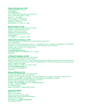 Rifugio della Balma mt. 1986 Vallone della Balma Coazze [email protected] www.rifugiobalma.it tel. 011.93.40.367 (mercoledì sera sede CAI) tel.011.93.49.336 (telefono rifugio) apertura 1 - 31 agosto festivi 1 giugno - 30 settembre proprietà: Comune di Coazze gestione: CAI Coazze N. 45,02453 E. 7,11420 mt. 1984 Rifugio Coazze mt. 1338 Borgata Ciargiur di mezzo (Forno di Coazze) Proprietà: CAI Sezione di Coazze gestione: apertura a richiesta attualmente in ristrutturazione riapertura prevista per l’anno 2016 [email protected] N. 45,03062 E. 7,14765 mt. 1348 Rifugio GEAT Val Gravio, m 1390 Vallone del Gravio, Loc.Pianetti, comune San Giorio di Susa (TO) tel. 011-96.46.364 Proprietà: CAI Torino Sottosezione G.E.A.T , (Presidente G.E.A.T. Gianfranco Rapetta tel. 347 2309160) Apertura: 1/7-31/8 continuativa; tutto l'anno nei fine settimana, ponti e festività Gestore: Mario Sorbino; tel. 333.84.54.390 www.rifugiovalgravio.it [email protected] coordinate GPS: Lat: 45,085894 / Lon: 7,171927 Buoni ISZ " Rifugio O. Amprimo " m 1385 Pian Cervetto, BUSSOLENO, tel. 0122- 49.353 Proprietà: CAI Bussoleno, tel. 0122- 49.461 Apertura dal primo week end di marzo al 24 giugno tutti i fine settimana, dal 24-06 al primo week-end di settembre tutti i giorni, dopo tutti i week-end fino all'Epifania. In altri periodi aperture su prenotazione per gruppi o soggiorni scolastici. Gestore: Roberto PLANO; tel. 338.61.18.021 sito www.rifugioamprimo .it E-mail: [email protected] Buoni ISZ Rifugio TOESCA, m 1710 Pian del Roc. BUSSOLENO, tel. 0122-49.526 Proprietà: CAI Uet TO, tel. 011-65.05.081 Apertura: 30,31 Maggio/01,02giugno; poi il fine settimana 5,6,7 giugno. Dal sabato 13 giugno fino a domenica 13 settembre sempre aperto, poi i fine settimana di settembre e ottobre. apertura straordinarie per gruppi di almeno 15 persone. Gestore: Marco Ghibaudo, tel. 3462247806 Contatti mail: [email protected]; [email protected] tel rifugio (+39) 0122 49526 www.rifugiotoesca.it pagina di facebook: Rifugio Alpino Toesca Rifugio SELLERIES Metri 2023 s. l. m. Roure – Val Chisone. Apertura annuale: sempre aperto Gestori Bertin Sylvie e Manavella Massimo. Telefono 0121. 842.664 Email gestore: [email protected] www.rifugioselleries.it Rifugio GUIDO REY, m 1761 Pré Meunier, OULX, Tel.: 0122 831390 fax: 011.1970.6503 Rifugio CAI Sezione: U.G.E.T. TORINO, tel. 011-53.79.83 Categoria: C - 20 posti letto Apertura estiva : da LUGLIO a metà SETTEMBRE Apertura invernale: da Natale e fine Marzo Prenotazione cell. 349.30.78.110 - [email protected] Responsabile CLAUDIO; tel. 011.02.02.256 - 335.59.66.771- [email protected] www.rifugioguidorey.it - http://www.caiuget.it Coordinate GPS 45° 1'38.55" 6°45'22.63" Rifugio LEVI-MOLINARI, m 1849 Grange della Valle, EXILLES, tel. 0122-58.241 Proprietà: CAI TO, tel. 011-53.92.60 Apertura: 15/6-15/9 continuativo; dal 01/05 al 31/05 e dal 15/09 al 15/10 aperto tutti i week-end e in settimana su prenotazione Gestore: POLVERE DI STELLE SNC di Pozzi Marco & C. tel. 339-42.69.402; 011.96.32.151 Mail: [email protected] Rifugio III ALPINI, m 1772 Les Granges de la Vallée Étroite, Valle Stretta, 05100 Nevache tel. +39 0122 902071 (rifugio), Proprietario: Riccardo NOVO - tel. + 39 335 6179182 Apertura: primavera su prenotazione 15/6-15/9, week end sempre E-mail: [email protected]. Rifugio I RE MAGI, m 1769 slm Valle Stretta, B.P.204 05100 - Briançon tel. +39.349-6112920 Mob: 00.39.368.91.79.52 oppure +39.0122-96451 Proprietà: Renato NERVO Apertura invernale: dal 26/12 al 06/01 e dal 01/02 a Pasqua tutti i giorni Apertura estiva: dal 15/6 al 15/9 tutti i giorni Negli altri periodi: tutti i week-end e su prenotazione in settimana Proprietario:, tel. +39.0122-96451 Latitudine : 45.068792555489601 Longitudine : 6.6295623779296902 Rifugio Camillo SCARFIOTTI, m 2160 Grange du Fond, BARDONECCHIA tel. 0122-90.18.92 Proprietà: CAI Torino, tel. 011-54.60.31 Apertura: Fine settimana: seconda metà di settembre – Continuativa: da metà giugno a metà settembre. Gestore: Giovanni ODIN, tel. 333.67.15.086 Email gestore: [email protected] Rifugio AVANZÀ, m 2538 Passo Avanzà, comune di VENAUS, tel. 0122-50.330; cell. 342.76.32.2120 Proprietà: Comune di Venaus Gestione: Pro Loco Venaus Apertura: agosto, festivi luglio-settembre Gestore: CARLO CAFFO (pres. Associazione Turistica Pro Loco di Venaus), cell. 340.18.41.602 Coordinate GPS: N. 45° 10' 15" E. 06° 57' 08" RIFUGIO LUIGI VACCARONE: Loc. Lago dell'Agnello, Giaglione, tel. 0122.33226 Proprietà: Comune di Giaglione, in concessione al C.A.I. Chiomonte Apertura estiva: dal 1 luglio al 31 agosto e nei fine settimana di giugno e settembre Prenotazioni: 39 0122 33 226 (rifugio) oppure +39 3479657918 (nei periodi di chiusura) Gestore: Nino Malavenda Coordinate GPS: N45 09.237 E6 55.025 http://www.rifugiovaccarone.eu/ Rifugio STELLINA, m 2610 Punta Carolei, NOVALESA, tel. 0122-653333 Proprietà: Comune di Novalesa. Apertura: Bivacco/Rifugio è aperto tutto l'anno e custodito in luglio ed agosto, dopo solo se ci sono prenotazioni di gruppi. Referente Francesco Foglia (tel. 348/7932330) Mail: [email protected] Coordinate UTM : 5008750 N - 346350 E Rifugio Baita Gimont (2035 m.s.l.m.) Indirizzo: Pian Gimont, CESANA TORINESE, 10054 Torino Telefono: +390122878033 E-mail: [email protected] Facebook: Baita Gimont Gestore: Bruno Morella (+393287099155) La zona del rifugio è coperta da rete cellulare In rifugio è a disposizione degli ospiti una rete wi-fi Coordinate UTM N 44° 55’ 20,1’’ E 006° 46’ 00,9’’ Apertura Stagione invernale 2013/2014: continuato dal 30 novembre al 13 aprile Stagione estiva 2014: solo fine settimana dal 31 maggio • continuato dal 28 giugno al 14 settembre • solo fine settimana sino al 28 settembre Su prenotazione nei restanti periodi Prenotazione sempre gradita Rifugio Alpino La Chardouse Rifugio Alpino cat “C” - Altitudine 1659 m. Borgata Vazon,5 - Oulx (To) Valle Susa Coordinate gps 45°01’02.87” 6°48’55.08’