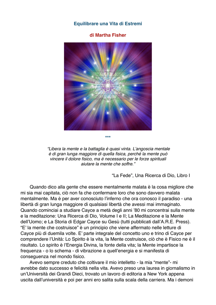 Equilibrare una Vita di Estremi! ! di Martha Fisher! ***! ! ! ! “Libera la mente e la battaglia è quasi vinta. L’angoscia mentale! è di gran lunga maggiore di quella fisica, perché la mente può! vincere il dolore fisico, ma è necessario per le forze spirituali! aiutare la mente che soffre.”! ! ! ! ! ! ! ! “La Fede”, Una Ricerca di Dio, Libro I! Quando dico alla gente che essere mentalmente malata è la cosa migliore che mi sia mai capitata, ciò non fa che confermare loro che sono davvero malata mentalmente. Ma è per aver conosciuto l’inferno che ora conosco il paradiso - una libertà di gran lunga maggiore di qualsiasi libertà che avessi mai immaginato. Quando cominciai a studiare Cayce a metà degli anni ’80 mi concentrai sulla mente e la meditazione: Una Ricerca di Dio, Volume I e II; La Meditazione e la Mente dell’Uomo; e La Storia di Edgar Cayce su Gesù (tutti pubblicati dall’A.R.E. Press). “E’ la mente che costruisce” è un principio che viene affermato nelle letture di Cayce più di duemila volte. E’ parte integrale del concetto uno e trino di Cayce per comprendere l’Unità: Lo Spirito è la vita, la Mente costruisce, ciò che è Fisico ne è il risultato. Lo spirito è l’Energia Divina, la fonte della vita; la Mente impartisce la frequenza - o lo schema - di vibrazione a quell’energia e si manifesta di conseguenza nel mondo fisico.! Avevo sempre creduto che coltivare il mio intelletto - la mia “mente”- mi avrebbe dato successo e felicità nella vita. Avevo preso una laurea in giornalismo in un’Università dei Grandi Dieci, trovato un lavoro di editoria a New York appena uscita dall’università e poi per anni ero salita sulla scala della carriera. Ma i demoni che mi avevano tormentata di tanto in tanto dalla mia prima gioventù - insonnia, ansietà, depressione, euforia senza motivo - cominciarono a sopraffarmi e l’intelligenza non riuscì a salvarmi. Per quanto mi stancassi, non riuscii a dormire e il sonno era la mia unica via di fuga. Quando finalmente riuscii a dormire, qualche volta non riuscii a smettere.! Paranoica e vicina al suicidio, finalmente andai a trovare uno psichiatra che mi diagnosticò un disordine bipolare (maniaco-depressiva) - uno squilibrio chimico nel cervello che, nel migliore dei casi, avrebbe potuto essere gestito con delle medicine, ma mai curato. Pensai che fosse la cosa peggiore che mi potesse mai accadere: se la Mente costruisce e la mia mente era malata, la mia vita doveva essere rovinata.! Avevo una malattia di estremi. Ognuno di noi è un sistema di energia che vibra alla frequenza del nostro stesso campo di energia. La mia era una vita completamente sbilanciata che vibrava fra estremi di bassa energia (depressione) e alta energia (mania). Non sapevo mai da un giorno - da un’ora - all’altro se mi fossi arrampicata sui muri o se fossi stata troppo letargica per nutrire o pulire me stessa. Per i seguenti sei anni presi litio e antidepressivi, visitai tutti i giorni dei terapeutici e gruppi di supporto e vissi dei benefici d’invalidità della Sicurezza Sociale e di qualche lavoro sporadico di libera professionista. Per anni temetti che io, una volta una donna in carriera, non avrei mai più avuto un posto di lavoro.! Col passare del tempo mi staccai sempre di più dalla realtà. La mia mente non riuscì a seguire il compito più semplice. Non era prudente per me guidare una macchina o cucinare per me stessa. I miei sensi si sovrapposero: assaggiavo i colori, “vedevo” la musica e “sentivo” i suoni come vibrazioni intense in tutto il corpo.! Una notte stavo aspettando a casa mia un’amica che era stata molto malata. Quando non arrivò mi convinsi in qualche modo che fosse morta. Gradualmente, nel corso della notte, mi resi conto che ero io che stavo per morire: stavo ricevendo delle forti impressioni intuitive che mi descrissero esattamente come, dove e persino quando sarei morta il giorno dopo.! Non credo che queste fossero interamente illusioni; credo - allora e adesso che la mia anima stesse disperatamente cercando di abbandonare il mio corpo. Malgrado le temperature da record di 100 gradi Fahrenheit mi sentivo ghiacciata fino nelle ossa per parecchi giorni prima di questa esperienza e non riuscii a scaldarmi. Mi sentivo come se mi stessi dissolvendo, perdendo completamente il senso del sé; ora so che cosa intendono sia i psichiatri sia gli insegnanti della saggezza perenne quando si riferiscono ad una “completa perdita dei limiti dell’ego”. Non vedevo la mia corda d’argento o una luce chiara alla fine di un tunnel, ma mi sentivo sopraffatta dall’amore incondizionato verso tutti di cui avevo sentito parlare altri nelle esperienze vicine alla morte. E venni sicuramente visitata dagli angeli. ! ! ! ! ! ! Sentii una presenza incredibile nella stanza e cominciai a sentire delle voci. “Di’ l’ora ad alta voce,” disse la voce delicata. Dissi l’ora ad alta voce e la registrazione disse: “Buon giorno. Al segnale acustico saranno le dodici in punto.” Era mezzanotte in punto. Improvvisamente notai che alle ore 12 le lancette dell’orologio sarebbero state unite, puntando verso l’alto - come le mani in preghiera. Era una direttiva bizzarra per pregare e pregai che Dio mi salvasse da questa situazione in cui ero indifesa e fuori controllo. Fu una lezione fondamentale di umiltà.! La stanza era piena di amore e la voce rasserenante rispose: “Nella casa di mio Padre ci sono molte dimore; vado là per preparare un posto per voi, così che dove sono io anche voi potete stare.” Sapevo che, secondo Cayce, la parola “casa” nella Scrittura rappresenta coscienza. Interpretai il messaggio come: “Nella coscienza di mio Padre ci sono stati infiniti di coscienza; vado là per prepararvi un posto . . .” Mi sentii sopraffatta dall’amore, certa che Dio dovesse avere veramente qualche scopo per me.! Ma avevo paura di raccontare a chiunque della mia esperienza e non riuscii 