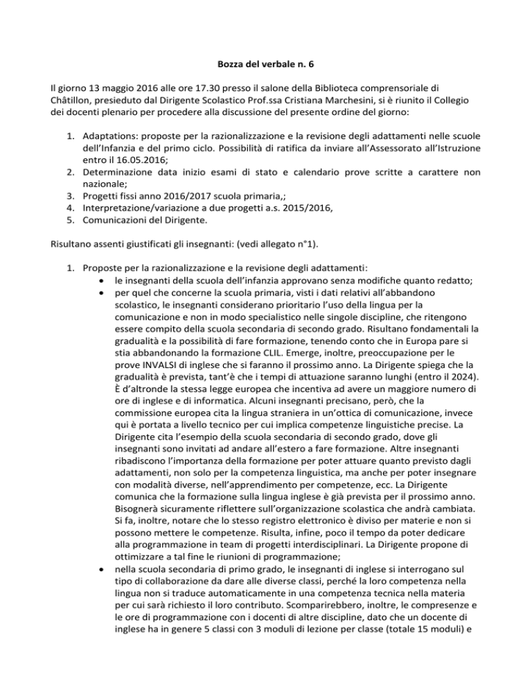 Bozza del verbale n. 6 Il giorno 13 maggio 2016 alle ore 17.30 presso il salone della Biblioteca comprensoriale di Châtillon, presieduto dal Dirigente Scolastico Prof.ssa Cristiana Marchesini, si è riunito il Collegio dei docenti plenario per procedere alla discussione del presente ordine del giorno: 1. Adaptations: proposte per la razionalizzazione e la revisione degli adattamenti nelle scuole dell’Infanzia e del primo ciclo. Possibilità di ratifica da inviare all’Assessorato all’Istruzione entro il 16.05.2016; 2. Determinazione data inizio esami di stato e calendario prove scritte a carattere non nazionale; 3. Progetti fissi anno 2016/2017 scuola primaria,; 4. Interpretazione/variazione a due progetti a.s. 2015/2016, 5. Comunicazioni del Dirigente. Risultano assenti giustificati gli insegnanti: (vedi allegato n°1). 1. Proposte per la razionalizzazione e la revisione degli adattamenti: le insegnanti della scuola dell’infanzia approvano senza modifiche quanto redatto; per quel che concerne la scuola primaria, visti i dati relativi all’abbandono scolastico, le insegnanti considerano prioritario l’uso della lingua per la comunicazione e non in modo specialistico nelle singole discipline, che ritengono essere compito della scuola secondaria di secondo grado. Risultano fondamentali la gradualità e la possibilità di fare formazione, tenendo conto che in Europa pare si stia abbandonando la formazione CLIL. Emerge, inoltre, preoccupazione per le prove INVALSI di inglese che si faranno il prossimo anno. La Dirigente spiega che la gradualità è prevista, tant’è che i tempi di attuazione saranno lunghi (entro il 2024). È d’altronde la stessa legge europea che incentiva ad avere un maggiore numero di ore di inglese e di informatica. Alcuni insegnanti precisano, però, che la commissione europea cita la lingua straniera in un’ottica di comunicazione, invece qui è portata a livello tecnico per cui implica competenze linguistiche precise. La Dirigente cita l’esempio della scuola secondaria di secondo grado, dove gli insegnanti sono invitati ad andare all’estero a fare formazione. Altre insegnanti ribadiscono l’importanza della formazione per poter attuare quanto previsto dagli adattamenti, non solo per la competenza linguistica, ma anche per poter insegnare con modalità diverse, nell’apprendimento per competenze, ecc. La Dirigente comunica che la formazione sulla lingua inglese è già prevista per il prossimo anno. Bisognerà sicuramente riflettere sull’organizzazione scolastica che andrà cambiata. Si fa, inoltre, notare che lo stesso registro elettronico è diviso per materie e non si possono mettere le competenze. Risulta, infine, poco il tempo da poter dedicare alla programmazione in team di progetti interdisciplinari. La Dirigente propone di ottimizzare a tal fine le riunioni di programmazione; nella scuola secondaria di primo grado, le insegnanti di inglese si interrogano sul tipo di collaborazione da dare alle diverse classi, perché la loro competenza nella lingua non si traduce automaticamente in una competenza tecnica nella materia per cui sarà richiesto il loro contributo. Scomparirebbero, inoltre, le compresenze e le ore di programmazione con i docenti di altre discipline, dato che un docente di inglese ha in genere 5 classi con 3 moduli di lezione per classe (totale 15 moduli) e sarà richiesto un modulo di collaborazione CLIL per ognuna delle sue 5 classi (5 moduli), in modo da veder esaurito così il suo monte ore settimanale (20 moduli). Gli insegnanti di scienze rilevano, invece, dei gravi problemi di competenze in lingua inglese, sia da parte degli insegnanti, in quanto quasi nessuno ha studiato inglese a scuola, sia da parte degli alunni. Attualmente, infatti, i ragazzi che provengono dalla scuola primaria hanno un livello di conoscenza dell'inglese troppo limitato per l'impiego di questa lingua in modo veicolare. Potrebbe essere, perciò, al momento eventualmente di loro competenza l'insegnamento di un vocabolario di materia in lingua inglese oppure l’insegnamento di semplici contenuti, rivedendo poi la questione alla luce di un utilizzo maggiore dell'inglese fin dalla scuola primaria. Non si ritiene, pertanto, corretto farne al momento un uso veicolare e far ricadere l’inglese solo su alcune discipline. Infine, si sottolinea che la collaborazione con l’insegnante di inglese non sarà sempre possibile, perché le ore a disposizione non saranno sufficienti, con il rischio che l’insegnante di inglese si riduca a semplice traduttore letterale di contenuti. Il collegio approva all’unanimità le riflessioni e le proposte fatte. Verbale di filone di Matematica e Scienze della scuola secondaria di primo grado dell’Istituzione scolastica Abbé P. Duc di Châtillon del 13/05/2016 RIFLESSIONI IN RELAZIONE AGLI ADATTAMENTI REGIONALI I docenti di matematica e scienze, pur essendo consapevoli che l’offerta formativa della scuola non possa prescindere da una più ampia conoscenza e da un utilizzo più frequente della lingua inglese, ritengono opportuno segnalare alcune criticità in merito ai contenuti del documento relativo agli adattamenti regionali: - Innanzitutto, nella formazione curricolare dei docenti attualmente in servizio nelle varie istituzioni non è mai stata richiesta una competenza linguistica idonea a sviluppare tematiche e contenuti specifici in lingua inglese. Molti dei docenti, inoltre, non hanno mai affrontato, nel percorso di studi, la lingua inglese, mentre altri ne posseggono un livello di conoscenza meramente scolastico, comunque inadeguato ad un utilizzo nella didattica specifica delle scienze. - Prima di rendere esecutiva l’attuazione degli adattamenti, sarebbe opportuno valutare l’effettivo grado di conoscenza della lingua inglese attualmente in possesso dei docenti in servizio. Affinché sia realisticamente attuabile l’obiettivo di raggiungere al più presto un insegnamento in lingua per il 30% del monte ore