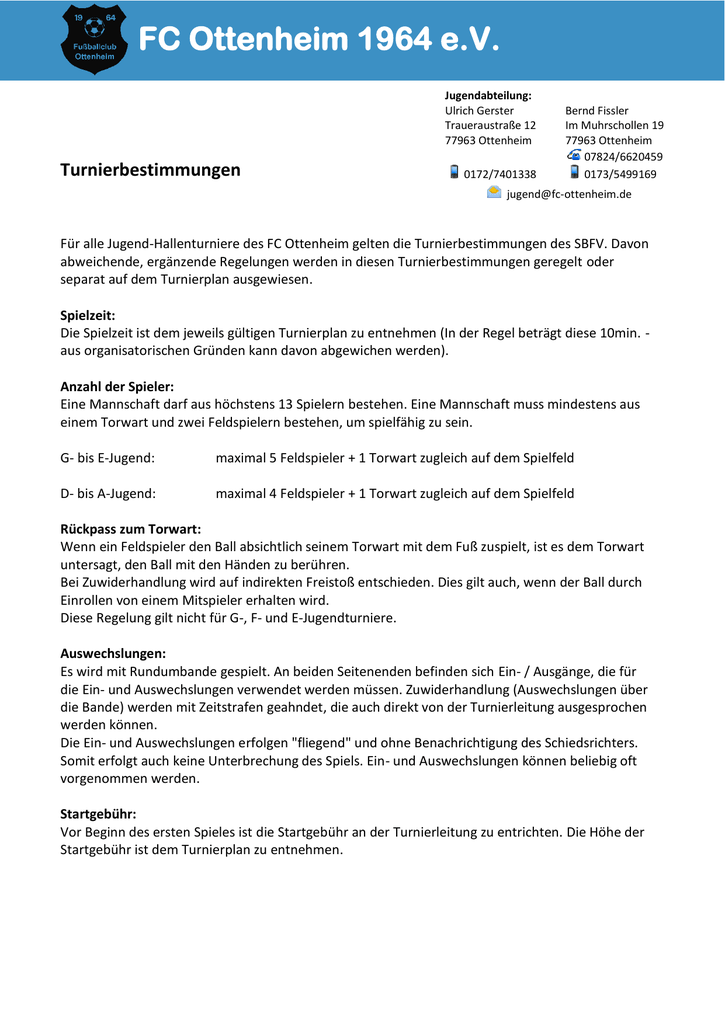 FC FCOttenheim Ottenheim1946 1964e.V. e.V. Jugendabteilung: Ulrich Gerster Traueraustraße 12 77963 Ottenheim Turnierbestimmungen 0172/7401338 Bernd Fissler Im Muhrschollen 19 77963 Ottenheim 07824/6620459 0173/5499169 [email protected] Für alle Jugend-Hallenturniere des FC Ottenheim gelten die Turnierbestimmungen des SBFV. Davon abweichende, ergänzende Regelungen werden in diesen Turnierbestimmungen geregelt oder separat auf dem Turnierplan ausgewiesen. Spielzeit: Die Spielzeit ist dem jeweils gültigen Turnierplan zu entnehmen (In der Regel beträgt diese 10min. aus organisatorischen Gründen kann davon abgewichen werden). Anzahl der Spieler: Eine Mannschaft darf aus höchstens 13 Spielern bestehen. Eine Mannschaft muss mindestens aus einem Torwart und zwei Feldspielern bestehen, um spielfähig zu sein. G- bis E-Jugend: maximal 5 Feldspieler + 1 Torwart zugleich auf dem Spielfeld D- bis A-Jugend: maximal 4 Feldspieler + 1 Torwart zugleich auf dem Spielfeld Rückpass zum Torwart: Wenn ein Feldspieler den Ball absichtlich seinem Torwart mit dem Fuß zuspielt, ist es dem Torwart untersagt, den Ball mit den Händen zu berühren. Bei Zuwiderhandlung wird auf indirekten Freistoß entschieden. Dies gilt auch, wenn der Ball durch Einrollen von einem Mitspieler erhalten wird. Diese Regelung gilt nicht für G-, F- und E-Jugendturniere. Auswechslungen: Es wird mit Rundumbande gespielt. An beiden Seitenenden befinden sich Ein- / Ausgänge, die für die Ein- und Auswechslungen verwendet werden müssen. Zuwiderhandlung (Auswechslungen über die Bande) werden mit Zeitstrafen geahndet, die auch direkt von der Turnierleitung ausgesprochen werden können. Die Ein- und Auswechslungen erfolgen "fliegend" und ohne Benachrichtigung des Schiedsrichters. Somit erfolgt auch keine Unterbrechung des Spiels. Ein- und Auswechslungen können beliebig oft vorgenommen werden. Startgebühr: Vor Beginn des ersten Spieles ist die Startgebühr an der Turnierleitung zu entrichten. Die Höhe der Startgebühr ist dem Turnierplan zu entnehmen. FC FCOttenheim Ottenheim1946 1964e.V. e.V. Abschlag und Abstoß Der Torwart darf den von ihm mit den Händen gehaltenen Ball nur in die eigene Spielhälfte ins Spiel befördern (mit der Hand oder mit dem Fuß). Bei einem Verstoß hiergegen erhält die gegnerische Mannschaft einen indirekten Freistoß auf der Mittellinie. Das gleiche gilt beim Torabstoß, der aus dem Torraum getreten wird. Der Ball ist im Spiel, wenn er den Torraum verlassen hat. Beim Torabstoß haben die gegnerischen Spieler den Torraum zu verlassen. Torerzielung Ein Tor (ausgenommen Eigentor) kann aus nur aus der gegnerischen Spielfeldhälfte erzielt werden. Tor- und Seitenaus: Es wird mit Rundumbande gespielt. Fliegt der Ball über die Bande ins Seitenaus, so wird der Ball eingerollt. Gelangt der Ball hinter die Torauslinie wird das Spiel mit Eckball (bei letzter Ballberührung der verteidigenden Mannschaft) oder Abstoß fortgesetzt. Auf einer Seite wird das Spielfeld durch die Seitenwand der Halle begrenzt. Fliegt der Ball über den ersten Querbalken wird dies als Seitenaus gewertet und die gegnerische Mannschaft rollt den Ball wieder ins Spiel. Fliegt der Ball an die Decke der Halle, so wird an dieser Stelle des Spielfelds das Spiel mit indirektem Freistoß für die gegnerische Mannschaft fortgesetzt. Eckball: Bei Eckball darf der Ball 1 Meter von der Bande entfernt auf der Torlinie zum Eckstoß aufgelegt werden. Modus: Die erstgenannte Mannschaft des gültigen Turnierplans spielt immer von links nach rechts (von der Turnierleitung aus gesehen) und hat Anspiel. Es entscheiden 1. 2. 3. 4. Punkte Torverhältnis Geschossene Tore 9 Meterschiessen Bei Unentschieden in KO-Spielen nach regulärer Spielzeit erfolgt sofort ein 9-Meter-Schießen von jeweils 3 Mitspielern. Endet dieses auch Unentschieden, wird das 9-Meter Schießen im KOVerfahren fortgesetzt, bis ein Sieger ermittelt wurde. Strafen: Wird ein Spieler mit einer roten Karte vom Feld gestellt, so ist er für das ganze Turnier gesperrt. Im laufenden Spiel, in welchem er die rote Karte erhalten hat, kann er nicht ersetzt werden. Jedoch im darauffolgenden. Die Schiedsrichter können darüber hinaus Zeitstrafen (2 Minuten) und gelbe Karten verteilen. Gelb-Rote Karten werden dagegen nur im Seniorenbereich angewendet. FC FCOttenheim Ottenheim1946 1964e.V. e.V. Haftung: Der FC Ottenheim übernimmt keinerlei Haftung für jegliche private Gegenstände in Kabinen, Garderobe oder auf der Tribüne. Bei Sachbeschädigungen an jeglichen Einrichtungen der Sporthalle, vor allem im Kabinentrakt, werden der / die Verursacher zur Haftung herangezogen. Jegliche Beschädigungen werden polizeilich verfolgt. Dazu zählt auch mutwillige Beschädigung der Rundumbande, deren Befestigung, sowie den Toren und Netzen. Der FC Ottenheim appelliert an die Fairness aller teilnehmenden Mannschaften. Danke. Ulrich Gerster Jugendleiter FC Ottenheim Bernd Fissler Die Regeln sind teilweise Auszüge aus AB10 des SBFV.