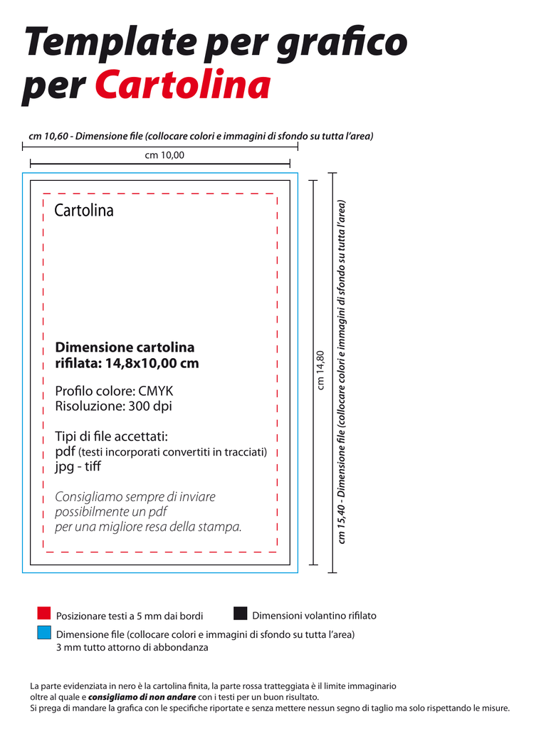Template per grafico per Cartolina cm 10,60 - Dimensione file (collocare colori e immagini di sfondo su tutta l’area) Cartolina cm 14,80 Dimensione cartolina rifilata: 14,8x10,00 cm Profilo colore: CMYK Risoluzione: 300 dpi Tipi di file accettati: pdf (testi incorporati convertiti in tracciati) jpg - tiff Consigliamo sempre di inviare possibilmente un pdf per una migliore resa della stampa. Posizionare testi a 5 mm dai bordi cm 15,40 - Dimensione file (collocare colori e immagini di sfondo su tutta l’area) cm 10,00 Dimensioni volantino rifilato Dimensione file (collocare colori e immagini di sfondo su tutta l’area) 3 mm tutto attorno di abbondanza La parte evidenziata in nero è la cartolina finita, la parte rossa tratteggiata è il limite immaginario oltre al quale e consigliamo di non andare con i testi per un buon risultato. Si prega di mandare la grafica con le specifiche riportate e senza mettere nessun segno di taglio ma solo rispettando le misure.