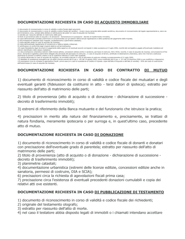 DOCUMENTAZIONE RICHIESTA IN CASO DI ACQUISTO IMMOBILIARE 1) documento di riconoscimento in corso di validità e codice fiscale degli acquirenti; 2) documento di riconoscimento in corso di validità e codice fiscale dei venditori - ovvero visura camerale della società venditrice, documento di riconoscimento del legale rappresentante e, salvo sia amministratore unico, verbale della delibera di attribuzione dei poteri (in caso di acquisto da impresa); 3) estratto per riassunto dell'atto di matrimonio delle parti; 4) titolo di provenienza (atto di acquisto o di donazione - dichiarazione di successione - decreto di trasferimento immobili); 5) copia dell'eventuale contratto preliminare di compravendita con gli estremi dell'avvenuta registrazione e della quietanza del pagamento delle imposte; 6) documentazione catastale (tipo mappale, accatastamento e planimetrie catastali); 7) copia dell'atto pilota (in caso di acquisto da impresa); 8) copia dell'eventuale regolamento di condominio e relative tabelle millesimali; 9) certificazioni di conformità degli impianti elettrico ed termoidraulico; 10) copie fotostatiche degli strumenti di pagamento della caparra e di eventuali acconti corrisposti in data successiva al 4 luglio 2006, nonchè del corrispettivo pagato all'eventuale mediatore ed estremi identificativi dello stesso mediatore; 11) documentazione urbanistica (estremi delle licenze edilizie, concessioni edilizie anche in sanatoria, permessi di costruire, DIA e SCIA, nonchè, in caso di acquisto da impresa, comunicazione di fine lavori, domanda di agibilità e planimetrie allegate alla domanda del permesso di costruire) ; in caso di acquisto di terreni, certificato di destinazione urbanistica, salvo che il terreno costituisca pertinenza di porzioni di edificio urbano e sia di superficie inferiore a 5.000 metri quadrati; 12) polizza decennale (in caso di acquisto da impresa), se immobile costruito in virtù di permesso di costruire richiesto successivamente al 21 luglio 2005; 13) attestato di prestazione energetica per gli edifici previsti previsti dal D.Lgs n. 192 del 19 agosto 2005, come modificato dal D.Lgs. n. 311 del 29 dicembre 2006 e sue modifiche e integrazioni; 14) precisazioni circa la richiesta di agevolazioni fiscali: prima casa (e in caso di sussistenza di credito di imposta: copie dell'atto di acquisto e dell'atto di vendita) - 50% del costo di costruzione dell'autorimessa (in caso di acquisto da impresa). DOCUMENTAZIONE RICHIESTA IN CASO DI CONTRATTO DI MUTUO 1) documento di riconoscimento in corso di validità e codice fiscale dei mutuatari e degli eventuali garanti (fideiussori da costituirsi in atto - terzi datori di ipoteca); estratto per riassunto dell'atto di matrimonio delle parti; 2) titolo di provenienza (atto di acquisto o di donazione - dichiarazione di successione decreto di trasferimento immobili); 3) estremi di riferimento della Banca mutuante e del funzionario che istruisce la pratica; 4) precisazioni in merito alla natura del finanziamento e, precisamente, se trattasi di natura fondiaria, meramente ipotecaria o per surroga e, in quest'ultimo caso, precedente atto di mutuo. DOCUMENTAZIONE RICHIESTA IN CASO DI DONAZIONE 1) documento di riconoscimento in corso di validità e codice fiscale di donanti e donatari con precisazione dell'eventuale grado di parentela; estratto per riassunto dell'atto di matrimonio delle parti; 2) titolo di provenienza (atto di acquisto o di donazione - dichiarazione di successione decreto di trasferimento immobili); 3) planimetrie catastali; 4) documentazione urbanistica (estremi delle licenze edilizie, concessioni edilizie anche in sanatoria, permessi di costruire, DIA e SCIA); 6) precisazioni circa la richiesta di agevolazioni fiscali prima casa; 7) precisazione circa l'esistenza di eventuali precedenti donazioni cumulabili e copia dei relativi atti ove esistenti. DOCUMENTAZIONE RICHIESTA IN CASO DI PUBBLICAZIONE DI TESTAMENTO 1) 2) 3) 4) documento di riconoscimento in corso di validità e codice fiscale dei richiedenti; originale del testamento olografo; estratto per riassunto dell'atto di morte. nel caso il testatore abbia disposto legati di immobili o i chiamati intendano accettare espressamente l’eredità, dati catastali degli immobili oggetto di disposizione testamentaria; 5) dati anagrafici e residenza dei beneficiari delle disposizioni testamentarie. DOCUMENTAZIONE RICHIESTA IN CASO DI PRATICHE SUCCESSORIE 1) certificato di morte del defunto; 2) documento di riconoscimento e codice fiscale del defunto e dei successori; 3) stato di famiglia del defunto e dei successori alla data del decesso, ovvero dichiarazione sostitutiva dell'atto di notorietà recante tali informazioni; 4) certificazione dei rapporti del defunto con istituti di credito (posizione bancaria del defunto alla data del decesso: depositi; conti correnti; dossier titoli con valorizzazione al netto della componente dei titoli di Stato); 5) visure catastali e titoli di provenienza degli immobili caduti in successione; 6) elenco e valore di eventuali partecipazioni in società o di aziende di titolarità del defunto; 7) eventuale verbale di pubblicazione di testamento olografo o di richiesta di registrazione di testamento pubblico; 8) eventuale verbale di apertura di cassette di sicurezza; 9) indicazione di eventuali passività facenti capo al defunto o funerarie e relativa documentazione; 10) indicazione delle eventuali precedenti liberalità effettuate in vita dal defunto in favore di eredi e legatari e del relativo valore; copia dei relativi atti. DOCUMENTAZIONE RICHIESTA IN CASO DI CONVENZIONI MATRIMONIALI 1) documento di riconoscimento in corso di validità e codice fiscale dei coniugi; 2) estratto per riassunto dell'atto di matrimonio; 3) titoli di provenienza degli immobili (se la convenzione produce effetti su beni immobili, ad esempio in caso di costituzione di fondo patrimoniale). DOCUMENTAZIONE RICHIESTA IN CASO DI COSTITUZIONE DI SOCIETA' DI PERSONE 1) docu