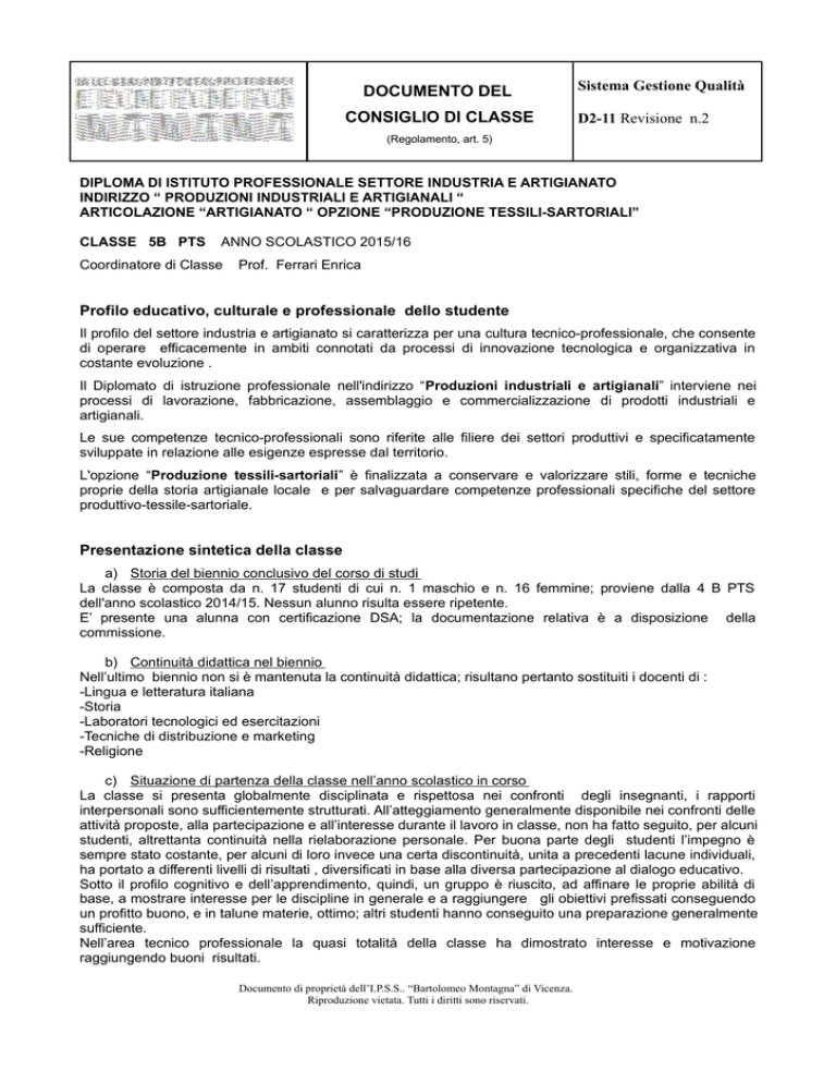 DOCUMENTO DEL CONSIGLIO DI CLASSE Sistema Gestione Qualità D2-11 Revisione n.2 (Regolamento, art. 5) DIPLOMA DI ISTITUTO PROFESSIONALE SETTORE INDUSTRIA E ARTIGIANATO INDIRIZZO “ PRODUZIONI INDUSTRIALI E ARTIGIANALI “ ARTICOLAZIONE “ARTIGIANATO “ OPZIONE “PRODUZIONE TESSILI-SARTORIALI” CLASSE 5B PTS ANNO SCOLASTICO 2015/16 Coordinatore di Classe Prof. Ferrari Enrica Profilo educativo, culturale e professionale dello studente Il profilo del settore industria e artigianato si caratterizza per una cultura tecnico-professionale, che consente di operare efficacemente in ambiti connotati da processi di innovazione tecnologica e organizzativa in costante evoluzione . Il Diplomato di istruzione professionale nell'indirizzo “Produzioni industriali e artigianali” interviene nei processi di lavorazione, fabbricazione, assemblaggio e commercializzazione di prodotti industriali e artigianali. Le sue competenze tecnico-professionali sono riferite alle filiere dei settori produttivi e specificatamente sviluppate in relazione alle esigenze espresse dal territorio. L'opzione “Produzione tessili-sartoriali” è finalizzata a conservare e valorizzare stili, forme e tecniche proprie della storia artigianale locale e per salvaguardare competenze professionali specifiche del settore produttivo-tessile-sartoriale. Presentazione sintetica della classe a) Storia del biennio conclusivo del corso di studi La classe è composta da n. 17 studenti di cui n. 1 maschio e n. 16 femmine; proviene dalla 4 B PTS dell'anno scolastico 2014/15. Nessun alunno risulta essere ripetente. E’ presente una alunna con certificazione DSA; la documentazione relativa è a disposizione della commissione. b) Continuità didattica nel biennio Nell’ultimo biennio non si è mantenuta la continuità didattica; risultano pertanto sostituiti i docenti di : -Lingua e letteratura italiana -Storia -Laboratori tecnologici ed esercitazioni -Tecniche di distribuzione e marketing -Religione c) Situazione di partenza della classe nell’anno scolastico in corso La classe si presenta globalmente disciplinata e rispettosa nei confronti degli insegnanti, i rapporti interpersonali sono sufficientemente strutturati. All’atteggiamento generalmente disponibile nei confronti delle attività proposte, alla partecipazione e all’interesse durante il lavoro in classe, non ha fatto seguito, per alcuni studenti, altrettanta continuità nella rielaborazione personale. Per buona parte degli studenti l’impegno è sempre stato costante, per alcuni di loro invece una certa discontinuità, unita a precedenti lacune individuali, ha portato a differenti livelli di risultati , diversificati in base alla diversa partecipazione al dialogo educativo. Sotto il profilo cognitivo e dell’apprendimento, quindi, un gruppo è riuscito, ad affinare le proprie abilità di base, a mostrare interesse per le discipline in generale e a raggiungere gli obiettivi prefissati conseguendo un profitto buono, e in talune materie, ottimo; altri studenti hanno conseguito una preparazione generalmente sufficiente. Nell’area tecnico professionale la quasi totalità della classe ha dimostrato interesse e motivazione raggiungendo buoni risultati. Documento di proprietà dell’I.P.S.S.. “Bartolomeo Montagna” di Vicenza. Riproduzione vietata. Tutti i diritti sono riservati. DOCUMENTO DEL CONSIGLIO DI CLASSE Sistema Gestione Qualità D2-11 Revisione n.2 (Regolamento, art. 5) Obiettivi generali (educativi e formativi) Nel corso del presente anno scolastico la maggioranza degli alunni ha consolidato la capacità di: leggere, capire e riassumere testi relativi alle diverse discipline lavorare con metodo lavorare in gruppo raccogliere, classificare, rielaborare e rappresentare dati con disegni, schemi, grafici e diagrammi relazionare su interventi ed attività discutendo un argomento con sufficiente chiarezza espositiva e corretto utilizzo della terminologia specifica individuare sequenze logiche operando collegamenti, confronti ed astrazioni semplici all’interno di una stessa disciplina e tra discipline diverse Conoscenze, competenze e capacità Per gli obiettivi cognitivi specifici si rimanda alle relazioni finali dei docenti della singole discipline (All. A) ASL/ORIENTAMENTO: Periodo stage : 08 giugno 2015 - 03 luglio 2015: ore stage 160 in aziende settore Moda 15 ottobre 2015 04 febbraio 2016 08 marzo 2016 19 marzo 2016 08 aprile 2016 Giornata dell’Università incontro con dott. C. Nardi ‘ La contrattualistica sul lavoro’ incontro con esperti ufficio politiche per il lavoro Comune di Vicenza incontro sulla formazione ‘Privacy’, tenuta dalla prof.ssa Francesca Nisticò incontro con il dott Matteo Cozza titolare ditta TAM (progettazione di una collezione di moda) e incontro con dott.ssa Gelaini Barbara “Mondo del Lavoro” La classe ha partecipato alle iniziative della rete scolastica “Orienta-insieme”, nello specifico a lezioni universitarie tenute da professori degli Atenei veneti nella Cittadella degli studi. Le alunne sono stati informate dei vari open day organizzati dalle università del Veneto e, a seconda dell’interesse personale, incoraggiati a parteciparvi. Sono stati altresì informati delle date dei test d’ingresso alle varie facoltà. FORMAZIONE RISCHIO SPECIFICO: Corso di Formazione Dlgs.81/08 : rischio specifico 20/01/2016 ore 2 28/01/2016 ore 2 03/02/2016 ore 2 04/02/2016 ore 2 INCONTRI E ALTRE ATTIVITÀ 09 febbraio 2016 Rappresentazione teatrale ‘La battaglia dei Pedali- Un ragazzo contro vento’ c/o teatro Astra di Vicenza per la Giornata della Memoria 23 febbraio 2016 Reading sulla I Guerra Mondiale ‘Nessuna guerra è grande: le donne nella I Guerra Mondiale’ 16 marzo 2016 Incontri con la Caritas Diocesana Vicentina sulle povertà estreme, immigrati e senza fissa dimora 23 marzo 2016 “Europa e Africa: dal colonialismo europeo all’immigrazione di massa” prof Sergio Laverda Documento di proprietà dell’I.P.S.S.. “B