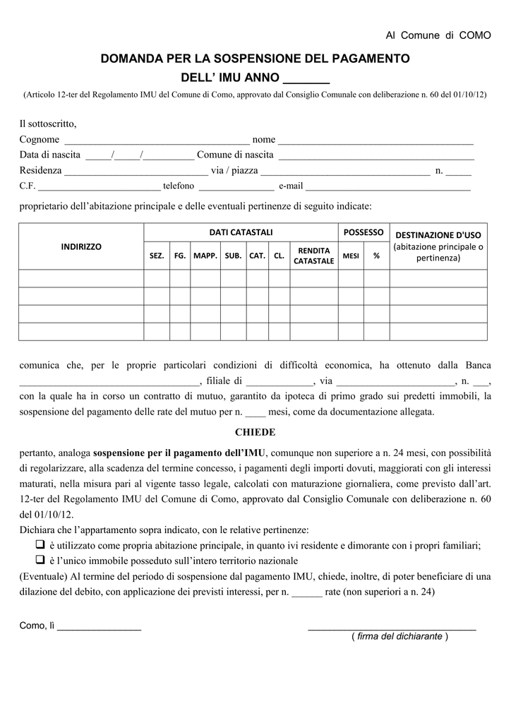 Domanda per sospensione pagamento IMU