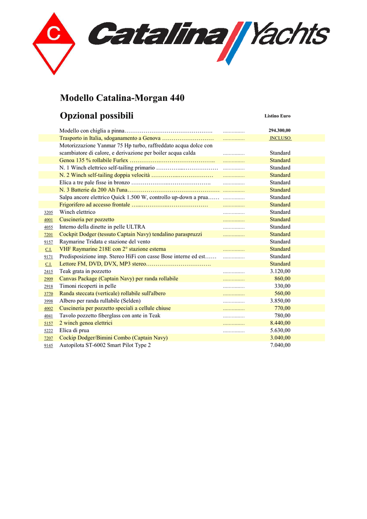 Modello Catalina-Morgan 440 Opzional possibili 3205 4001 4055 7201 9157 C.I. 9171 C.I. 2415 2909 2918 3770 3998 4002 4041 5157 5222 7207 9145 Modello con chiglia a pinna………………………………………. …………… Trasporto in Italia, sdoganamento a Genova ……………………… …………… Motorizzazione Yanmar 75 Hp turbo, raffreddato acqua dolce con scambiatore di calore, e derivazione per boiler acqua calda …………… Genoa 135 % rollabile Furlex …………….……………………….. …………… N. 1 Winch elettrico self-tailing primario …………...……………… …………… N. 2 Winch self-tailing doppia velocità …………...……………… …………… Elica a tre pale fisse in bronzo ………………..…………………. …………… N. 3 Batterie da 200 Ah l'una………………………………………………. …………… Salpa ancore elettrico Quick 1.500 W, controllo up-down a prua…… …………… …………… Frigorifero ad accesso frontale …...…………..………………… Winch elettrico …………… Cuscineria per pozzetto …………… Interno della dinette in pelle ULTRA …………… Cockpit Dodger (tessuto Captain Navy) tendalino paraspruzzi …………… Raymarine Tridata e stazione del vento VHF Raymarine 218E con 2° stazione esterna …………… Predisposizione imp. Stereo HiFi con casse Bose interne ed est…… …………… Lettore FM, DVD, DVX, MP3 stereo……………………………. Teak grata in pozzetto …………… Canvas Package (Captain Navy) per randa rollabile …………… Timoni ricoperti in pelle …………… Randa steccata (verticale) rollabile sull'albero …………… Albero per randa rullabile (Selden) …………… Cuscineria per pozzetto speciali a cellule chiuse …………… Tavolo pozzetto fiberglass con ante in Teak …………… 2 winch genoa elettrici …………… Elica di prua …………… Cockip Dodger/Bimini Combo (Captain Navy) Autopilota ST-6002 Smart Pilot Type 2 Listino Euro 294.300,00 INCLUSO Standard Standard Standard Standard Standard Standard Standard Standard Standard Standard Standard Standard Standard Standard Standard Standard 3.120,00 860,00 330,00 560,00 3.850,00 770,00 780,00 8.440,00 5.630,00 3.040,00 7.040,00