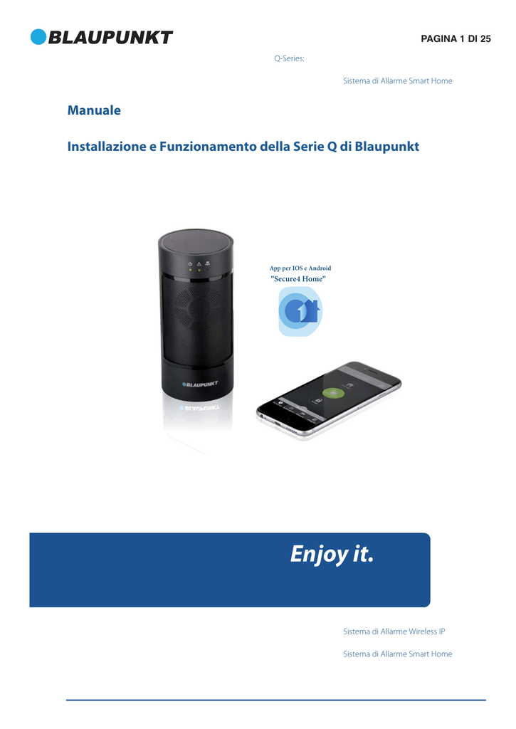PAGINA 1 DI 25 Q-Series: Sistema di Allarme Smart Home Manuale Installazione e Funzionamento della Serie Q di Blaupunkt App per IOS e Android “Secure4 Home“ Enjoy it. Sistema di Allarme Wireless IP Sistema di Allarme Smart Home PAGINA 2 DI 25 Sommario 1. Introduzione e Registrazione 1.1. Risoluzione dei problemi durante o dopo la registrazione 1.2. Conferma della Registrazione 2. Espansione del Sistema di Sicurezza 3. Montaggio dei Dispositivi 3.1. Consigli generali per il montaggio dei dispositivi 3.2. Prima del montaggio: Test della trasmissione del segnale 3.3. Protezione Tamper (antimanomissione) 3.4. Pianificazione della Localizzazione dei Dispositivi 4. Funzionamento della Serie Q :Server Home Connect. 4.1. Sicurezza 4.1.1. Sensori 4.1.2. Elenco Videocamere IP 4.2. Automazione 4.2.1. Dispositivi 4.3. Gruppo 4.4. Scenari 4.4.1. Creare uno Scenario 4.4.2. Applicare uno Scenario 4.4.3. Modificare uno Scenario 4.4.4. Sopprimere uno Scenario 4.5. Live-Video 4.6. Evento PAGINA 3 DI 25 4.7. Impostazioni 4.8. Impostazioni del Pannello di Controllo 4.8.1. Impostazioni Generali 4.8.2. Impostazioni Modalità Home Arm e Modalità Away Arm 4.8.3. Impostazioni Temperatura (é necessario un Sensore di Temperatura) 4.8.4. Programmazione della Sirena 4.8.5. Codici PIN Utente 4.9. Impostazioni Report 4.10. Conto 4.11. Servizio e Pagamenti 5. Funzionamento della Applicazione Secure4Home. 5.1. Login 5.2. Sicurezza 5.3. Automazione 5.4. Live-Video 5.5. Evento 5.6. Conto Utente 6. Risoluzione dei problemi e Ripristino dei valori di fabbrica 6.1. Pannello di Controllo 6.2. Sensore PIR 6.3. Rilevatore Porta 6.4. Ripristino dei valori di fabbrica 7. Specifiche tecniche 8. Dichiarazione di Conformi PAGINA 4 DI 25 Le informazioni e illustrazioni di questo documento sono soggette a modifica senza preavviso. Blaupunkt si riserva il diritto di modificare le caratteristiche dei prodotti senza previo avviso. . 1.Introduzione e Registrazione Il presente documento contiene informazioni utili per l’installazione ed uso del nostro sistema di allarme Serie Q ed i suoi dispositivi accessori. Per ulteriore informazione sulla registrazione e funzionamento del Sistema, accedere gratuitamente al Blaupunkt Home Connect cloud server e scaricare dalla home page l’ App Secure4Home su Google Play o l’Apple Store. IMPORTANTE: Si prega di leggere prima la Guida di Avvio Rapido inclusa in questo kit. Questa guida contiene informazione importante relativa al primo utilizzo dei prodotti della Serie Q. 1.1. Risoluzione dei problemi durante o dopo la registrazione Se riceve un messaggio di errore o se si verifica un problema durante o dopo la registrazione, la seguente informazione può essere utile: Errore Connessione Server: Il Pannello di Controllo non é connesso al server. O ll Pannello di Controllo é spento o non è collegato ad internet. Si prega di verificare in primo luogo l’alimentazione elettrica e lo stato della rete. . Nel caso che il Pannello di Controllo é in errore per un codice infetto o virus, si prega di verificare l’impostazione del firewall, assicurarsi che la porta TCP 5222 sia aperta e appaia sulla lista dell’ eccezioni del suo firewall. . Verificare l’impostazione del filtraggio dei indirizzi MAC del suo router ed assicurarsi che l’indirizzo MAC del suo pannello di controllo sia autorizzato sul suo router. . Se adopera una connessione internet dial-up, assicurarsi che il suo router supporta la funzione PPPoE ADSL. Tempo di Registrazione Scaduto: Il Pannello di Controllo non ha completato la registrazione durante i primi 15 minuti della connessione al server. Si prega di spegnere il Pannello di Controllo ed accenderlo di nuovo. Indirizzo MAC non valido: Ogni indirizzo MAC può essere registrato una volta sola. Nel caso contrario, un messaggio di errore appare sullo schermo. Se Lei è il propietario del Pannello di Controllo ed è sicuro che non è mai stato registrato prima, contattare lo staff dell’ assistenza Blaupunkt. PAGINA 5 DI 25 NOTA: Il Server Home Connect funziona in modo ottimale utilizzando un Browser Firefox . Usare un router LTE od un adattatore Powerline può causare problemi. 1.2. Conferma della Registrazione Dopo avere inserito tutti i dati richiesti ed avere scelto il pacchetto servizio desiderato (riferisi al Capitolo 4.11), il server invia un messaggio di conferma all’indirizzo di posta elettronica preregistrato sul suo conto. Procedere al log in nel server usando il nome utente e la password appena registrati. La registrazione é ora completata. Se non riceve la email di conferma, verificare l’indirizzo di posta elettronica inserito sul conto e modificarlo se necessario. 2. Espansione del Sistema di Sicurezza E possibile migliorare le capacità del suo Sistema di Allarme Smart Home abbinando sensori ed altri dispositivi (come illustrato nell’immagine sotto). Oltre ai dispositivi già presenti nel kit, é possibile migliore ulteriormente le capacità del suo sistema di allarme comperando altri accessori da abbinare. Accessori come un’ altro Sensore PIR o Rilevatore Porta per estendere la zona da proteggere; un Controllo Remoto per una seconda piattaforma di funzionamento del sistema; un Rilevatore di Fumo per una protezione antiincendio; un Sensore di Temperatura per un aggiornamento della temperatura; altri Interruttori di Alimentazione per domotica ed una gestione razionale dell'energia. Per ulteriore informazione per abbinare nuovi dispositivi al sistema, riferirsi alle pagine web di assistenza Blaupunkt sul sito www.blaupunkt.com. Pannello di controllo: Communicazione via segnale radio con i dispositivi e sensori Rilevatore di Movimento Wireless con Telecamera PIR: Installato in spazi aperti per rilevare eventuali movimenti di intrusione. Commutatore Smart Home: Accensione e visualizzazione del consumo energetico dei dispositivi elettrici da qualsiasi luogo. Telecamera: Visualizzazione in tempo reale di casa. Rilevatore Porta/Finestra: Installazione rapida 