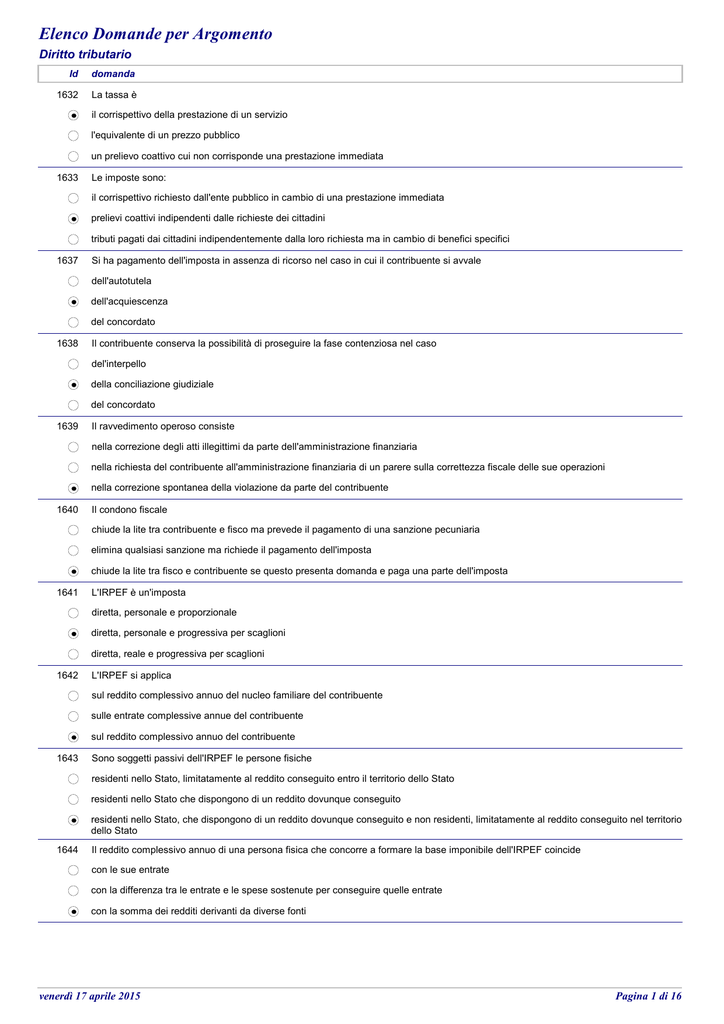 Elenco Domande per Argomento Diritto tributario Id domanda 1632 La tassa è il corrispettivo della prestazione di un servizio l'equivalente di un prezzo pubblico un prelievo coattivo cui non corrisponde una prestazione immediata 1633 Le imposte sono: il corrispettivo richiesto dall'ente pubblico in cambio di una prestazione immediata prelievi coattivi indipendenti dalle richieste dei cittadini tributi pagati dai cittadini indipendentemente dalla loro richiesta ma in cambio di benefici specifici 1637 Si ha pagamento dell'imposta in assenza di ricorso nel caso in cui il contribuente si avvale dell'autotutela dell'acquiescenza del concordato 1638 Il contribuente conserva la possibilità di proseguire la fase contenziosa nel caso del'interpello della conciliazione giudiziale del concordato 1639 Il ravvedimento operoso consiste nella correzione degli atti illegittimi da parte dell'amministrazione finanziaria nella richiesta del contribuente all'amministrazione finanziaria di un parere sulla correttezza fiscale delle sue operazioni nella correzione spontanea della violazione da parte del contribuente 1640 Il condono fiscale chiude la lite tra contribuente e fisco ma prevede il pagamento di una sanzione pecuniaria elimina qualsiasi sanzione ma richiede il pagamento dell'imposta chiude la lite tra fisco e contribuente se questo presenta domanda e paga una parte dell'imposta 1641 L'IRPEF è un'imposta diretta, personale e proporzionale diretta, personale e progressiva per scaglioni diretta, reale e progressiva per scaglioni 1642 L'IRPEF si applica sul reddito complessivo annuo del nucleo familiare del contribuente sulle entrate complessive annue del contribuente sul reddito complessivo annuo del contribuente 1643 Sono soggetti passivi dell'IRPEF le persone fisiche residenti nello Stato, limitatamente al reddito conseguito entro il territorio dello Stato residenti nello Stato che dispongono di un reddito dovunque conseguito residenti nello Stato, che dispongono di un reddito dovunque conseguito e non residenti, limitatamente al reddito conseguito nel territorio dello Stato 1644 Il reddito complessivo annuo di una persona fisica che concorre a formare la base imponibile dell'IRPEF coincide con le sue entrate con la differenza tra le entrate e le spese sostenute per conseguire quelle entrate con la somma dei redditi derivanti da diverse fonti venerdì 17 aprile 2015 Pagina 1 di 16 Diritto tributario Id 1645 domanda Sono esonerati dalla dichiarazione dei redditi gli artisti e professionisti qualora non abbiano conseguito redditi i titolari di imprese commerciali che hanno avuto delle perdite i lavoratori dipendenti da un unico datore di lavoro che non possiedono altri redditi 1646 L'acconto di IRPEF è pari a una data percentuale dellla differenza della dichiarazione relativa ai redditi dell'anno precedente dell'imposta netta dell'imposta lorda 1647 Il saldo d'imposta è dato dalla differenza tra l'imposta netta e il totale delle ritenute e crediti dalla sostituzione tra la differenza dell'imposta netta e il totale delle ritenute e crediti e l'acconto d'imposta dalla differenza tra un credito e un debito IRPEF 1656 Sono soggetti all'imposta di bollo fin dall'origine i titoli del debito pubblico e i libretti di risparmio gli atti di accertamento e gli atti di riscossione dei tributi gli atti delle società, gli atti notarili, gli atti e contratti privati 1657 L'imposta di bollo è riscossa in modo ordinario quando il contribuente applica sull'atto o documento le marche da bollo annullandole nei modi previsti dalla legge richiede all'Amministrazione finanziaria l'applicazione sull'atto o documento del bollo a punzone fa uso di carta da bollo per atti e documenti o di appositi moduli bollati per le cambiali 1658 L'imposta di bollo è proporzionale per gli atti costitutivi di società ed enti per le cambiali per le ricevute superiori a un certo importo 1659 L'imposta di bollo è fissa per gli atti rogati da notai relativi a diritti su immobili per gli assegni circolari per le cambiali 1664 La conciliazione giudiziale consente al contribuente di patteggiare l'imponibile anche prima di avere ricevuto l'accertamento di recedere dal secondo grado del giudizio di mettere fine a una controversia già avviata presso la commissione tributaria provinciale 1665 Il contribuente che ha subito un controllo da parte dell'Amministrazione finanziaria può patteggiare l'imponibile ricorrendo alla conciliazione giudiziale all'autotutela al concordato 1669 Costituisce un presupposto del ravvedimento operoso il fatto che il contribuente non sia stato oggetto di attività di accertamento abbia fatto richiesta di interpello abbia ricevuto dall'amministrazione un processo verbale 1670 Il contenzioso con il fisco si chiude definitivamente con la conciliazione giudiziale il concordato l'interpello venerdì 17 aprile 2015 Pagina 2 di 16 Diritto tributario Id 1671 domanda Il redditto dominicale dei terreni è il reddito che deriva dal possesso di terreni atti alla produzione agricola che un imprenditore agricolo trae effettivamente da un terreno che deriva dall'esercizio dell'attività di impresa agricola su un terreno 1672 Il reddito agrario che concorre a formare la base imponibile dell'IRPEF è il reddito che un proprietario può trarre dall'affitto di un terreno che un proprietario può trarre dalla coltivazione diretta di un terreno medio ordinario che un imprenditore agricolo trae da un terreno 1674 Non costituiscono redditi di capitale i redditi derivanti dalla partecipazione a società di capitali dall'esercizio di imprese commerciali da titoli del debito pubblico 1675 Nel registro contabile-finanziario artisti e professionisti devono annotare le spese inerenti l'esercizio dell'arte e della professione i compensi percepiti nell'esercizio dell'arte e della professione costi, ricavi, movimenti di cassa e del conto corrente bancario relativi all'esercizio dell'attività 1676 Il regime della contabilità semplificata di artist
