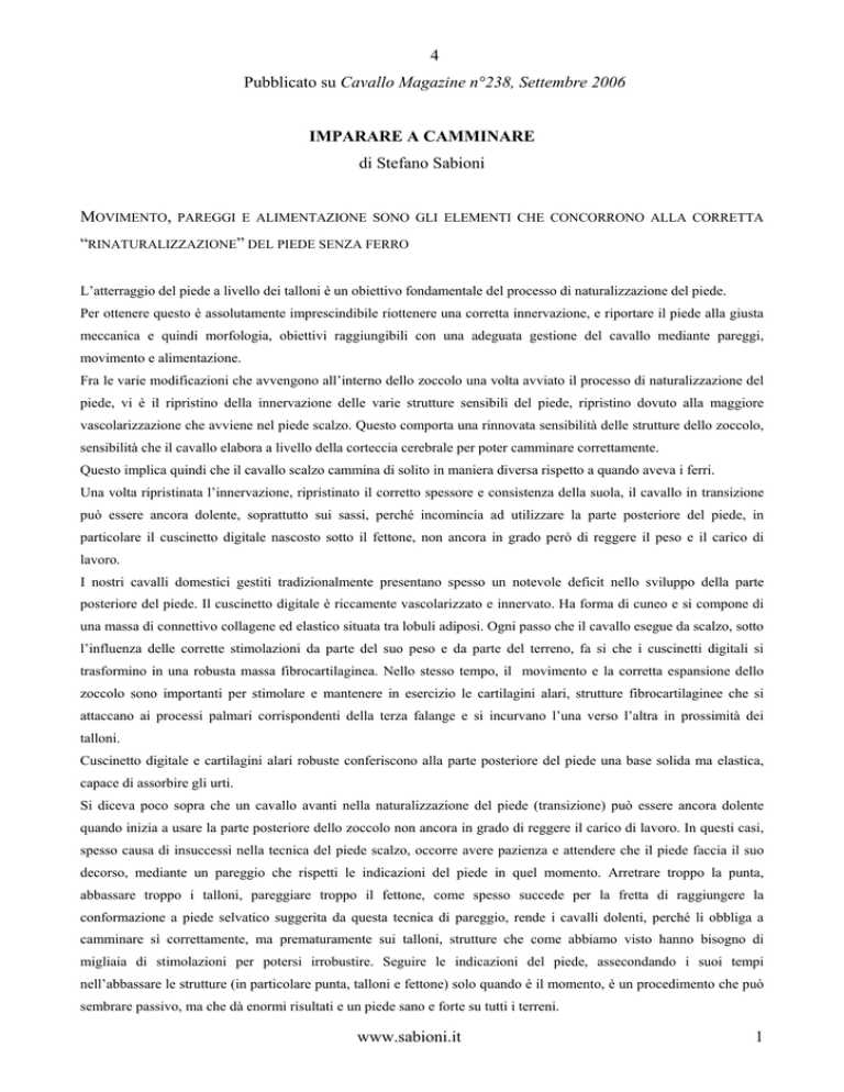 4 Pubblicato su Cavallo Magazine n°238, Settembre 2006 IMPARARE A CAMMINARE di Stefano Sabioni MOVIMENTO, PAREGGI E ALIMENTAZIONE SONO GLI ELEMENTI CHE CONCORRONO ALLA CORRETTA “RINATURALIZZAZIONE” DEL PIEDE SENZA FERRO L’atterraggio del piede a livello dei talloni è un obiettivo fondamentale del processo di naturalizzazione del piede. Per ottenere questo è assolutamente imprescindibile riottenere una corretta innervazione, e riportare il piede alla giusta meccanica e quindi morfologia, obiettivi raggiungibili con una adeguata gestione del cavallo mediante pareggi, movimento e alimentazione. Fra le varie modificazioni che avvengono all’interno dello zoccolo una volta avviato il processo di naturalizzazione del piede, vi è il ripristino della innervazione delle varie strutture sensibili del piede, ripristino dovuto alla maggiore vascolarizzazione che avviene nel piede scalzo. Questo comporta una rinnovata sensibilità delle strutture dello zoccolo, sensibilità che il cavallo elabora a livello della corteccia cerebrale per poter camminare correttamente. Questo implica quindi che il cavallo scalzo cammina di solito in maniera diversa rispetto a quando aveva i ferri. Una volta ripristinata l’innervazione, ripristinato il corretto spessore e consistenza della suola, il cavallo in transizione può essere ancora dolente, soprattutto sui sassi, perché incomincia ad utilizzare la parte posteriore del piede, in particolare il cuscinetto digitale nascosto sotto il fettone, non ancora in grado però di reggere il peso e il carico di lavoro. I nostri cavalli domestici gestiti tradizionalmente presentano spesso un notevole deficit nello sviluppo della parte posteriore del piede. Il cuscinetto digitale è riccamente vascolarizzato e innervato. Ha forma di cuneo e si compone di una massa di connettivo collagene ed elastico situata tra lobuli adiposi. Ogni passo che il cavallo esegue da scalzo, sotto l’influenza delle corrette stimolazioni da parte del suo peso e da parte del terreno, fa si che i cuscinetti digitali si trasformino in una robusta massa fibrocartilaginea. Nello stesso tempo, il movimento e la corretta espansione dello zoccolo sono importanti per stimolare e mantenere in esercizio le cartilagini alari, strutture fibrocartilaginee che si attaccano ai processi palmari corrispondenti della terza falange e si incurvano l’una verso l’altra in prossimità dei talloni. Cuscinetto digitale e cartilagini alari robuste conferiscono alla parte posteriore del piede una base solida ma elastica, capace di assorbire gli urti. Si diceva poco sopra che un cavallo avanti nella naturalizzazione del piede (transizione) può essere ancora dolente quando inizia a usare la parte posteriore dello zoccolo non ancora in grado di reggere il carico di lavoro. In questi casi, spesso causa di insuccessi nella tecnica del piede scalzo, occorre avere pazienza e attendere che il piede faccia il suo decorso, mediante un pareggio che rispetti le indicazioni del piede in quel momento. Arretrare troppo la punta, abbassare troppo i talloni, pareggiare troppo il fettone, come spesso succede per la fretta di raggiungere la conformazione a piede selvatico suggerita da questa tecnica di pareggio, rende i cavalli dolenti, perché li obbliga a camminare sì correttamente, ma prematuramente sui talloni, strutture che come abbiamo visto hanno bisogno di migliaia di stimolazioni per potersi irrobustire. Seguire le indicazioni del piede, assecondando i suoi tempi nell’abbassare le strutture (in particolare punta, talloni e fettone) solo quando è il momento, è un procedimento che può sembrare passivo, ma che dà enormi risultati e un piede sano e forte su tutti i terreni. www.sabioni.it 1 Ma quali sono i vantaggi di un atterraggio di talloni? Prima di tutto si deve ricordare che è la Natura che ha provveduto a questo, fornendo al piede strutture adeguate nella sua parte posteriore: tutti i cavalli le hanno, e tutti i cavalli sono nati per atterrare di talloni! Non sempre però nei cavalli domestici gestiti tradizionalmente questo succede. Ogni aspetto della funzionalità del piede migliora quando lo zoccolo atterra di tallone. La muraglia si flette in modo regolare, si ottiene la miglior circolazione sanguigna all’interno dello zoccolo, avvengono consumi più regolari. Per il benessere del cavallo e la prevenzione di futuri problemi, questo tipo di impatto sollecita molto meno tendini, legamenti e articolazioni dell’arto in quanto prima dell’appoggio al suolo si ha già la piena estensione delle articolazioni, estensione che non deve quindi avvenire bruscamente come quando il piede viene caricato se atterrasse di punta. Il movimento del cavallo diventa ampio e leggero. Concludendo quindi, una delle priorità del pareggio naturale dovrebbe essere l’atterraggio di tallone. Se si riesce ad ottenerlo, si hanno un piede ed un cavallo estremamente equilibrati ed eleganti, se invece si ottiene un piede morfologicamente bello ma il cavallo manifesta un passo raccorciato e un atterraggio non di tallone, il proseguimento nella naturalizzazione sarà difficoltoso e senza progressi. www.sabioni.it 2