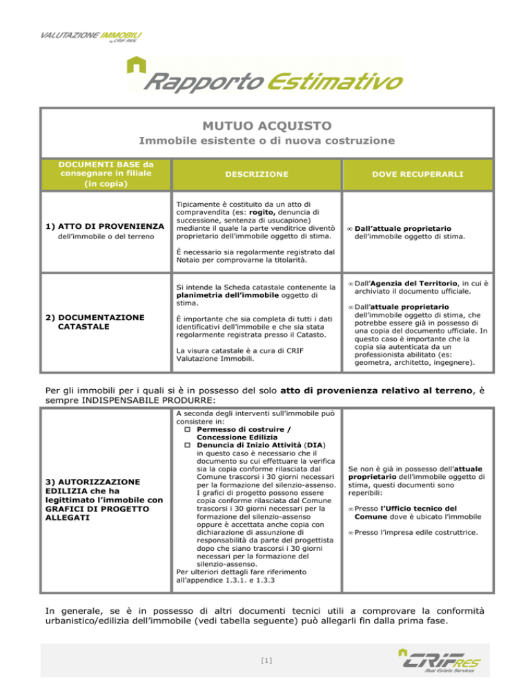 MUTUO ACQUISTO Immobile esistente o di nuova costruzione DOCUMENTI BASE da consegnare in filiale (in copia) 1) ATTO DI PROVENIENZA dell’immobile o del terreno DESCRIZIONE Tipicamente è costituito da un atto di compravendita (es: rogito, denuncia di successione, sentenza di usucapione) mediante il quale la parte venditrice diventò proprietario dell’immobile oggetto di stima. DOVE RECUPERARLI • Dall’attuale proprietario dell’immobile oggetto di stima. È necessario sia regolarmente registrato dal Notaio per comprovarne la titolarità. Si intende la Scheda catastale contenente la planimetria dell’immobile oggetto di stima. 2) DOCUMENTAZIONE CATASTALE È importante che sia completa di tutti i dati identificativi dell’immobile e che sia stata regolarmente registrata presso il Catasto. La visura catastale è a cura di CRIF Valutazione Immobili. • Dall’Agenzia del Territorio, in cui è archiviato il documento ufficiale. • Dall’attuale proprietario dell’immobile oggetto di stima, che potrebbe essere già in possesso di una copia del documento ufficiale. In questo caso è importante che la copia sia autenticata da un professionista abilitato (es: geometra, architetto, ingegnere). Per gli immobili per i quali si è in possesso del solo atto di provenienza relativo al terreno, è sempre INDISPENSABILE PRODURRE: 3) AUTORIZZAZIONE EDILIZIA che ha legittimato l’immobile con GRAFICI DI PROGETTO ALLEGATI A seconda degli interventi sull’immobile può consistere in: Permesso di costruire / Concessione Edilizia Denuncia di Inizio Attività (DIA) in questo caso è necessario che il documento su cui effettuare la verifica sia la copia conforme rilasciata dal Comune trascorsi i 30 giorni necessari per la formazione del silenzio-assenso. I grafici di progetto possono essere copia conforme rilasciata dal Comune trascorsi i 30 giorni necessari per la formazione del silenzio-assenso oppure è accettata anche copia con dichiarazione di assunzione di responsabilità da parte del progettista dopo che siano trascorsi i 30 giorni necessari per la formazione del silenzio-assenso. Per ulteriori dettagli fare riferimento all’appendice 1.3.1. e 1.3.3 Se non è già in possesso dell’attuale proprietario dell’immobile oggetto di stima, questi documenti sono reperibili: • Presso l’Ufficio tecnico del Comune dove è ubicato l’immobile • Presso l’impresa edile costruttrice. In generale, se è in possesso di altri documenti tecnici utili a comprovare la conformità urbanistico/edilizia dell’immobile (vedi tabella seguente) può allegarli fin dalla prima fase. [1] Nel caso in cui non sia possibile comprovare la conformità urbanistico/edilizia dell’immobile dai documenti sopra elencati, verrà informato in merito alla necessità di produrre almeno uno dei seguenti documenti: EVENTUALI DOCUMENTI INTEGRATIVI (in copia) AUTORIZZAZIONE EDILIZIA che ha legittimato l’immobile con GRAFICI DI PROGETTO ALLEGATI CERTIFICATO DI CONFORMITA' EDILIZIA ED AGIBILITA' DESCRIZIONE A seconda degli interventi sull’immobile può consistere in: Permesso di costruire / Concessione Edilizia Denuncia di Inizio Attività (DIA) in questo caso è necessario che il documento su cui effettuare la verifica sia la copia conforme rilasciata dal Comune trascorsi i 30 giorni necessari per la formazione del silenzio-assenso. I grafici di progetto possono essere copia conforme rilasciata dal Comune trascorsi i 30 giorni necessari per la formazione del silenzio-assenso oppure è accettata anche copia con dichiarazione di assunzione di responsabilità da parte del progettista dopo che siano trascorsi i 30 giorni necessari per la formazione del silenzio-assenso. Per ulteriori dettagli fare riferimento all’appendice 1.3.1. e 1.3.3 DOVE RECUPERARLI Se non è già in possesso dell’attuale proprietario dell’immobile oggetto di stima, questi documenti sono reperibili: • Presso l’Ufficio tecnico del Comune dove è ubicato l’immobile • Presso l’impresa edile costruttrice. Questo documento attesta la regolare costruzione dell’immobile in base e in conformità ad autorizzazione edilizia. Per ulteriori dettagli fare riferimento all’appendice 1.3.2. ATTESTAZIONE DEL SILENZIO ASSENSO (in caso di DIA) È necessario che dal certificato siano riscontrabili il numero di protocollo e la data di presentazione presenti sulla copia dell’autorizzazione edilizia in possesso e da cui risulti che non è stato opposto diniego e/o che non sia stata richiesta documentazione integrativa dal Comune. Tale certificato deve presentare data superiore alla tempistica prevista dalla legge per la formazione del silenzio assenso rispetto a quella di presentazione. ISTANZA DI CONCESSIONE EDILIZIA IN SANATORIA CON ALLEGATI Documento da presentare nel caso in cui l’immobile oggetto di stima sia con procedura di condono in corso • Presso l’ufficio tecnico del Comune dove è ubicato l’immobile Si ricorda che in caso di abuso edilizio potrà rendersi necessario esaminare, se presenti: • la Concessione di edilizia in sanatoria, se l’immobile presenta abusi edilizi poi sanati • la Domanda di condono o di sanatoria, comprensiva della copia delle ricevute di pagamento e del certificato di inesistenza vincoli artt. 32 e 33 L. 47/85, se l’immobile presenta abusi edilizi in corso di definizione. [2] Guida al tipo di documenti richiesti 1.3.1 Autorizzazione edilizia Può essere costituita da uno dei seguenti dispositivi: Concessione edilizia Permesso di costruire Denuncia di Inizio Attività (DIA) Concessione edilizia in sanatoria Permesso di costruire in sanatoria Denuncia di Inizio Attività in sanatoria. 1.1 Atto di provenienza L’atto di provenienza è un documento necessario per la corretta esecuzione della verifica documentale ed in particolare consente di verificare: Qualora il titolo autorizzativo sia costituito da (Descrizione Inizio Attività), è necessario documento su cui effettuare la verifica sia conforme rilasc