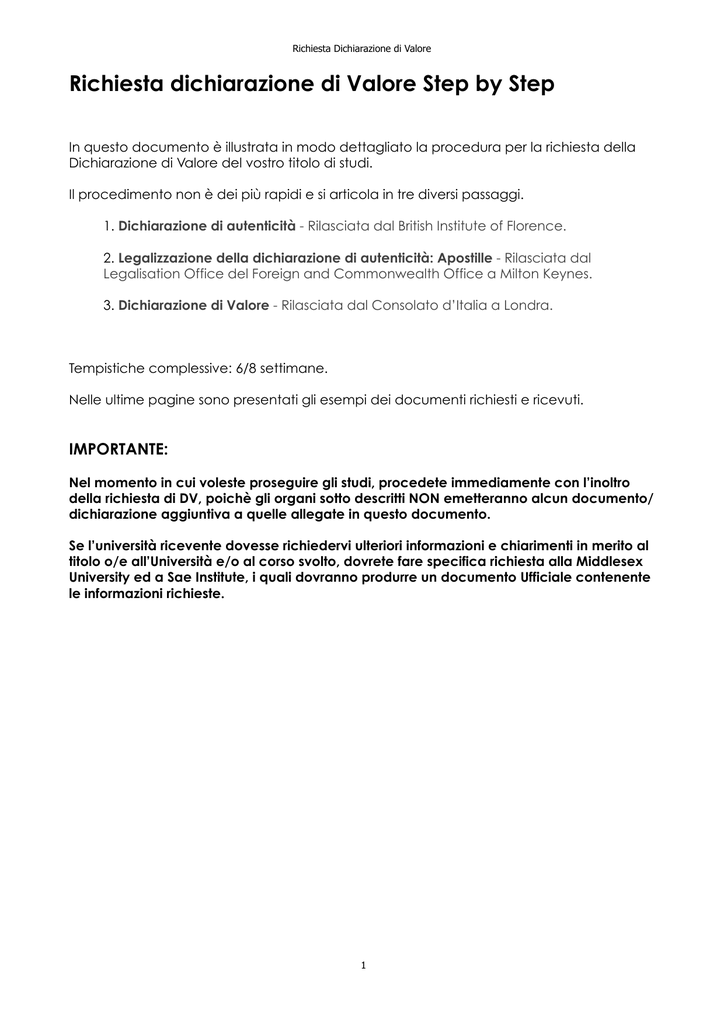 Richiesta Dichiarazione di Valore Richiesta dichiarazione di Valore Step by Step In questo documento è illustrata in modo dettagliato la procedura per la richiesta della Dichiarazione di Valore del vostro titolo di studi. Il procedimento non è dei più rapidi e si articola in tre diversi passaggi. 1. Dichiarazione di autenticità - Rilasciata dal British Institute of Florence. 2. Legalizzazione della dichiarazione di autenticità: Apostille - Rilasciata dal Legalisation Office del Foreign and Commonwealth Office a Milton Keynes. 3. Dichiarazione di Valore - Rilasciata dal Consolato d’Italia a Londra. Tempistiche complessive: 6/8 settimane. Nelle ultime pagine sono presentati gli esempi dei documenti richiesti e ricevuti. IMPORTANTE: Nel momento in cui voleste proseguire gli studi, procedete immediamente con l’inoltro della richiesta di DV, poichè gli organi sotto descritti NON emetteranno alcun documento/ dichiarazione aggiuntiva a quelle allegate in questo documento. Se l’università ricevente dovesse richiedervi ulteriori informazioni e chiarimenti in merito al titolo o/e all’Università e/o al corso svolto, dovrete fare specifica richiesta alla Middlesex University ed a Sae Institute, i quali dovranno produrre un documento Ufficiale contenente le informazioni richieste. 1 Richiesta Dichiarazione di Valore 1. AUTENTICAZIONE DEL TITOLO DI STUDIO La dichiarazione di Autenticità va richiesta al British Institute of Florence. Per farne domanda sono necessari i seguenti docuementi: - Copia del Certificato di Laurea originale - Documento d’identità valido - Copia del Bonifico bancario effettuato - Modulo di richiesta debitamente compilato in ogni sua parte (Scaricabile qui) I suddetti documenti andranno scannerizzati ed inviati via e-mail all’Istituto, il quale contatterà l’Università Middlesex, per appurare che il titolo inviato è originale ed effettivamente conseguito. Fatto ciò il British institute of Florence vi invierà mezzo posta Raccomandata la copia Autenticata del vostro documento. •costo della pratica: 35 Euro. •Tempi di emissione : 2 settimane • Sito internet: www.britishinstitute.it 2 Richiesta Dichiarazione di Valore 2. LEGALIZZAZIONE DELLA DICHIARAZIONE DI AUTENTICITA’ La legalizzazione della copia autentica va richiesta al Legalisation Office del Foreign and Commonwealth Office. Per far richiesta del suddetto documento, sarà necessario inviare mezzo Posta Celere e NON Raccomandata i documenti sotto elencati, al seguente indirizzo: Legalisation Office Foreign & Commonwealth Office PO Box 6255 Milton Keynes MK10 1XX I documenti da includere alla richiesta sono i seguenti: - Copia del certificato Auteticata - Copia del documento d’identità - Copia del pagamento effettuato - Application Form debitamente compilato (scaricabile qui) - Busta formato A4 pre-compilata con il proprio indirizzo. Fare molta attenzione a non utilizzare la Posta Raccomandata dal momento che i documenti verranno inviati ad una casella Postale e non a persona fisica! •costo della pratica : 44,50 Sterline •Tempi di emissione : 1 settimana •Sito internet : www.fco.gov.uk 3 Richiesta Dichiarazione di Valore 3.DICHIARAZIONE DI VALORE La richiesta della Dichiarazione di valore va inoltrata al Consolato Gerale d’Italia a Londra. In questa fase bisognerà fare molta attenzione alle informazioni richieste dal consolato, pena il rigetto della richiesta e tempi di attesa prolungati. Tutti i documenti sottocitati dovranno essere inviati mezzo posta al seguente indirizzo: Consolato Generale d'Italia Ufficio Titoli di Studio 38 Eaton Place London SW1X 8AN Documenti da inoltrare: - Copia del certificato autenticata e legalizzata - Traduzione del Certificato di Laurea - Diploma Supplements in originale - Copia del documento d’identità - Copia del bonifico effettuato - Lettera supplementare dell’università con informazioni aggiuntive - Busta formato A4 pre-compilata Attenzione,i documenti da prensentare al Consalato dovranno necessariamente contenere le seguenti specifiche: - Nome e Cognome del candidato - Data di Nascita - Data di prima Immatricolazione - Durata complessiva del corso - Modalità di frequenza (tempo pieno o parziale) - Numero di crediti accademici acquisiti Nel nostro specifico caso, andrà richiesta a Sae Institute una dichiarazione aggiuntiva, contenente le seguenti informazioni : - Data di prima immatricolazione - Specifica delle modalità di frequenza del Certificate e del Bachelor - Date di inzio e fine del Certificate (Sae Institute Diploma) - Date di inizio e fine del Bachelor of Arts •costo della pratica: 44 Sterline •Tempi di emissione: 20/ 30 giorni •Sito internet: www.conslondra.esteri.it 4 Richiesta Dichiarazione di Valore 1. AUTENTICAZIONE TITOLO 5 Richiesta Dichiarazione di Valore 2. LEGALIZZAZIONE DEL TITOLO MEDIANTE APOSTILLE 6 Richiesta Dichiarazione di Valore 3. DICHIARAZIONE DI VALORE 7 Richiesta Dichiarazione di Valore 8 Richiesta Dichiarazione di Valore 4. DOCUMENTI AGGIUNTIVI RICHIESTI DAL CONSOLATO 9 Richiesta Dichiarazione di Valore 10 Richiesta Dichiarazione di Valore 11