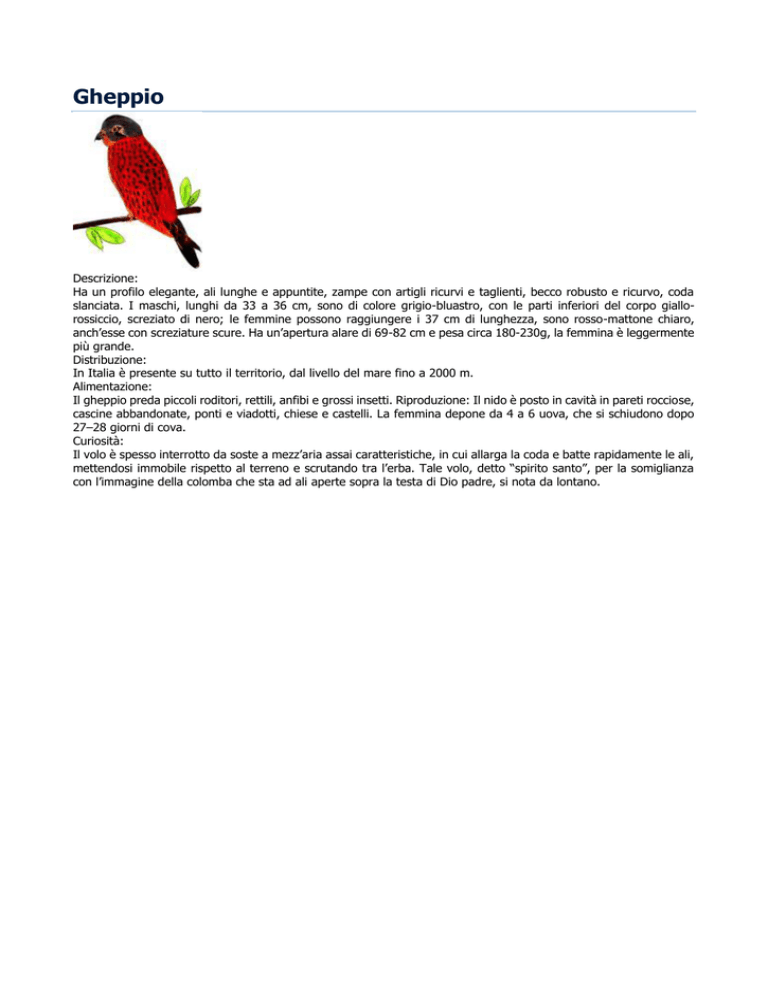 Gheppio Descrizione: Ha un profilo elegante, ali lunghe e appuntite, zampe con artigli ricurvi e taglienti, becco robusto e ricurvo, coda slanciata. I maschi, lunghi da 33 a 36 cm, sono di colore grigio-bluastro, con le parti inferiori del corpo giallorossiccio, screziato di nero; le femmine possono raggiungere i 37 cm di lunghezza, sono rosso-mattone chiaro, anch’esse con screziature scure. Ha un’apertura alare di 69-82 cm e pesa circa 180-230g, la femmina è leggermente più grande. Distribuzione: In Italia è presente su tutto il territorio, dal livello del mare fino a 2000 m. Alimentazione: Il gheppio preda piccoli roditori, rettili, anfibi e grossi insetti. Riproduzione: Il nido è posto in cavità in pareti rocciose, cascine abbandonate, ponti e viadotti, chiese e castelli. La femmina depone da 4 a 6 uova, che si schiudono dopo 27–28 giorni di cova. Curiosità: Il volo è spesso interrotto da soste a mezz’aria assai caratteristiche, in cui allarga la coda e batte rapidamente le ali, mettendosi immobile rispetto al terreno e scrutando tra l’erba. Tale volo, detto “spirito santo”, per la somiglianza con l’immagine della colomba che sta ad ali aperte sopra la testa di Dio padre, si nota da lontano.