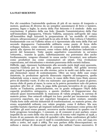 LA FIAT SEICENTO Per chi considera l’automobile qualcosa di più di un mezzo di trasporto a motore, qualcosa di diverso da un semplice assommarsi di ferro e lamiere, gomma, legno e leghe, la storia della Fiat Seicento è il simbolo della sua convinzione, il pilastro della sua fede. Quando l’amministratore della Fiat nell’immediato dopoguerra, Vittorio Valletta, annuncia nell’aprile del 1953 all’Assemblea degli Azionisti la preparazione di “un modello di vettura minore, ultraeconomica”, anch’egli fa un atto di fede. Tale vettura è l’obiettivo fondamentale con cui Valletta stesso si è ripresentato alla testa della Fiat nel secondo dopoguerra: l’automobile utilitaria come punto di forza dello sviluppo italiano, come elemento di consenso e di stabilità sociale, come spinta alla ripresa dei consumi, come volano della produzione industriale e perciò del benessere. Tutte queste aspettative concentrate in un'unica vetturetta… tramite la quale, vallettianamente ma potremmo dire anche fordianamente, vengono chiamati in causa anche i lavoratori, non soltanto come produttori ma come consumatori ed utenti. Una rivoluzione copernicana, nel risicatissimo e stentato panorama della società italiana. Difficile, oggi, ripensare lucidamente alla seconda metà degli anni quaranta, esaurita l’euforia per la fine della guerra mondiale. Nel gelido inverno 1945/1946 la popolazione era allo stremo, priva in molti casi della casa e dei più elementari mezzi di sostentamento. Oltre un terzo delle case erano sinistrate, la produzione agricola dimezzata rispetto all’anteguerra, quella industriale scesa a meno di un terzo, le casse dello Stato (uno Stato ancora privo di identità) vuote. Il cibo era razionato: 250 grammi di pane al giorno; mezzo chilo di pasta al mese; la carne se la poteva permettere solo chi poteva spendere 380 lire al chilo, la paga della giornata lavorativa di un operaio. Anche se l’industria, potenzialmente, era in grado sviluppare l’85% della capacità produttiva anteguerra, a questo risultato si frapponevano due ostacoli quasi insormontabili: la mancanza di valuta pregiata, la carenza di materie prime. Due ostacoli collegati tra loro: perché per incamerare valuta occorreva esportare, ma per esportare bisognava poter contare, essendo l’Italia forte nelle attività industriali di trasformazione, su materie prime, che erano acquistabili soltanto con valute pregiate, come il dollaro. Ma non sarebbe bastato riportare gli impianti industriali a funzionare come prima del conflitto: gli anni erano passati, occorreva anche rimettersi in quadro con il forte progresso tecnologico. I consumi, se di consumi si può parlare, erano impediti da un costo della vita che era salito di trenta volte rispetto al 1938, a fronte di un aumento dei salari di quindici volte. Basta confrontare gli indici dei prezzi all’ingrosso: se per il 1938 lo consideriamo pari a 100, nel 1945 era salito a 2060, nel 1946 a 2884. Per non parlare della disoccupazione; un milione e mezzo di disoccupati nel 1946, due milioni l’anno successivo. Il 1 debito pubblico che nel 1939 era di 145 miliardi di lire aveva raggiunto nel 1946 i 906 miliardi. Non erano serviti ad impedire la voragine né il “Prestito Pubblico per la Ricostruzione”, lanciato dal Ministro del Tesoro Epicarmo Corbino, né un credito di 130 milioni di dollari del governo militare alleato, né gli aiuti in cibo, materie prime, macchinari e medicinali dell’UNRRA (United Nations Relief and Rehabilitation Administration). E neppure l’arrivo delle navi cariche di grano, giunte in Italia grazie a Fiorello La Guardia, il sindaco di New York che non dimenticò mai le sue origini. Poco più di un pannicello caldo l’ulteriore prestito di 100 milioni di dollari ottenuto dal nostro capo di governo, Alcide de Gasperi, nel suo primo viaggio a Washington del gennaio 1947, compiuto con un cappotto imprestato da Attilio Piccioni, perché egli stesso non ne possedeva uno decente. Un’Italia stracciona e allo stremo, ma dotata, riconosciamolo, di una dignità e di una forza che oggi ci paiono un miraggio. Se Valletta avesse deciso di affidare le scelte produttive della Fiat ai risultati di un’indagine di mercato, avrebbe dovuto rassegnarsi a produrre soltanto trattori e ciclomotori. Se avesse preso sul serio, come parametro di decisione, i dati sulla struttura e sulla dinamica del reddito nazionale, difficilmente avrebbe fatto quell’annuncio nel 1953. Il fatto fu che Valletta, e anche questo lo avvicina grandemente alla figura di Ford, decise di non curarsene. Anzi, decise di ribaltare il criterio: sarebbe stata la sua vettura la spinta all’accrescimento del reddito nazionale procapite, non il contrario. Quella scelta venne fatta dunque non perché i tempi erano maturi, ma per renderli tali, anche se si correva il rischio di vendere la 600 ad un prezzo che avrebbe garantito un margine di utile molto ristretto. Ci si potrebbe allora chiedere perché Valletta aspettò tanto: dieci anni tra la fine della guerra e l’effettiva uscita sul mercato della Fiat 600, dieci anni in cui la produzione di vetture utilitarie consistette unicamente nella produzione della Topolino e delle sue varianti. Una spiegazione è nel gigantesco volume di capitali che risultò necessario impegnare per produrre un modello in grande serie (cosa che la 500 del 1936 non era mai stata). Si erano dovuti affrontare sforzi immensi, ed indebitamenti da capogiro, sostenuti grazie agli azionisti e agli obbligazionisti. Nello stesso tempo però occorreva sostenere in maniera adeguata il livello dei salari e degli stipendi, in modo da porre le condizioni per una diffusione di massa del nuovo modello. Queste condizioni furono raggiunte nell’estate del 1953, al termine dei primi sette esercizi del dopoguerra. Già da tempo però Dante Giacosa, responsabile della progettazione, e i suoi collaboratori lavoravano al progetto della “100” (così si chiamò inizialmente la Se