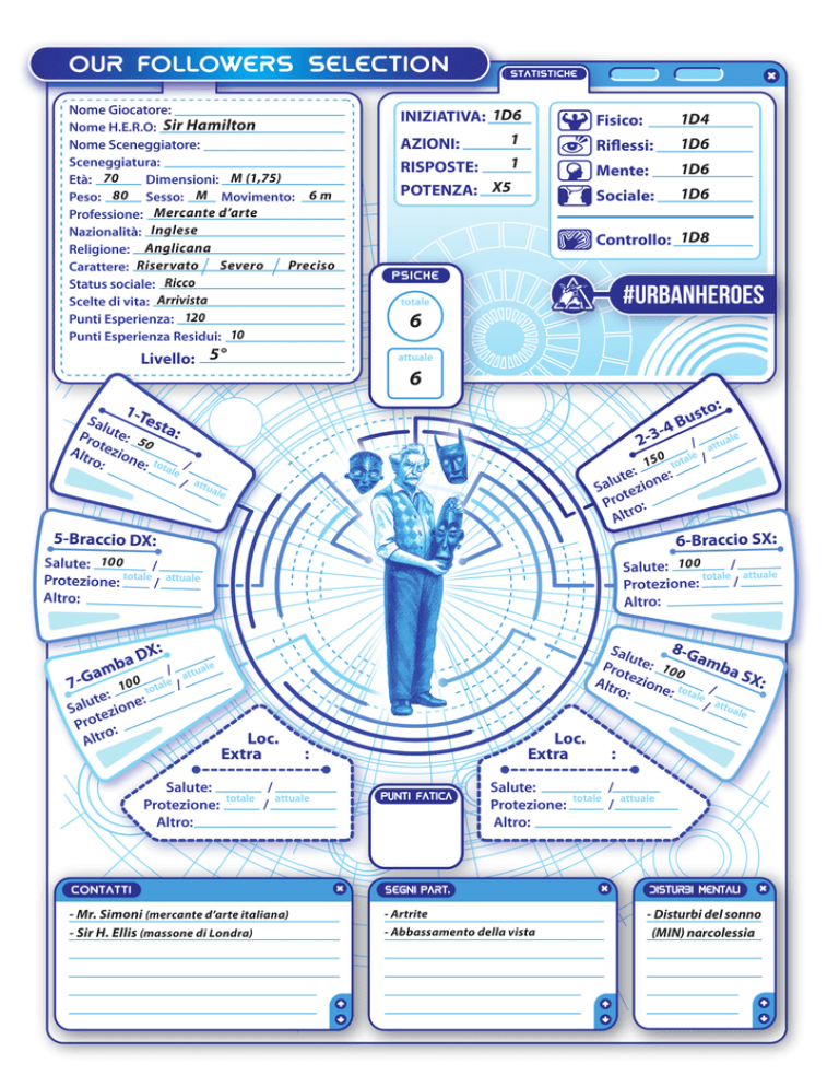 our followers selection Sir Hamilton 70 80 M (1,75) M Mercante d’arte Inglese Anglicana Riservato Severo Ricco Arrivista 120 10 1D6 1D4 1 1D6 1 1D6 X5 6m 1D6 1D8 Preciso 6 5° 6 50 150 100 100 10 0 10 0 - Mr. Simoni (mercante d’arte italiana) - Sir H. Ellis (massone di Londra) - Artrite - Abbassamento della vista - Disturbi del sonno (MIN) narcolessia Botanica 1 Inglese Tedesco 1 1 Pittura Scultura 2 2 7 5 2 2 Storia dell’arte Mercante d’arte 2 Automobile A r te f Gene a t to Protezio ne s i* * * MED P orta Cre a z tore (MAG )* ion Conta e tto/ Vo l o n distanza t Co n t i nu a ta a ri a* * * L’og g ** dev etto è una e pron m uncia aschera formu r e u na la *** ev oca d voodoo eg l i s p iriti vo o do o 1 Aume nto Durat a Inca p ac ita Multip lo Multip lo - Cellulare - Medicinali per artite - Sonnifero - Telecomando (sistemi di sicurezza domestici) n t e MED Distan Revolver za - Orologio da taschino (in oro) Evocatore MIN Portatore (MAG) Effetto Contatto Volontaria Istantanea Incapacitante Pot. second. MIN Distanza - Monocolo Min S 1D6x30 P/B 10m 2D6 x100$ 120.000$ 6 4 1