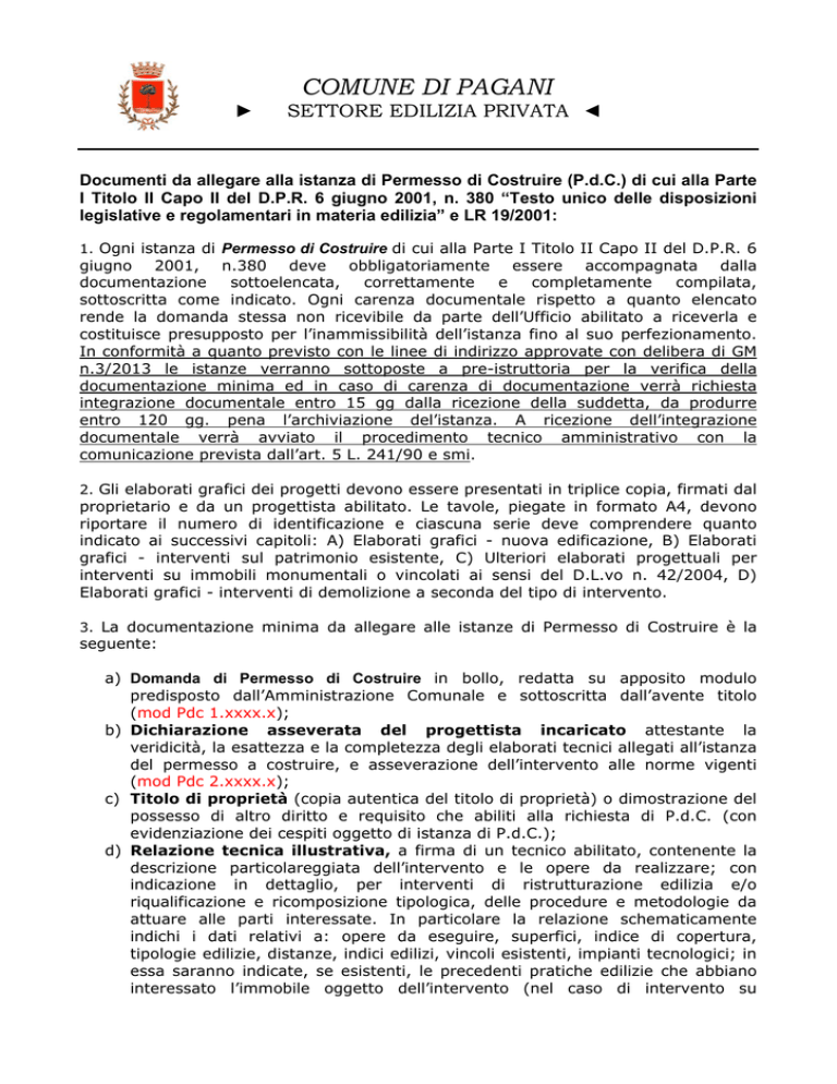 COMUNE DI PAGANI ► SETTORE EDILIZIA PRIVATA ◄ Documenti da allegare alla istanza di Permesso di Costruire (P.d.C.) di cui alla Parte I Titolo II Capo II del D.P.R. 6 giugno 2001, n. 380 “Testo unico delle disposizioni legislative e regolamentari in materia edilizia” e LR 19/2001: 1. Ogni istanza di Permesso di Costruire di cui alla Parte I Titolo II Capo II del D.P.R. 6 giugno 2001, n.380 deve obbligatoriamente essere accompagnata dalla documentazione sottoelencata, correttamente e completamente compilata, sottoscritta come indicato. Ogni carenza documentale rispetto a quanto elencato rende la domanda stessa non ricevibile da parte dell’Ufficio abilitato a riceverla e costituisce presupposto per l’inammissibilità dell’istanza fino al suo perfezionamento. In conformità a quanto previsto con le linee di indirizzo approvate con delibera di GM n.3/2013 le istanze verranno sottoposte a pre-istruttoria per la verifica della documentazione minima ed in caso di carenza di documentazione verrà richiesta integrazione documentale entro 15 gg dalla ricezione della suddetta, da produrre entro 120 gg. pena l’archiviazione del’istanza. A ricezione dell’integrazione documentale verrà avviato il procedimento tecnico amministrativo con la comunicazione prevista dall’art. 5 L. 241/90 e smi. 2. Gli elaborati grafici dei progetti devono essere presentati in triplice copia, firmati dal proprietario e da un progettista abilitato. Le tavole, piegate in formato A4, devono riportare il numero di identificazione e ciascuna serie deve comprendere quanto indicato ai successivi capitoli: A) Elaborati grafici - nuova edificazione, B) Elaborati grafici - interventi sul patrimonio esistente, C) Ulteriori elaborati progettuali per interventi su immobili monumentali o vincolati ai sensi del D.L.vo n. 42/2004, D) Elaborati grafici - interventi di demolizione a seconda del tipo di intervento. 3. La documentazione minima da allegare alle istanze di Permesso di Costruire è la seguente: a) Domanda di Permesso di Costruire in bollo, redatta su apposito modulo predisposto dall’Amministrazione Comunale e sottoscritta dall’avente titolo (mod Pdc 1.xxxx.x); b) Dichiarazione asseverata del progettista incaricato attestante la veridicità, la esattezza e la completezza degli elaborati tecnici allegati all’istanza del permesso a costruire, e asseverazione dell’intervento alle norme vigenti (mod Pdc 2.xxxx.x); c) Titolo di proprietà (copia autentica del titolo di proprietà) o dimostrazione del possesso di altro diritto e requisito che abiliti alla richiesta di P.d.C. (con evidenziazione dei cespiti oggetto di istanza di P.d.C.); d) Relazione tecnica illustrativa, a firma di un tecnico abilitato, contenente la descrizione particolareggiata dell’intervento e le opere da realizzare; con indicazione in dettaglio, per interventi di ristrutturazione edilizia e/o riqualificazione e ricomposizione tipologica, delle procedure e metodologie da attuare alle parti interessate. In particolare la relazione schematicamente indichi i dati relativi a: opere da eseguire, superfici, indice di copertura, tipologie edilizie, distanze, indici edilizi, vincoli esistenti, impianti tecnologici; in essa saranno indicate, se esistenti, le precedenti pratiche edilizie che abbiano interessato l’immobile oggetto dell’intervento (nel caso di intervento su preesistente, deve essere dichiarato, a norma della legge N. 445/2000 e s.m.i., la conformità degli interventi già eseguiti ai permessi precedentemente conseguiti, e ai regolamenti e alle normative vigenti in materia); la relazione deve inoltre contenere la dichiarazione di conformità dell’intervento agli strumenti urbanistici, ai regolamenti ed alle normative vigenti in materia. Dalla Relazione tecnica si devono evincere: le caratteristiche tipologiche dell’opera progettata (destinazioni d’uso di ciascun ambiente, tipo edilizio, numero di piani, ecc.), quelle costruttive (materiali e tecniche impegnate nelle principali strutture quali fondazioni, elementi portanti verticali ed orizzontali, recinzioni, coperture, ecc.), quelle delle rifiniture, quelle tecnologiche (impianto idrico, elettrico, canne fumarie, riscaldamento, elettronici, protezione scariche atmosferiche, di gas metano o di qualsiasi fonte energetica alternativa, impianto telefonico, di smaltimento rifiuti, di smaltimento degli scarichi idrici, di condizionamento, di ascensione, antincendio, ecc.), quelle concernenti il risparmio energetico. La relazione deve indicare il modo in cui il progetto ha risolto il problema delle eliminazione delle barriere architettoniche ai sensi della Legge N. 13/89 e del Decreto Ministeriale N. 236/89, specificatamente in merito a: percorsi pedonali, parcheggi e posti macchina, accessi, scale, rampe, ascensori, porte, corridoi e passaggi, locali igienici, impianti; e) Relazione Tecnica asseverata a firma di Progettista abilitato che indichi le categorie d’intervento previste ai sensi dell’art. 3 del DPR 380/2001 ed asseveri la conformità del progetto agli strumenti approvati od adottati, ai regolamenti edilizi vigenti, ed alle altre normative di settore aventi incidenza sulla disciplina della attività edilizia e, in particolare, alle norme antisismiche, di sicurezza, antincendio, igienico-sanitarie nel caso in cui la verifica in ordine a tale conformità non comporti valutazioni tecnico-discrezionali, alle norme relative all’efficienza energetica, e la compatibilità con tutti i vincoli gravanti sul territorio (incluso il divieto decennale di edificabilità di un’area percorsa dal fuoco ai sensi della legge 21 novembre 2000, n. 353 «Legge quadro sugli incendi boschivi» e s.m.i.); il professionista dovrà inoltre dichiarare il rispetto delle prescrizioni degli artt. 26 e 27 della L.R. 35/87 in merito alle tipologie, materiali e tecniche costruttive per le edificazioni; f) Stralci del PRG (zonizzazione/categorie d’intervento/vincoli/ecc.) - Piano Regolatore G
