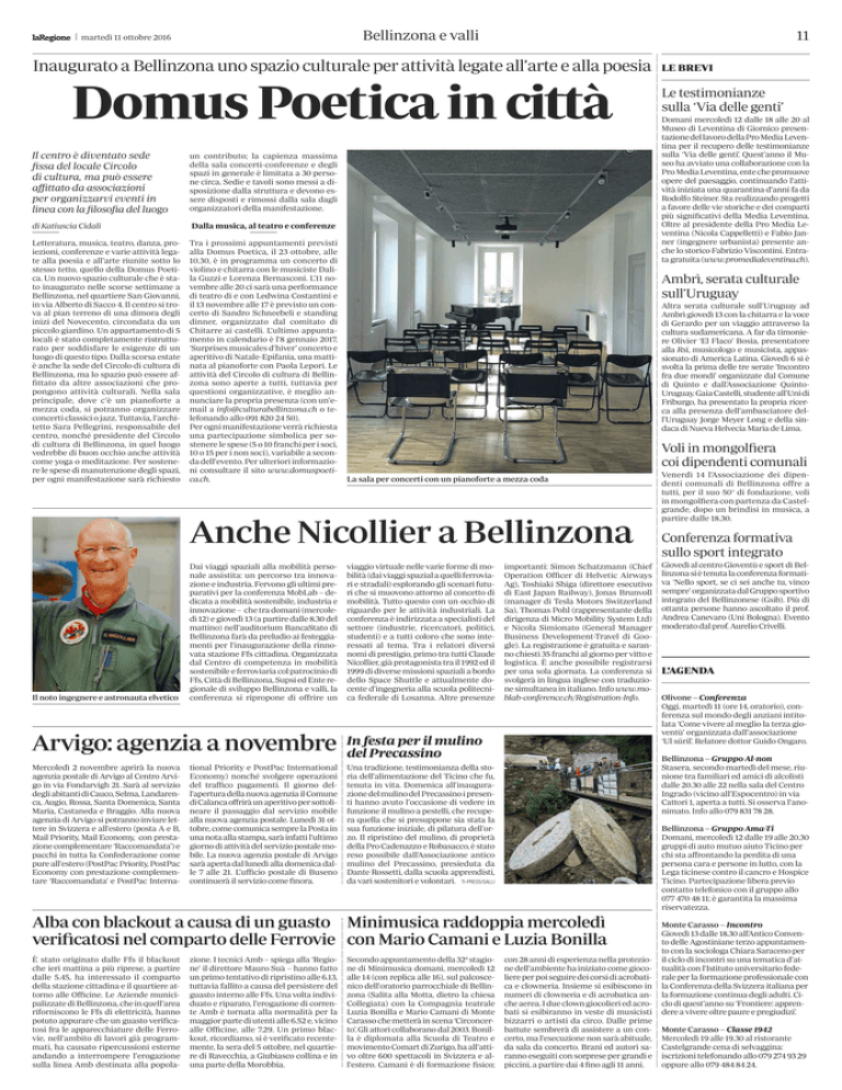 Bellinzona e valli martedì 11 ottobre 2016 11 Inaugurato a Bellinzona uno spazio culturale per attività legate all’arte e alla poesia Domus Poetica in città Il centro è diventato sede fissa del locale Circolo di cultura, ma può essere affittato da associazioni per organizzarvi eventi in linea con la filosofia del luogo un contributo; la capienza massima della sala concerti-conferenze e degli spazi in generale è limitata a 30 persone circa. Sedie e tavoli sono messi a disposizione dalla struttura e devono essere disposti e rimossi dalla sala dagli organizzatori della manifestazione. di Katiuscia Cidali Dalla musica, al teatro e conferenze Letteratura, musica, teatro, danza, proiezioni, conferenze e varie attività legate alla poesia e all’arte riunite sotto lo stesso tetto, quello della Domus Poetica. Un nuovo spazio culturale che è stato inaugurato nelle scorse settimane a Bellinzona, nel quartiere San Giovanni, in via Alberto di Sacco 4. Il centro si trova al pian terreno di una dimora degli inizi del Novecento, circondata da un piccolo giardino. Un appartamento di 5 locali è stato completamente ristrutturato per soddisfare le esigenze di un luogo di questo tipo. Dalla scorsa estate è anche la sede del Circolo di cultura di Bellinzona, ma lo spazio può essere affittato da altre associazioni che propongono attività culturali. Nella sala principale, dove c’è un pianoforte a mezza coda, si potranno organizzare concerti classici o jazz. Tuttavia, l’architetto Sara Pellegrini, responsabile del centro, nonché presidente del Circolo di cultura di Bellinzona, in quel luogo vedrebbe di buon occhio anche attività come yoga o meditazione. Per sostenere le spese di manutenzione degli spazi, per ogni manifestazione sarà richiesto Tra i prossimi appuntamenti previsti alla Domus Poetica, il 23 ottobre, alle 10.30, è in programma un concerto di violino e chitarra con le musiciste Dalila Guzzi e Lorenza Bernasconi. L’11 novembre alle 20 ci sarà una performance di teatro di e con Ledwina Costantini e il 13 novembre alle 17 è previsto un concerto di Sandro Schneebeli e standing dinner, organizzato dal comitato di Chitarre ai castelli. L’ultimo appuntamento in calendario è l’8 gennaio 2017, ‘Surprises musicales d’hiver’ concerto e aperitivo di Natale-Epifania, una mattinata al pianoforte con Paola Lepori. Le attività del Circolo di cultura di Bellinzona sono aperte a tutti, tuttavia per questioni organizzative, è meglio annunciare la propria presenza (con un’email a [email protected] o telefonando allo 091 820 24 50). Per ogni manifestazione verrà richiesta una partecipazione simbolica per sostenere le spese (5 o 10 franchi per i soci, 10 o 15 per i non soci), variabile a seconda dell’evento. Per ulteriori informazioni consultare il sito www.domuspoetica.ch. Il noto ingegnere e astronauta elvetico Arvigo: agenzia a novembre Mercoledì 2 novembre aprirà la nuova agenzia postale di Arvigo al Centro Arvigo in via Fondarvigh 21. Sarà al servizio degli abitanti di Cauco, Selma, Landarenca, Augio, Rossa, Santa Domenica, Santa Maria, Castaneda e Braggio. Alla nuova agenzia di Arvigo si potranno inviare lettere in Svizzera e all’estero (posta A e B, Mail Priority, Mail Economy, con prestazione complementare ‘Raccomandata’) e pacchi in tutta la Confederazione come pure all’estero (PostPac Priority, PostPac Economy con prestazione complementare ‘Raccomandata’ e PostPac Interna- tional Priority e PostPac International Economy) nonché svolgere operazioni del traffico pagamenti. Il giorno dell’apertura della nuova agenzia il Comune di Calanca offrirà un aperitivo per sottolineare il passaggio dal servizio mobile alla nuova agenzia postale. Lunedì 31 ottobre, come comunica sempre la Posta in una nota alla stampa, sarà infatti l’ultimo giorno di attività del servizio postale mobile. La nuova agenzia postale di Arvigo sarà aperta dal lunedì alla domenica dalle 7 alle 21. L’ufficio postale di Buseno continuerà il servizio come finora. zione. I tecnici Amb – spiega alla ‘Regione’ il direttore Mauro Suà – hanno fatto un primo tentativo di ripristino alle 6.13, tuttavia fallito a causa del persistere del guasto interno alle Ffs. Una volta individuato e riparato, l’erogazione di corrente Amb è tornata alla normalità per la maggior parte di utenti alle 6.52 e, vicino alle Officine, alle 7.29. Un primo blackout, ricordiamo, si è verificato recentemente, la sera del 5 ottobre, nel quartiere di Ravecchia, a Giubiasco collina e in una parte della Morobbia. Domani mercoledì 12 dalle 18 alle 20 al Museo di Leventina di Giornico presentazione del lavoro della Pro Media Leventina per il recupero delle testimonianze sulla ‘Via delle genti’. Quest’anno il Museo ha avviato una collaborazione con la Pro Media Leventina, ente che promuove opere del paesaggio, continuando l’attività iniziata una quarantina d’anni fa da Rodolfo Steiner. Sta realizzando progetti a favore delle vie storiche e dei comparti più significativi della Media Leventina. Oltre al presidente della Pro Media Leventina (Nicola Cappelletti) e Fabio Janner (ingegnere urbanista) presente anche lo storico Fabrizio Viscontini. Entrata gratuita (www.promedialeventina.ch). Altra serata culturale sull’Uruguay ad Ambrì giovedì 13 con la chitarra e la voce di Gerardo per un viaggio attraverso la cultura sudamericana. A far da timoniere Olivier ‘El Flaco’ Bosia, presentatore alla Rsi, musicologo e musicista, appassionato di America Latina. Giovedì 6 si è svolta la prima delle tre serate ‘Incontro fra due mondi’ organizzate dal Comune di Quinto e dall’Associazione QuintoUruguay. Gaia Castelli, studente all’Uni di Friburgo, ha presentato la propria ricerca alla presenza dell’ambasciatore dell’Uruguay Jorge Meyer Long e della sindaca di Nueva Helvecia Maria de Lima. Voli in mongolfiera coi dipendenti comunali La sala per concerti con un pianoforte a mezza coda viagg