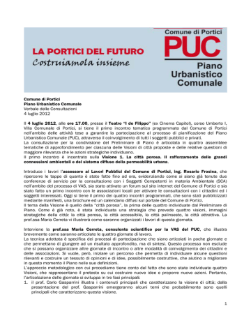 Comune di Portici Piano Urbanistico Comunale Verbale delle Consultazioni 4 luglio 2012 Il 4 luglio 2012, alle ore 17.00, presso il Teatro “I de Filippo” (ex Cinema Capitol), corso Umberto I, Villa Comunale di Portici, si tiene il primo incontro tematico programmato dal Comune di Portici nell’ambito delle attività tese a garantire la partecipazione al processo di pianificazione del Piano Urbanistico Comunale (PUC), attraverso il coinvolgimento di tutti i soggetti pubblici e privati. La consultazione per la condivisione del Preliminare di Piano è articolata in quattro assemblee tematiche di approfondimento per ciascuna delle Visioni di città proposte e delle relative questioni di maggiore rilevanza che le azioni strategiche individuano. Il primo incontro è incentrato sulla Visione 1. La città porosa. Il rafforzamento delle grandi connessioni ambientali e del sistema diffuso della permeabilità urbana. Introduce i lavori l’assessore ai Lavori Pubblici del Comune di Portici, ing. Rosario Frosina, che ripercorre le tappe di quanto è stato fatto fino ad ora, evidenziando come si siano già tenute due conferenze di servizio per la consultazione con i Soggetti Competenti in materia Ambientale (SCA) nell’ambito del processo di VAS, sia stato attivato un forum sul sito internet del Comune di Portici e sia stato fatto un primo incontro con le associazioni locali per attivare le consultazioni con i cittadini ed i soggetti interessati. Oggi si tiene il primo dei quattro incontri programmati, che sono stati pubblicizzati mediante manifesti, una brochure ed un calendario diffusi sul portale del Comune di Portici. Il tema della Visione è quello della “città porosa”, la prima delle quattro individuate dal Preliminare di Piano. Come è già noto, è stata individuata una strategia che prevede quattro visioni, immagini strategiche della città: la città porosa, la città accessibile, la città palinsesto, la città attrattiva. La prof.ssa Maria Cerreta vi illustrerà come saranno organizzati i lavori di questa giornata. Interviene la prof.ssa Maria Cerreta, consulente scientifico per la VAS del PUC, che illustra brevemente come saranno articolate le quattro giornate di lavoro. La tecnica adottata è specifica dei processi di partecipazione che siano articolati in poche giornate e che permettano di giungere ad un risultato approfondito, ma di sintesi. Questo processo non esclude che si possano organizzare altre giornate di incontro o altre modalità di coinvolgimento dei cittadini e delle associazioni. Si vuole, però, iniziare un percorso che permetta di individuare alcune questioni rilevanti e costruire un tessuto di opinioni e di idee, possibilmente costruttive, che aiutino a migliorare in questo momento il Piano nelle sue definizioni. L’approccio metodologico con cui procediamo tiene conto del fatto che sono state individuate quattro Visioni, che rappresentano il pretesto su cui costruire nuove idee e proporre nuove azioni. Pertanto, l’articolazione delle giornate si sviluppa in tre fasi principali: 1. il prof. Carlo Gasparrini illustra i contenuti principali che caratterizzano la visione di città; dalla presentazione del prof. Gasparrini emergeranno alcuni temi che probabilmente sono quelli principali che caratterizzano questa visione. 1 2. Ciascuno dei temi diventa oggetto di discussione da approfondire all’interno di gruppi di lavoro, che si formeranno in modo spontaneo tra i partecipanti all’assemblea. Ciascun gruppo, possibilmente formato da persone che non fanno parte della stessa associazione, analizzerà criticità e potenzialità della Visione di città in esame e proporrà delle possibili azioni. A ciascun gruppo verranno dati dei pennarelli e tre fogli di carta A3; sul primo foglio saranno elencate le potenzialità del tema legato alla visione di città, sul secondo foglio le criticità e sul terzo foglio le azioni. Questi tre fogli costituiscono il verbale, l’istant report, che ciascun gruppo di lavoro consegnerà all’assemblea. 3. Il portavoce di ciascun gruppo di lavoro illustrerà all’assemblea, ai rappresentanti dell’Amministrazione ed ai progettisti del Piano il proprio istant report, un report “istantaneo” che permettere di raccogliere in un solo documento le principali conclusioni elaborate nel corso delle discussioni. Queste fasi verranno seguite in ciascuno dei quattro incontri tematici, così che a conclusione delle quattro giornate avremo una serie di indicazioni e proposte, la cui ricchezza dipenderà soltanto dalla disponibilità dei cittadini ad interagire ed a contribuire alla discussione generale. Questo processo partecipativo potrebbe essere il primo tassello di un percorso più articolato da attivare a settembre, in maniera diversa, con una metodologia differente, tenendo conto dei risultati a cui si giungerà a fine luglio. Interviene il prof. Carlo Gasparrini, consulente e coordinatore dell’Ufficio di Piano per il PUC e redattore della VAS, che illustra i contenuti della Visione 1. La città porosa. Il rafforzamento delle grandi connessioni ambientali e del sistema diffuso della permeabilità urbana. Il prof. Gasparrini esprime il suo dispiacere per quanti non hanno partecipato all’incontro precedente, all’assemblea pubblica di presentazione del Preliminare di Piano nel suo insieme, e che pertanto oggi non hanno un’idea complessiva delle strategie. Come diceva l’assessore Frosina, il Piano si articola in quattro assi strategici e in alcuni progetti guida. Oggi discuteremo di uno dei quattro assi strategici: saranno illustrati brevemente i contenuti della visione di città porosa, per non togliere spazio e tempo ai gruppi di lavoro ed alla discussione. I quattro assi strategici hanno l’obiettivo di tentare di rovesciare un’immagine consolidata di Portici, una città che spesso esporta solo i suoi limiti ed i suoi problemi, come la densità abitativa, mentre l’idea che si vuole sostenere è quella di cercare di gua