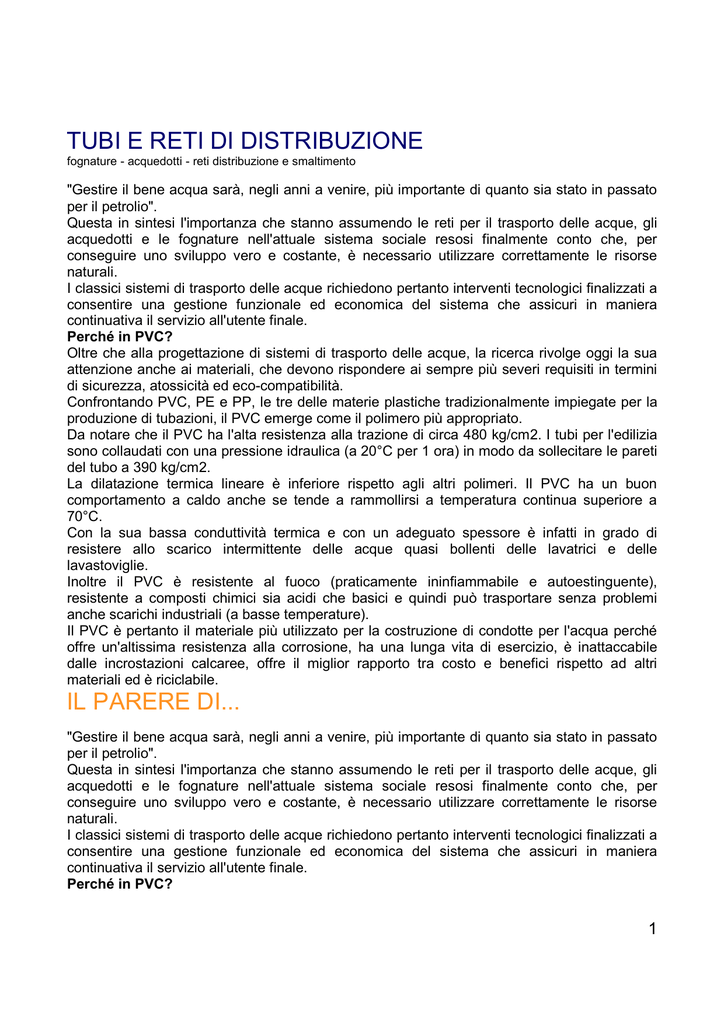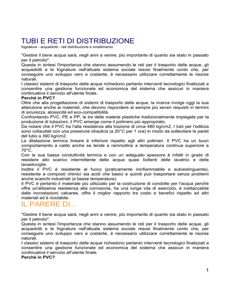 TUBI E RETI DI DISTRIBUZIONE fognature - acquedotti - reti distribuzione e smaltimento "Gestire il bene acqua sarà, negli anni a venire, più importante di quanto sia stato in passato per il petrolio". Questa in sintesi l'importanza che stanno assumendo le reti per il trasporto delle acque, gli acquedotti e le fognature nell'attuale sistema sociale resosi finalmente conto che, per conseguire uno sviluppo vero e costante, è necessario utilizzare correttamente le risorse naturali. I classici sistemi di trasporto delle acque richiedono pertanto interventi tecnologici finalizzati a consentire una gestione funzionale ed economica del sistema che assicuri in maniera continuativa il servizio all'utente finale. Perché in PVC? Oltre che alla progettazione di sistemi di trasporto delle acque, la ricerca rivolge oggi la sua attenzione anche ai materiali, che devono rispondere ai sempre più severi requisiti in termini di sicurezza, atossicità ed eco-compatibilità. Confrontando PVC, PE e PP, le tre delle materie plastiche tradizionalmente impiegate per la produzione di tubazioni, il PVC emerge come il polimero più appropriato. Da notare che il PVC ha l'alta resistenza alla trazione di circa 480 kg/cm2. I tubi per l'edilizia sono collaudati con una pressione idraulica (a 20°C per 1 ora) in modo da sollecitare le pareti del tubo a 390 kg/cm2. La dilatazione termica lineare è inferiore rispetto agli altri polimeri. Il PVC ha un buon comportamento a caldo anche se tende a rammollirsi a temperatura continua superiore a 70°C. Con la sua bassa conduttività termica e con un adeguato spessore è infatti in grado di resistere allo scarico intermittente delle acque quasi bollenti delle lavatrici e delle lavastoviglie. Inoltre il PVC è resistente al fuoco (praticamente ininfiammabile e autoestinguente), resistente a composti chimici sia acidi che basici e quindi può trasportare senza problemi anche scarichi industriali (a basse temperature). Il PVC è pertanto il materiale più utilizzato per la costruzione di condotte per l'acqua perché offre un'altissima resistenza alla corrosione, ha una lunga vita di esercizio, è inattaccabile dalle incrostazioni calcaree, offre il miglior rapporto tra costo e benefici rispetto ad altri materiali ed è riciclabile. IL PARERE DI... "Gestire il bene acqua sarà, negli anni a venire, più importante di quanto sia stato in passato per il petrolio". Questa in sintesi l'importanza che stanno assumendo le reti per il trasporto delle acque, gli acquedotti e le fognature nell'attuale sistema sociale resosi finalmente conto che, per conseguire uno sviluppo vero e costante, è necessario utilizzare correttamente le risorse naturali. I classici sistemi di trasporto delle acque richiedono pertanto interventi tecnologici finalizzati a consentire una gestione funzionale ed economica del sistema che assicuri in maniera continuativa il servizio all'utente finale. Perché in PVC? 1 Oltre che alla progettazione di sistemi di trasporto delle acque, la ricerca rivolge oggi la sua attenzione anche ai materiali, che devono rispondere ai sempre più severi requisiti in termini di sicurezza, atossicità ed eco-compatibilità. Confrontando PVC, PE e PP, le tre delle materie plastiche tradizionalmente impiegate per la produzione di tubazioni, il PVC emerge come il polimero più appropriato. Da notare che il PVC ha l'alta resistenza alla trazione di circa 480 kg/cm2. I tubi per l'edilizia sono collaudati con una pressione idraulica (a 20°C per 1 ora) in modo da sollecitare le pareti del tubo a 390 kg/cm2. La dilatazione termica lineare è inferiore rispetto agli altri polimeri. Il PVC ha un buon comportamento a caldo anche se tende a rammollirsi a temperatura continua superiore a 70°C. Con la sua bassa conduttività termica e con un adeguato spessore è infatti in grado di resistere allo scarico intermittente delle acque quasi bollenti delle lavatrici e delle lavastoviglie. Inoltre il PVC è resistente al fuoco (praticamente ininfiammabile e autoestinguente), resistente a composti chimici sia acidi che basici e quindi può trasportare senza problemi anche scarichi industriali (a basse temperature). Il PVC è pertanto il materiale più utilizzato per la costruzione di condotte per l'acqua perché offre un'altissima resistenza alla corrosione, ha una lunga vita di esercizio, è inattaccabile dalle incrostazioni calcaree, offre il miglior rapporto tra costo e benefici rispetto ad altri materiali ed è riciclabile. Ogni anno in Europa circa 1,2 milioni di tonnellate di PVC sono utilizzate per la produzione di tubi e raccordi per il trasporto di acque, pari a un valore economico di circa 1.190 milioni di euro. In Italia sono impiegate per questa applicazione circa 235.000 tonnellate di PVC. La produzione di tubi in PVC per l’edilizia può essere così riassunta: • tubi edilizia arancio UNI EN 1329 che assicurano rapido deflusso e l'assenza di residui, resistenti ai fuoco, imputrescibili, inattaccabili da parte di roditori, insetti e muffe; • tubi per scarico di acque civili e industriali e destinati ad applicazioni in campo edile che non richiedono la resistenza alle alte temperature; • tubi avorio per scarichi pluviali e ventilazione; • tubi fognatura UNI EN 1401 SN4 SDR41 e UNI EN 1401 SN2 SDR51 a norma UNI EN 1401- 11998. Resistenti al fuoco e alla gran parte degli agenti chimici, inattaccabili da parte di alghe e muffe, roditori ed insetti e quindi idonei a tutte le situazioni che prevedono la costruzione di condotte di scarico interrate ed esterne; • tubi EN 1452 per conduzione di acqua potabile prodotti con stabilizzati metallici ed organici completamente atossici. IL PARERE DI... Chiediamo ad Alessio Pontiggia, dell’Istituto Italiano dei Plastici, quali sono i principali riferimenti normativi per il settore delle tubazioni in PVC rigido (non plastificato). “Per questo settore é ormai completata la sostituzione delle norme nazionali UNI con le norme europee UNI EN. I 