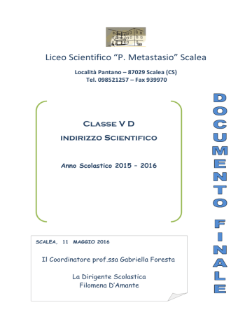 Liceo Scientifico “P. Metastasio” Scalea Località Pantano – 87029 Scalea (CS) Tel. 098521257 – Fax 939970 Classe V D indirizzo Scientifico Anno Scolastico 2015 – 2016 SCALEA, 11 MAGGIO 2016 Il Coordinatore prof.ssa Gabriella Foresta La Dirigente Scolastica Filomena D’Amante INDICE 1. Profilo in uscita dello studente del Liceo Scientifico 2. Piano degli studi del Liceo Scientifico 3. Composizione consiglio di classe e sue variazioni nel triennio Presentazione della classe Giudizio espresso dal C.d. C 4. Tabelle informative su flusso degli studenti e profitto scolastico (iscritti, provenienza scolastica, risultati scrutini terzo e quarto anno, credito assegnato) 5. Obiettivi dell’azione didattico- educativa e strategie metodologiche utilizzate dal CdC per il loro raggiungimento. 6. Attività integrative ed extracurriculari 7. Obiettivi e contenuti, metodi, strumenti e modalità di verifica adottati nelle singole discipline 8. UDA pluridisciplinare 9. Simulazioni della terza prova scritta 10. Griglie di valutazione utilizzate 1. PROFILO IN USCITA DELLO STUDENTE DEL LICEO SCIENTIFICO “Il percorso del liceo scientifico è indirizzato allo studio del nesso tra cultura scientifica e tradizione umanistica. Favorisce l’acquisizione delle conoscenze e dei metodi propri della matematica, della fisica e delle scienze naturali. Guida lo studente ad approfondire e a sviluppare le conoscenze e le abilità e a maturare le competenze necessarie per seguire lo sviluppo della ricerca scientifica e tecnologica e per individuare le interazioni tra le diverse forme del sapere, assicurando la padronanza dei linguaggi, delle tecniche e delle metodologie relative, anche attraverso la pratica laboratoriale” (art. 8 comma 1). Gli studenti, a conclusione del percorso di studio, oltre a raggiungere i risultati di apprendimento comuni, dovranno: aver acquisito una formazione culturale equilibrata nei due versanti linguistico-storico-filosofico e scientifico; comprendere i nodi fondamentali dello sviluppo del pensiero, anche in dimensione storica, e i nessi tra i metodi di conoscenza propri della matematica e delle scienze sperimentali e quelli propri dell’indagine di tipo umanistico; saper cogliere i rapporti tra il pensiero scientifico e la riflessione filosofica; comprendere le strutture portanti dei procedimenti argomentativi e dimostrativi della matematica, anche attraverso la padronanza del linguaggio logico-formale; usarle in particolare nell’individuare e risolvere problemi di varia natura; saper utilizzare strumenti di calcolo e di rappresentazione per la modellizzazione e la risoluzione di problemi; aver raggiunto una conoscenza sicura dei contenuti fondamentali delle scienze fisiche e naturali (chimica, biologia, scienze della terra, astronomia) e, anche attraverso l’uso sistematico del laboratorio, una padronanza dei linguaggi specifici e dei metodi di indagine propri delle scienze sperimentali; essere consapevoli delle ragioni che hanno prodotto lo sviluppo scientifico e tecnologico nel tempo, in relazione ai bisogni e alle domande di conoscenza dei diversi contesti, con attenzione critica alle dimensioni tecnico-applicative ed etiche delle conquiste scientifiche, in particolare quelle più recenti; saper cogliere la potenzialità delle applicazioni dei risultati scientifici nella vita quotidiana. 2. PIANO DEGLI STUDI DEL LICEO SCIENTIFICO 1° biennio 2° biennio 1° 2° 3° 4° anno anno anno anno 5° anno Attività e insegnamenti obbligatori per tutti gli studenti – Orario annuale Lingua e letteratura italiana 132 132 132 132 132 Lingua e cultura latina 99 99 99 99 99 Lingua e cultura straniera 99 99 99 99 99 Storia e Geografia 99 99 Storia 66 66 66 Filosofia 99 99 99 Matematica* 165 165 132 132 132 Fisica 66 66 99 99 99 Scienze naturali** 66 66 99 99 99 Disegno e storia dell’arte 66 66 66 66 66 Scienze motorie e sportive 66 66 66 66 66 Religione cattolica o Attività alternative 33 33 33 33 33 891 891 990 990 990 Totale ore 3. COMPOSIZIONE DEL CONSIGLIO DI CLASSE con indicazione delle variazioni nel triennio DOCENTE 1.VALERIA CARROZZINO DISCIPLINA VARIAZIONI (indicare l’insegnante) III IV MATEMATICA GIOVANNI GIOVANNI FISICA GIOVANNI GIOVANNI MIRELLA SALVATORE PEPE RELIGIONE ITALIANO 2.GABRIELLA FORESTA 3.GIOVANNA DI TRIA 4.IOLANDA FONTANA 5.M.GAETANA PAOLINO 6.ASSUNTA PREZIOSA MARISA VILLELLA 7.ANGELO CRUSCO 8.GRAZIA GARREFFA 9.SALVATORE PEPE 10.ANNA MARIA COGNATA LATINO LINGUA STRANIERA (inglese) FILOSOFIA STORIA FLORIO FLORIO FLORIO FLORIO SCIENZE DISEGNO E STORIA DELL’ARTE EDUCAZIONE FISICA IMBROGNO ELENCO CANDIDATI 1. COGNOME BASSETTI Francesco 3. CIRIMELE Giada 4. DI GIORNO Saverio 5. FAVIERE Giovanna 7. GUARAGNA Sara 8. LOVISI Antonio 2. 6. 9. CAMPAGNA FAVIERE OSSO NOME Sabrina Paola Luca 10. PAGANO Arianna 11. RINALDI M.Carmen 12. RUSSO Elisea 13. SILVESTRI Pierangela 14. TROPEANO Francesco 15. TUFO Massimiliano STORIA E PRESENTAZIONE DELLA CLASSE La classe VD si compone di 15 elementi, 6 studenti e 9 studentesse provenienti, in gran parte, dai paesi limitrofi. All’inizio del secondo biennio era costituita da 16 alunni, di questi un ragazzo diversamente abile che nell’ultimo anno si è ritirato. Gli studenti si sono particolarmente distinti per il loro comportamento sempre corretto e rispettoso nei confronti dei loro coetanei dell’Istituto, dei docenti, del Dirigente e di tutto il personale della scuola. Molto interessati all’apprendimento di tutte le discipline, disponibili al dialogo scolastico e coinvolti in numerose iniziative di ampliamento dell’offerta formativa, nel corso del quinquennio sono cresciuti sia sul piano culturale che umano. Il quadro di profitto complessivo può dirsi pienamente soddisfacente, anche se eterogeneo sotto il profilo dei risultati didattici conseguiti dagli studenti, in relazione ad attitudini, regolarità dell’applicazione ed elaborazione personale; l'azione didattica, comunque, è stata sempre finalizzata alla valo