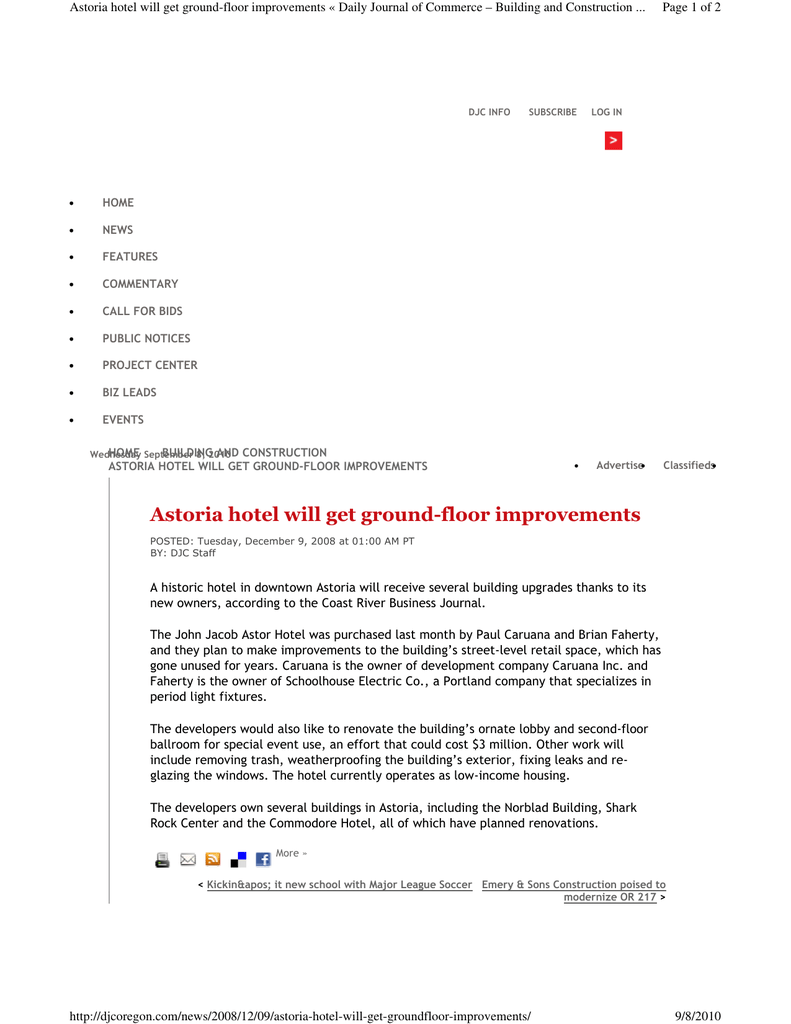 Astoria hotel will get ground-floor improvements « Daily Journal of Commerce – Building and Construction ... Page 1 of 2 ! " # $ %& '()( * $!+ . , +-+ ! " $ ! # $ $& % ' ( $) " $ $$ $ " ( #$ *+ ) # , $) - # & $ . / 0 +12+ 3 4 5 +! /0 6 1744, 6 +!7 84$ 9: 411 $ " $ 3 http://djcoregon.com/news/2008/12/09/astoria-hotel-will-get-groundfloor-improvements/ 4 4 !$:1!+4 " 4 $ +; 4+ !4 ')< = 9/8/2010 Astoria hotel will get ground-floor improvements « Daily Journal of Commerce – Building and Construction ... 4:$ " Page 2 of 2 > ." +, > # +! Type the two words: 4 $+97 ! ? '()( $+* 1 4,+1 @') A A 7 + 9!4 !A :+! ')( 4$!, : # 1$+# $ 9$ " ! http://djcoregon.com/news/2008/12/09/astoria-hotel-will-get-groundfloor-improvements/ & $ 94 @<'(B 9/8/2010