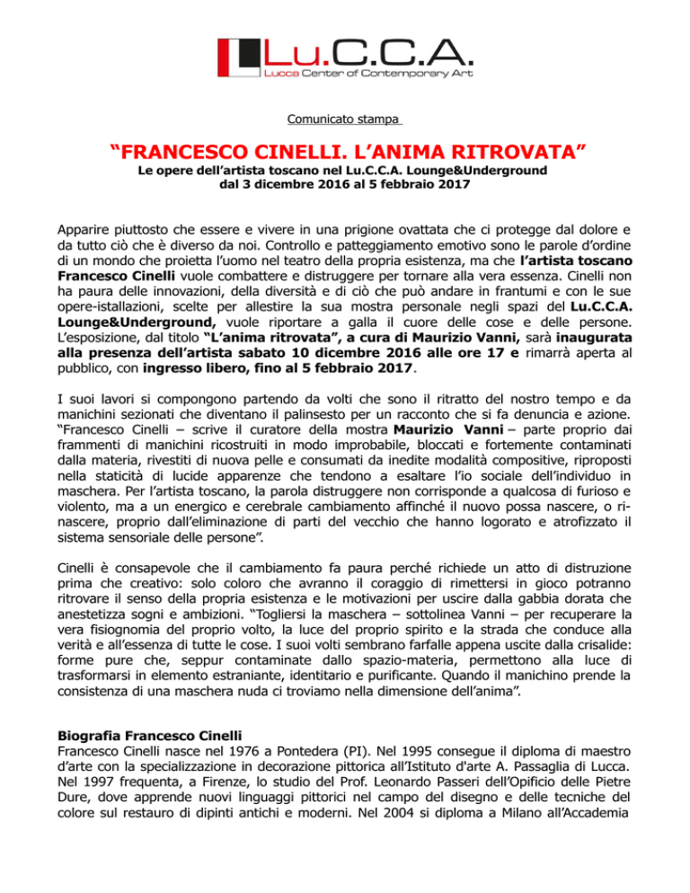 Comunicato stampa “FRANCESCO CINELLI. L’ANIMA RITROVATA” Le opere dell’artista toscano nel Lu.C.C.A. Lounge&Underground dal 3 dicembre 2016 al 5 febbraio 2017 Apparire piuttosto che essere e vivere in una prigione ovattata che ci protegge dal dolore e da tutto ciò che è diverso da noi. Controllo e patteggiamento emotivo sono le parole d’ordine di un mondo che proietta l’uomo nel teatro della propria esistenza, ma che l’artista toscano Francesco Cinelli vuole combattere e distruggere per tornare alla vera essenza. Cinelli non ha paura delle innovazioni, della diversità e di ciò che può andare in frantumi e con le sue opere-istallazioni, scelte per allestire la sua mostra personale negli spazi del Lu.C.C.A. Lounge&Underground, vuole riportare a galla il cuore delle cose e delle persone. L’esposizione, dal titolo “L’anima ritrovata”, a cura di Maurizio Vanni, sarà inaugurata alla presenza dell’artista sabato 10 dicembre 2016 alle ore 17 e rimarrà aperta al pubblico, con ingresso libero, fino al 5 febbraio 2017. I suoi lavori si compongono partendo da volti che sono il ritratto del nostro tempo e da manichini sezionati che diventano il palinsesto per un racconto che si fa denuncia e azione. “Francesco Cinelli – scrive il curatore della mostra Maurizio Vanni – parte proprio dai frammenti di manichini ricostruiti in modo improbabile, bloccati e fortemente contaminati dalla materia, rivestiti di nuova pelle e consumati da inedite modalità compositive, riproposti nella staticità di lucide apparenze che tendono a esaltare l’io sociale dell’individuo in maschera. Per l’artista toscano, la parola distruggere non corrisponde a qualcosa di furioso e violento, ma a un energico e cerebrale cambiamento affinché il nuovo possa nascere, o rinascere, proprio dall’eliminazione di parti del vecchio che hanno logorato e atrofizzato il sistema sensoriale delle persone”. Cinelli è consapevole che il cambiamento fa paura perché richiede un atto di distruzione prima che creativo: solo coloro che avranno il coraggio di rimettersi in gioco potranno ritrovare il senso della propria esistenza e le motivazioni per uscire dalla gabbia dorata che anestetizza sogni e ambizioni. “Togliersi la maschera – sottolinea Vanni – per recuperare la vera fisiognomia del proprio volto, la luce del proprio spirito e la strada che conduce alla verità e all’essenza di tutte le cose. I suoi volti sembrano farfalle appena uscite dalla crisalide: forme pure che, seppur contaminate dallo spazio-materia, permettono alla luce di trasformarsi in elemento estraniante, identitario e purificante. Quando il manichino prende la consistenza di una maschera nuda ci troviamo nella dimensione dell’anima”. Biografia Francesco Cinelli Francesco Cinelli nasce nel 1976 a Pontedera (PI). Nel 1995 consegue il diploma di maestro d’arte con la specializzazione in decorazione pittorica all’Istituto d'arte A. Passaglia di Lucca. Nel 1997 frequenta, a Firenze, lo studio del Prof. Leonardo Passeri dell’Opificio delle Pietre Dure, dove apprende nuovi linguaggi pittorici nel campo del disegno e delle tecniche del colore sul restauro di dipinti antichi e moderni. Nel 2004 si diploma a Milano all’Accademia Vetrinistica Italiana. Inizia a lavorare nel campo del fashion-design e della vetrinistica. Si avvicina al mondo del teatro, seguendo stage di performance e di scenografia teatrale al Centro Arti Performative Elan Frantoio di Fucecchio (FI). Nel 2005 segue corsi di decorazione pittorica del Prof. Alberto Garutti all’Accademia di Brera (MI). Nel 2010 viene menzionato come artista italiano, al “Premio Internazionale Limen Arte”, alla Camera di Commercio di Vibo Valentia, dallo storico e critico d’arte Giorgio Di Genova. Nel 2011 il critico d’arte Nicola Micieli lo seleziona tra i cinquanta artisti toscani al Museo Galleria d’Arte Moderna e Contemporanea Raffaele De Grada di San Gimignano (SI). Segue master di scenografia teatrale all’Accademia Sperimentale di Regia a Bellusco (MB). Sempre in questo anno, pubblica il suo primo lavoro monografico La scatola nera della nostra vita (Petrartedizioni). Nel 2013 espone al Museo d’Arte e Scienza di Milano alla prima edizione di Otto Sguardi d’Autore curata da Alberto Moioli per l’Enciclopedia d’Arte Italiana. Nel 2014 partecipa alla rassegna d’arte contemporanea Imagine 2014. Le sue opere sono esposte insieme a quelle di artisti come Andy Warhol, Roy Lichtenstein, Mario Schifano, Tano Festa, Marco Lodola ed altri importanti interpreti del panorama artistico italiano. Nel 2015 è presente alla mostra d’arte contemporanea L’arte e il tempo, evento ufficiale di Milano Expo 2015, al Palazzo Giureconsulti a Milano. Al “Premio Internazionale Limenarte 2015” partecipa all’evento di inaugurazione in qualità di artista-scenografo, ideando una performance dal titolo Legalità: Contaminazioni di luce e movimento . Alcune sue opere sono state acquisite dal Museo Galleria d’arte Moderna e Contemporanea Raffaele De Grada di San Gimignano e dal Museo d’arte Contemporanea della Camera di Commercio di Vibo Valentia (Polo Museale della Regione Calabria). Si contano diverse pubblicazioni tra cui Premio Internazionale Limenarte 2010 (Romano Arti Grafiche), Ricognizione Toscana (Bandecchi e Vivaldi), Enciclopedia d’Arte Italiana (Edizioni Enciclopedia d’Arte Italiana), Spoleto International Art Fair 2013 (Editoriale Giorgio Mondadori), Analisi critica. Dalla tradizione classica al fascino dell’avanguardia (Edizioni Il quadrato), Imagine 2014 (Industria Grafica Valdarnese), Percorsi d’arte in Italia (Rubettino Editore), Le scelte di Puntelli. Il tempo infinito dell’arte (Editoriale Giorgio Mondadori), L’arte e il Tempo (Editoriale Giorgio Mondadori), Premio Internazionale Limenarte 2015 (Romano Arti Grafiche). MOSTRA “FRANCESCO CINELLI. L’ANIMA RITROVATA” Lu.C.C.A. Lounge&Underground dal 3 dicembre 2016 al 5 febbraio 2