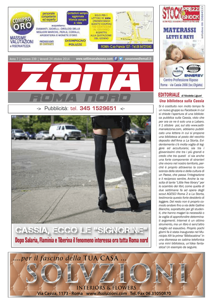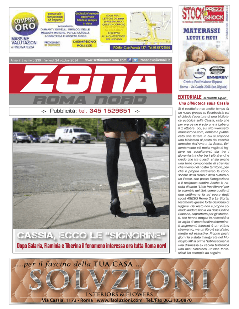 Anno 7 | numero 239 | Venerdì 24 ottobre 2014 www.settimanalezona.com [email protected] ROMA NORD -> Pubblicità: tel. 345 1529651 <- CASSIA, ecco le “SIGNORINE” Dopo Salaria, Flaminia e Tiberina il fenomeno interessa ora tutta Roma nord EditorialE di Nicoletta Liguori Una biblioteca sulla Cassia Si è costituito non molto tempo fa un nuovo gruppo su Facebook in cui si chiede l’apertura di una biblioteca pubblica sulla Cassia, visto che per ora ce ne è solo una a Labaro. Il 1 ottobre poi, sul sito www.settimanalezona.com, abbiamo pubblicato una lettera in cui si propone una biblioteca al posto del vecchio deposito dell’Ama a La Storta. Evidentemente c’è molta voglia di leggere ed acculturarsi, sia tra i giovanissimi che tra i più grandi e credo che tra questi ci sia anche una forte componente di stranieri che vivono nel nostro territorio, perché è proprio attraverso la conoscenza della storia e della cultura di un Paese, che passa l’integrazione e il reciproco sentire. Anche la nascita di tante “Little free library” per lo scambio dei libri, come quella di due settimane fa ad opera degli scout AGESCI Roma 2 a La Storta, testimonia questo forte desiderio di leggere. Del resto non è proprio comodo andare fino a via delle Galline Bianche, soprattutto per gli studenti, che hanno magari la necessità o la voglia di approfondire determinati argomenti. Internet è un ottimo strumento, ma un libro è senz’altro meglio ed esaustivo. Proprio pochi giorni fa è stata inaugurata nel Municipio XIV la prima “Bibliocabina” in una dismessa ex cabina telefonica una mini biblioteca, un’idea fantastica! Un esempio da seguire. 2 Cassia ROMA NORD “lucciole” sulla cassia Dopo Salaria, Flaminia, Tiberina e Aurelia, le “passeggiatrici” provano ad arrivare anche qui a cura della REDAZIONE E ra l’unica via consolare di Roma dove ancora non era presente il fenomeno prostituzione su strada, ma dallo scorso fine settimana possiamo dirlo: anche sulla Cassia “si batte il marciapiede”. Dopo Salaria, Flaminia, Tiberina, Cassia bis e Aurelia, tutte interessate da una massiccia presenza di “lucciole” la Cassia non poteva resistere ancora a lungo. Le prostitute sono apparse le sere di venerdì e sabato all’altezza dello svincolo del Grande Raccordo Anulare (uscita Cassia), sulle piazzole di sosta presenti sul posto. Per ora le ragazze erano due, ci vengono descritte dai numerosi lettori che ci hanno contattato come giovanissime, probabilmente appena ventenni vestite in abiti molto succinti. Sono intervenute anche le forze dell’ordine, per cercare di smorzare subito il fenomeno, ma le pattuglie di Carabinieri e Polizia ben poco hanno potuto fare. Le signorine sono state caricate in macchina per il “fotosegnalamento” in Caserma, ma poco dopo rilasciate ed esse sono poi infatti tornare repentinamente sul “luogo di lavoro”. La prostituzione infatti per lo Stato italiano non è reato. La procedura vuole che quando si voglia procedere all'identificazione di una prostituta straniera, si attua appunto il previsto fotosegnalamento, ma non si può impedire che le meritrici tornino a "lavorare". Nei loro confronti si può quindi agire penalmente solo per "atti osceni in luogo pubblico" oppure nei confronti di terzi per "favoreggiamento e/o sfruttamento della prostituzione". Nel primo caso occorre che le forze dell’ordine si imbattano in tempo reale in un comportamento osceno da parte della “lucciola” oppure sul luogo dell’atto sessuale mentre esso viene consumato sul suolo pubblico. Nel secondo caso solo dopo spesso lunghe indagini si arriva ad individuare gli eventuali sfruttatori, spesso senza la collaborazione delle ragazze, intimorite o poco inclini a confidare in un aiuto esterno. Oltre al già citato imbocco del raccordo anulare altre “passeggiatrici” sono state avvistate anche su un altro tratto di Cassia, sempre con il buio, nei pressi del nuovo benzinaio tra La Giustiniana e La Castelluccia. Le segnalazioni in questo caso erano arricchite dal particolare che le ragazze in questione erano provviste di macchina, pronte a spostarsi da un luogo all’altro se fosse stato necessario. Il caso della Cassia arriva dunque a chiudere il “cerchio” della prostituzione alla periferia di Roma nord, con, lo dicevamo, una via Salaria ormai definita “strada del sesso” a tutte le ore, una Flaminia interessata dal fenomeno proprio a pochi passi dalla sede istituzionale del XV Municipio la notte, e una via Tiberina che sia nella parte più attigua a Prima Porta e sia nella parte di competenza dei comuni di Riano e Fiano Romano pullula di meretrici già in pieno giorno, sia est europee che africane, alla mercè di clienti sempre più numerosi. Scaduta infatti l’ordinanza dell’ormai ex sindaco Alemanno, il nuovo Primo Cittadino non ha rinnovato alcuna sanzione straordinaria per le prostitute. C’è da dire che esse, quando erano in vigore, fungevano davvero poco da deterrente in quanto le prostitute si definivano nullatenenti e dunque non pagavano mai alcuna contravvezione che la Polizia Municipale gli contestava. Interessante il recente caso del vicino Comune di Fiumicino. Il locale sindaco ha istituito una multa di ben 450 euro per i clienti sorpresi anche solo a parlare con le “lucciole”. Forse il miglior provvedimento per contrastare il fenomeno, perché va a colpire direttamente e duramente là dove fa più male. Al portafoglio. 4 XV Municipio ROMA NORD Elettrosmog, MALE UTILE? Dibattito pubblico in Municipio sull’inquinamento elettromagnetico a Roma nord. Riflessioni di ELEONORA CAPRI G iovedì 23 ottobre, presso la sala del Consiglio del Municipio XV si è tenuto un dibattito pubblico sul tema dell'inquinamento elettromagnetico. Interverranno esperti, rappresentanti istituzionali, comitati e movimenti, stampa. Un'ottima occasione per approfondire e confrontarsi su un tema attuale, delicato e di cui si parla poco. Il Consiglio del Municipio Roma XV h