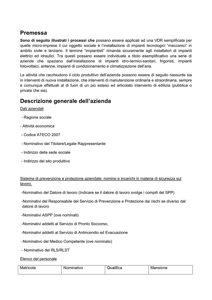 Premessa Sono di seguito illustrati i processi che possano essere applicati ad una VDR semplificata per quelle micro-imprese il cui oggetto sociale è l’installazione di impianti tecnologici “meccanici” in ambito civile e terziario. Il termine “impiantisti” rimanda sicuramente agli installatori di impianti elettrici ed idraulici. Tra questi possano essere individuate a titolo esemplificativo una serie di aziende che spaziano dall’installazione di impianti idro-termici-sanitari, frigoristi, impianti fotovoltaici, antenne, impianti di condizionamento e climatizzazione dell’aria. Le attività che racchiudono il ciclo produttivo dell’azienda possono essere di seguito riassunte sia in interventi di nuova installazione, che interventi di manutenzione ordinaria e straordinaria, sempre e comunque effettuati al di fuori di un più esteso ed articolato intervento di edilizia (pubblica o privata che sia). Descrizione generale dell’azienda Dati aziendali - Ragione sociale - Attività economica - Codice ATECO 2007 - Nominativo del Titolare/Legale Rappresentante - Indirizzo della sede sociale - Indirizzo del sito produttivo Sistema di prevenzione e protezione aziendale: nomine e incarichi in materia di sicurezza sul lavoro. -Nominativo del Datore di lavoro (Indicare se il datore di lavoro svolge i compiti del SPP) -Nominativi del Responsabile del Servizio di Prevenzione e Protezione dai rischi se diverso dal datore di lavoro -Nominativi ASPP (ove nominati) -Nominativi addetti al Servizio di Pronto Soccorso, -Nominativi addetti al Servizio di Antincendio ed Evacuazione -Nominativo del Medico Competente (ove nominato) - Nominativo del RLS/RLST Elenco del personale Matricola Nominativo Qualifica Mansione Ciclo produttivo Presso l’unità locale dell’azienda avviene la gestione commerciale, tecnica e logistica dell’insieme delle attività di installazione e manutenzione (ordinaria e straordinaria) generalmente effettuate presso le sedi dei clienti. Presso le sedi sono anche eseguite attività di officina, se presente nell’unità locale, come ad esempio riparazione conto terzi di attrezzature di lavoro o realizzazione di pezzi speciali (staffe, elementi saldati, ecc.). Le fasi che compongono il ciclo lavorativo sono: - Attività di sopralluogo presso il cliente (civili abitazioni e/o terziario). - Attività di magazzino e carico / scarico materiale da automezzi - Attività di officina (Riparazione/Manutenzione/Pulizia di attrezzature di lavoro conto terzi presso la sede) - Conduzione automezzi - Attività di installazione / realizzazione nuovi impianti e manutenzione presso il cliente (civili abitazioni e/o terziario. Per le attività presso il cliente i luoghi di lavoro sono da identificare in maniera specifica in fase di pianificazione dell’intervento. Attività di sopralluogo presso il cliente (civili abitazioni e/o terziario) La realizzazione di interventi di manutenzione presso il cliente o la realizzazione di nuovi impianti coinvolge già dalle prime fasi (richieste preventivi/intervento) tutta l’organizzazione aziendale. Per quanto concerne le attività dei tecnici addetti ai sopralluoghi conoscitivi dei luoghi (presso le sedi dei clienti), questi rivestono un ruolo importante nella definizione dei dettagli che caratterizzeranno l’offerta da rimettere completa di riferimenti tecnici e di salute e sicurezza sul lavoro. Questa fase è di fondamentale importanza per la pianificazione successiva degli interventi. Queste tipologie di intervento necessitano di regole comportamentali che coinvolgono, oltre all’operatore addetto, anche gli altri membri dell’organizzazione che fanno da filtro alla richiesta di intervento (generalmente gli uffici o responsabili aziendali). Risulta importante prevedere già dalla richiesta di intervento la tipologia di lavoro da eseguire, in particolare per quanto concerne le condizioni che caratterizzano il luogo, come: - Disponibilità della documentazione tecnica (fascicolo tecnico dell'edificio, progetti, certificazioni, ecc.) - Accessibilità del luogo di intervento; - Requisiti strutturali dell'edificio, accessibilità, resistenza solai, presenza aperture nel vuoto, lucernari, ecc. L’incaricato del sopralluogo non dovrà accedere sulle coperture degli edifici o in luoghi sopraelevati in assenza di opere provvisionali o dispositivi di protezione che proteggano dalla caduta dall’alto. L'incaricato del sopralluogo dovrà compilare il modulo di sopralluogo e dovrà valutare il rischi caduta dall'alto prendendo in esame: Fascicolo tecnico dell'edificio; sistemi di accesso alla copertura o in quota; praticabilità della copertura; presenza di opere provvisionali (ponteggio ecc) presenza punti di ancoraggio. 1 Fasi del ciclo produttivo 2 3 4 5 6 Attrezzature di Materie prime, Mansioni/ Descrizione Area/ semilavorati e Postazioni Fasi Reparto/Lu lavoro – macchine, ogo di apparecchi, utensili, sostanze impiegati ed impianti (di e prodotti. lavoro produzione e Scarti di servizio) lavorazione Sopralluog Vedi sopra c/o Cliente Da compilare da Da compilare da Datore di o parte del datore di parte del datore di lavoro lavoro lavoro Operaio installatore Esempio Mezzi di trasporto Scale opere provvisionali strumenti di misura trapano avvitatore ecc………. Attività di magazzino e carico e scarico materiale da automezzi Gli addetti al magazzino dovranno gestirne la logistica, che si divide in recepimento ed invio delle merci tramite terzi o con mezzi aziendali, organizzazione degli scaffali e delle zone di deposito individuate nelle aree di pertinenza aziendale (interne o esterne). Gli addetti al magazzino si troveranno quindi ad operare generalmente all’interno dell’unità locale utilizzando attrezzature di sollevamento e movimentazione carichi (carrelli elevatori, trans pallet, ecc) ed attrezzature per raggiungere ripiani in quota degli scaffali (scale semplici, doppie, ecc.). 1 2 3 Fasi del ciclo produttivo Descrizione Fasi Area/ Magazzi