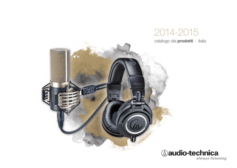 2014-2015 catalogo dei prodotti I italia Mx-Series 1 Messaggio del presidente Gentile cliente europeo, sono lieto di darti il benvenuto e di poterti presentare la nostra offerta di prodotti per il 2014. Mentre scrivo questo messaggio, i membri del nostro team sono impegnati in Russia, in occasione dei giochi invernali, per dare il loro supporto all’utilizzo dei 4.000 microfoni AudioTechnica. Sono immensamente orgoglioso di questo nostro continuo coinvolgimento in uno degli eventi più prestigiosi a livello mondiale – quello russo è il nono per Audio-Technica – e del fatto che i nostri prodotti sono stati scelti per diffondere i giochi a livello mondiale. I primi prodotti che troverai nel nostro catalogo 2014 sono le nuove cuffie professionali da studio: M50x, M40x, M30x ed M20x. Gli ingegneri di Audio-Technica hanno lavorato sodo nel progettare questa linea di cuffie, partendo dal successo che già avevano ottenuto con il precedente modello M50. Seguendo i suggerimenti dei nostri clienti abbiamo fornito i modelli M50x ed M40x di cavi staccabili di diverso tipo. Ci siamo, inoltre, impegnati per creare una linea con un tratto distintivo, e } …grazie per la vostra costante fedeltà al nostro marchio. Mi auguro vivamente di poter continuare a lavorare insieme per soddisfare le vostre aspettative sia ~ nell’immediato che nel prossimo futuro. siamo certi che le cuffie da studio Audio-Technica sapranno soddisfare le richieste e le aspettative di tutti. Troverai anche un nuovo prodotto che io reputo estremamente interessante perché contribuirà a diffondere ulteriormente il marchio Audio-Technica tra gli utenti: il sistema radiomicrofonico per chitarra “stompbox” System 10. Il radiomicrofono System 10, che lavora sulla fascia di frequenza dei 2,4 GHz, è diventato molto popolare sin dal momento della sua introduzione sul mercato e, portare questa tecnologia a molti altri utenti e per tante altre applicazioni continua ad essere il nostro obiettivo principale. Per concludere, voglio ringraziare sia i nuovi clienti Audio-Technica per il tempo che vorranno dedicare ad informarsi in merito ai nostri prodotti, che i clienti ed i partner europeei consolidati: grazie per la vostra costante fedeltà al nostro marchio. Mi auguro vivamente di poter continuare a lavorare insieme per soddisfare le vostre aspettative sia nell’immediato che nel prossimo futuro. Cordiali saluti. Kazuo Matsushita Presidente Audio-Technica Corporation www.audio-technica.com Supporto ¬ ¬ ¬ ¬ ¬ Utilizzo dei microfoni Una breve guida ai microfoni Suggerimenti rapidi per i microfoni senza filo Informazioni fondamentali sui microfoni senza filo Informazioni approfondite sui microfoni senza filo Download ¬ E ’ possibile scaricare dal nostro sito il catalogo europeo in 20 lingue, contenente le caratteristiche tecniche e le fotografie dell’intera gamma di prodotti ¬ Download foto dei prodotti con risoluzione 300 dpi ¬ D ownload della documentazione dei prodotti in formato PDF (caratteristiche tecniche, manuali, brochure, ecc.) ¬ Download delle pubblicità Audio-Technica più recenti Novità ¬ ¬ ¬ ¬ Comunicati stampa Endorsement Audio-Technica Lancio prodotti Fiere & convention 3 5 _Cuffie Cuffie di precisione da studio Cuffie ed auricolari 15 _Microfoni da studio Serie 50 Serie 40 Serie 20 39 _Microfoni per concerti Artist Elite ® Serie Artist 51 _Microfoni multi-uso indice Serie Pro Midnight Blues® Serie ATR 63 _Microfoni per broadcast & produzione Microfoni a fucile mono & stereo BP896 Microfono MicroPoint ® BP892 Microfono MicroSet ® BP893 Microfono MicroEarset ® BP894 Microfono MicroSet ® Microfoni sub-miniaturizzati Lavalier con clip Microfoni stereo, a mano, a collo d’oca Schermi antivento 85 _Microfoni per installazioni UniPoint ® ProPoint ® Engineered Sound Mixer automatici SmartMixer ® _Sistema per conferenze a infrarossi 105 ATCS-60 _Radiomicrofoni ed accessori IEM System Serie Artist Elite ® 5000 Serie Artist Elite ® 4000 Serie 3000b Serie 2000a System 10 - Stompbox Wireless Essentials® Accessori per microfoni senza filo _Giradischi, accessori Giradischi HiFi - Dj Alimentatori, moduli di alimentazione, UniTools ®, attenuatori Supporti per microfoni Schermi anti-vento Tabella degli accessori Elenco alfanumerico dei prodotti Condizioni, politiche di vendita & garanzia limitata 113 133 144-147 148-150 cuffie da studio, per dj, headset stereo 5 cuffie monitor da studio I professionisti dell’audio, i recensori on line e i fan sono concordi nel ritenere che l’ATH-M50 offra una combinazione ineguagliata fra prestazioni audio e qualità costruttiva, sia per l’uso in studio che sul campo. Questa stessa formula vincente è ora rappresentata nella nuova gamma di cuffie della Serie M, con un modello perfettamente adatto ad ogni ascolto esigente. I padiglioni auricolari sagomati si adattano meglio e forniscono un’eccellente isolamento sonoro. L’alta qualità del materiale utilizzato conferisce maggiore comfort e robustezza. Con il loro audio dettagliato e la comodità d’utilizzo, le cuffie professionali della Serie M assolvono egregiamente al loro dovere, ora dopo ora, anno dopo anno. pagine 6 - 9 cuffie per dj Una selezione di cuffie per applicazioni DJ, che offre eccezionali prestazioni sonore e comfort in qualsiasi ambiente. pagine 10 & 11 headset stereo per utilizzi broadcast Creati appositamente per news on-air e trasmissioni sportive, annunci e interviste, questo headset stereo di costruzione molto robusta offre una riproduzione vocale estremamente naturale, altamente intelligibile e precisa, disponendo di padiglioni auricolari avvolgenti per isolare dal rumore di fondo e di un microfono dinamico di alta potenza, montato su un braccio flessibile a collo d’oca. pagina 12 & 13 Il cantautore Ben Montague 7 headphones cuffie monitor professionali (PC 245-MC 320) ATH-M50x Cuffie monitor professionali da studio Questo è Il modello della Serie M più acclamato dalla critica ed