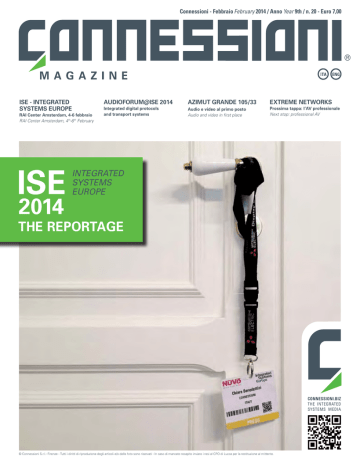 Connessioni - Febbraio February 2014 / Anno Year 9th / n. 20 - Euro 7,00 ISE - INTEGRATED SYSTEMS EUROPE RAI Center Amsterdam, 4-6 febbraio RAI Center Amsterdam, 4th-6th February ISE 2014 AUDIOFORUM@ISE 2014 AZIMUT GRANDE 105/33 EXTREME NETWORKS Integrated digital protocols and transport systems Audio e video al primo posto Audio and video in first place Prossima tappa: l’AV professionale Next stop: professional AV INTEGRATED SYSTEMS EUROPE THE REPORTAGE CONNESSIONI.BIZ THE INTEGRATED SYSTEMS MEDIA © Connessioni S.r.l.- Firenze - Tutti i diritti di riproduzione degli articoli e/o delle foto sono riservati - In caso di mancato recapito inviare i resi al CPO di Lucca per la restituzione al mittente. Febbraio February 2014 / Anno Year 9th / n. 20 EDITORIALE COMMENT Come avrete notato, in questo numero si parla ancora di ISE… d’altronde, la scia di un evento di tale portata si propaga per diversi mesi a seguire, dato che le novità e tecnologie presentate danno spesso l’impronta a molti mesi dell’anno. Tuttavia, sulle prossime pagine troverete un report un po’ diverso da quello al quale i nostri lettori sono abituati: quest’anno trovate – in realtà è un po’ che sono state pubblicate – news e videointerviste solo sul nostro sito, nell’area eventi, in modo da offrirvi maggiore tempestività e flessibilità nell’informazione; sulle pagine della rivista invece troverete una “fotografia dall’alto” della fiera e dei suoi eventi collaterali, come AudioForum, battezzato felicemente in veste internazionale proprio a ISE. Quindi commenti, tendenze, numeri, contenuti della manifestazione; per leggere insieme l’evento come significativo dell’andamento del settore. E vedrete che c’è da ben sperare. Inoltre, vorrei aggiornarvi in merito a un progetto iniziato l’anno scorso, e che adesso riparte con maggiore ufficialità, nato con lo scopo di sostenere e diffondere il Made in Italy. Nell’autunno 2013 ci eravamo dedicati a costruire alcuni percorsi pensati per le aziende italiane che desiderano essere presenti, o più presenti, all’estero, e proprio a inizio 2014 abbiamo quindi siglato un accordo con InfoComm Asia per aprire nuove strade verso Oriente e Medio Oriente. InfoComm Asia è infatti promotrice di tre manifestazioni espositive che si svolgono in Cina (Pechino) dal 9 all’11 aprile, in India a settembre (a Mumbai) e negli Emirati a ottobre; manifestazioni che possono costituire un canale di incontro con questi (più o meno) nuovi mercati e che le aziende costruttrici italiane, ma anche i progettisti e in generale i professionisti interessati a varcare i confini, possono prendere in considerazione come trampolino. InfoComm China avrà luogo tra poco, e non mancheremo di visitare la manifestazione e di farvene un report completo… ma è anche possibile formare un piccolo gruppo per visitare insieme la fiera. Per le fiere autunnali, invece, avremo il tempo e le risorse per proporvi molte più opzioni: come quella di partecipare a uno stand comune, organizzato da Connessioni, dedicato al Made in Italy e ai valori che rappresentano il nostro più importante patrimonio. Uno spazio ideale e reale che diventerà quindi il luogo dell’eccellenza italiana con tante attività redazionali, comunicazionali e B2B. Vi terremo aggiornati sugli sviluppi… intanto buona lettura! www.connessioni.biz Chiara Benedettini President & Editor in Chief As you will have noticed, in this issue we still talk about ISE... It is understandable: events of this size leave a long trail that lasts for months, as the novelties and technologies presented will often cause trends that cover several months of the year. However, on the next pages you will find a report that is somewhat different from those our readers are used to: this year you will find – they were actually published a while ago – news and video interviews exclusive for our site, in the Events area, to offer you more recent and flexible information. On some pages of the magazine you will see an “aerial view” of the fair and its collateral events, such as AudioForum, happily christened as an international event right here at ISE: And comments, trends, figures, contents of the event, to read together the event as a significant thermometer of how the market is doing. And there is much to hope for, as you shall see. In addition, I would like to give you an update on a project we started last year and that is now more official. It was born with the purpose of supporting and spreading the Made in Italy. In the autumn of 2013 we had dedicated to building itineraries for Italian companies that wished to be present, or more present, abroad, and in the beginning of 2014 we made an agreement with InfoComm Asia to make sure that some international events became more well-known in the Italian market. InfoComm Asia is in fact the promoter of three exhibitions that take place in China (Beijing), from 9th to 11th April, in India (Mumbai), in September, and in the Arab Emirates in October. These events may become a meeting place with these (more or less) new markets, a meeting place that Italian manufacturers, designers and professionals interested in working abroad can take into consideration. InfoComm China is upon us, and we will surely be there to give you a full report. If you are interested it is also possible to form a small group to visit the fair together. Regarding the autumn events, we will have plenty of time and resources to give you more options: you can also participate with a shared stand organised by Connessioni dedicated to Made in Italy and the values that represent our most important heritage. The place of Italian excellence, with several press, communication and B2B activities. We will keep you posted! And meanwhile... Have a good reading! 1 INFO INTERAGIRE CON IL SISTEMA CONNESSIONI Aziende citate Mentioned companies 3P Technologies Focusrite Abb Gammalta AES Harman ALC Networx InAVate Audinate InfoComm INTERA