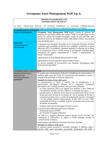 Groupama Asset Management SGR S.p.A. PROSPETTO SEMPLIFICATO INFORMAZIONI GENERALI La parte “Informazioni Generali” del Prospetto Semplificato, da consegnare obbligatoriamente all’investitore prima della sottoscrizione, è volta ad illustrare le informazioni generali sull’offerta. INFORMAZIONI GENERALI Groupama Asset Management SGR S.p.A., società di gestione del SOCIETÀ DI GESTIONE risparmio di nazionalità italiana (di seguito “SGR”) con sede legale in Via Savoia 23, società del Gruppo Groupama, iscritta al n.86 dell’Albo delle Società di Gestione del Risparmio tenuto dalla Banca d’Italia. Sito Internet www.groupama-sgr.it PROPOSTE Le proposte d’investimento finanziario di cui al presente Prospetto d’offerta D’INVESTIMENTO consistono nella possibilità di sottoscrivere, mediante versamento in Unica FINANZIARIO Soluzione (PIC) e/o mediante versamenti periodici in adesione ad un Piano di Accumulazione (PAC), i fondi comuni di investimento mobiliare aperti armonizzati (di seguito congiuntamente “i Fondi” e singolarmente “il Fondo”) denominati: GROUPAMA ITALIA BOND SELECTION FUNDS GROUPAMA ITALIA EQUITY SELECTION FUNDS Le diverse proposte di investimento sono illustrate nell’apposita parte “Informazioni Specifiche”. INFORMAZIONI AGGIUNTIVE Di seguito sono sinteticamente indicate le modalità per la sottoscrizione e il INFORMAZIONI SULLE rimborso delle quote dei Fondi. Per informazioni più puntuali in merito si MODALITÀ DI rimanda al Regolamento di Gestione degli stessi. SOTTOSCRIZIONE E RIMBORSO Modalità di sottoscrizione delle quote La partecipazione ai Fondi si realizza con la compilazione e la sottoscrizione dell’apposito Modulo ed il contestuale versamento dell’importo che si intende investire e che può essere effettuato: – in Unica Soluzione (PIC) con importi non inferiore a euro 5.000 per l’investimento iniziale e ad euro 1.000 per i versamenti successivi, o – periodicamente in adesione ad un Piano di Accumulazione (PAC) la cui durata può essere fissata tra un minimo di 5 ed un massimo di 20 anni. I versamenti possono essere, a scelta del partecipante, mensili o trimestrali e la rata unitaria minima rispettivamente di euro 300 e di euro 1.000, aumentabili di 25 Euro o multipli. Il primo versamento dovrà essere pari ad almeno un’annualità; – mediante operazioni di passaggio tra Fondi (switch). La sottoscrizione delle quote può essere effettuata: – direttamente presso la SGR; – per il tramite di soggetti collocatori. La SGR e/o i soggetti collocatori possono attivare servizi “on line” che consentono al sottoscrittore di aderire ai Fondi mediante tecniche di comunicazione a distanza. Il partecipante può effettuare versamenti successivi al primo. Modalità di rimborso delle quote In qualsiasi giorno lavorativo è possibile richiedere il rimborso totale o parziale delle quote possedute presentando direttamente alla SGR o Pagina 1 di 3 inviando per il tramite dei soggetti incaricati del collocamento apposita domanda. Per informazioni di maggior dettaglio circa le modalità di sottoscrizione e rimborso delle quote si rimanda alla Sezione D) della Parte I del Prospetto Completo. SWITCH E VERSAMENTI SUCCESSIVI DIRITTO DI RECESSO ULTERIORE INFORMATIVA DISPONIBILE Il partecipante può effettuare versamenti successivi e operazioni di passaggio tra fondi (c.d. switch) illustrati nel presente Prospetto d’offerta. Tale facoltà vale anche nei confronti dei Fondi inseriti successivamente nel Prospetto purché sia stata consegnata al partecipante la relativa informativa tratta dal Prospetto d’offerta aggiornato. Ai sensi dell’art. 30, comma 6 del D.Lgs. 24 febbraio 1998, n. 58, l’efficacia dei contratti di collocamento di strumenti finanziari conclusi fuori sede è sospesa per la durata di sette giorni decorrenti dalla data di sottoscrizione da parte dell’investitore. Entro detto temine l’investitore può comunicare il proprio recesso senza spese né corrispettivo al soggetto incaricato del collocamento o al promotore finanziario. La sospensiva non riguarda le sottoscrizioni effettuate presso la sede legale o le dipendenze della SGR e del soggetto incaricato del collocamento né le successive sottoscrizioni (anche effettuate tramite operazioni di passaggio, c.d. switch) dei Fondi riportati nel Prospetto Completo. Per i fondi inseriti nel Prospetto Completo successivamente, la sospensiva non si applica se al partecipante siano stati preventivamente forniti la relativa parte “Informazioni specifiche” o il Prospetto Completo aggiornati con l’informativa relativa al Fondo oggetto della sottoscrizione. Il recesso e la sospensiva previsti dall’art. 67-duodecies del D.Lgs. 206/05 (“Codice del Consumo”) per i contratti conclusi a distanza con i consumatori, ossia persone fisiche che agiscono per fini estranei all’attività imprenditoriale, commerciale, artigianale o professionale eventualmente svolta (art. 3, comma 1, lettera a) del suddetto Codice) non si applicano alla sottoscrizione di quote di fondi comuni di investimento effettuate mediante tecniche di comunicazione a distanza in base alle previsioni del comma 5, lettera a), punto 4 del medesimo articolo. Sul sito internet della SGR www.groupama-sgr.it sono disponibili i seguenti documenti ed i successivi aggiornamenti: a) Prospetti Semplificati di tutti i Fondi disciplinati nell’ambito del medesimo Prospetto Completo; b) Parti I, II e III del Prospetto Completo; c) Regolamento di gestione dei Fondi; d) ultimi documenti contabili redatti (rendiconto annuale e relazione semestrale, se successiva); e) documento informativo in materia di incentivi, documento di sintesi sulla politica di gestione dei conflitti di interesse, documento descrittivo delle misure adottate per l’esecuzione e la trasmissione degli ordini su strumenti finanziari. I partecipanti hanno diritto di richiedere alla SGR l’invio gratuito, anche a domicilio, dei documenti indicati alle let