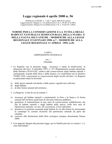 LR n 56-2000 Legge regionale 6 aprile 2000 n. 56 (Pubblicata sul BURT n. 17 del 17 aprile 2000 Parte prima) (Aggiornamento Allegato C1 con deliberazione C.R. n. 98 del 10-4-2001) (Aggiornamento Allegato D con deliberazione C.R. n. 18 del 29-1-2002) NORME PER LA CONSERVAZIONE E LA TUTELA DEGLI HABITAT NATURALI E SEMINATURALI, DELLA FLORA E DELLA FAUNA SELVATICHE - MODIFICHE ALLA LEGGE REGIONALE 23 GENNAIO 1998, n.7 - MODIFICHE ALLA LEGGE REGIONALE 11 APRILE 1995, n.49. CAPO I (DISPOSIZIONI GENERALI) Art. 1 (Finalità) 1. La Regione con la presente legge riconosce e tutela la biodiversità, in attuazione del d.p.r. 8 settembre 1997, n. 357 (Regolamento recante attuazione della Direttiva 92/43/CEE, relativa alla conservazione degli habitat naturali e seminaturali, nonché della flora e della fauna) e in conformità con la direttiva 79/409/ CEE, concernente la conservazione degli uccelli selvatici. La Regione in particolare tutela la diversità: a) delle specie animali selvatiche e delle specie vegetali non coltivate; b) degli habitat; c) di altre forme naturali del territorio. 2. La Regione ai fini di cui al comma 1: a) riconosce gli habitat naturali e seminaturali, la flora e la fauna e le forme naturali del territorio quali beni di rilevante interesse pubblico; b) garantisce il mantenimento in uno stato di conservazione soddisfacente, dei tipi di habitat naturali e degli habitat delle specie, nella loro area di ripartizione naturale, ovvero, all’occorrenza, il loro ripristino; c) promuove la gestione razionale degli habitat di cui alla lettera b) assicurando al contempo la corretta fruizione del patrimonio naturale da parte dei cittadini; d) concorre alla formazione della Rete ecologica europea, denominata Natura 2000. 3. Con appositi allegati alla presente legge, per le finalità previste ai commi 1 e 2, sono individuati: 1 LR n 56-2000 a) gli habitat naturali e seminaturali e le specie animali e vegetali di interesse regionale, la cui conservazione può richiedere la designazione di Siti di Importanza Regionale (SIR ) (allegato A); b) le specie animali protette ai sensi della presente legge (allegato B) e le specie animali soggette a limitazione nel prelievo (allegato B1); c) le specie vegetali protette ai sensi della presente legge (allegato C) e le specie vegetali soggette a limitazione nella raccolta (allegato C1) d) i Siti di Importanza Regionale (allegato D) comprendenti i Siti classificabili di Importanza Comunitaria (pSIC), le Zone di Protezione Speciale (ZPS), i Siti di Interesse Nazionale (SIN) e i Siti di Interesse Regionale (SIR) di cui alla deliberazione del Consiglio regionale 10 novembre 1998, n. 342 (Approvazione siti individuati nel progetto Biotaly e determinazioni relative all’attuazione della direttiva comunitaria “Habitat”). 4. I siti di cui all’allegato D nonché i Geotopi di Importanza Regionale (GIR), di cui all’art. 11, costituiscono risorse essenziali ai sensi dei commi 2 e 3 dell’art. 2 della Legge regionale 16 gennaio 1995, n. 5 (Norme per il governo del territorio), e vengono inseriti in quanto tali nell’ambito del quadro conoscitivo previsto dalla stessa legge regionale in relazione agli strumenti urbanistici da essa disciplinati. Gli elementi conoscitivi in tal modo individuati concorrono inoltre alla redazione della Carta della natura di cui al comma 3 dell’art. 3 della legge 6 dicembre 1991, n.394 (Legge quadro sulle aree protette), anche in conformità con gli atti statali di indirizzo. 5. La Regione persegue le finalità di cui alla presente legge tenendo conto delle esigenze economiche, sociali e culturali, sia regionali che locali, nel rispetto del principio dello sviluppo sostenibile. Art. 2 (Definizioni) 1. Ai sensi e per gli effetti della presente legge valgono le seguenti definizioni: a) area di collegamento ecologico funzionale: un’area che, per la sua struttura lineare e continua o per il suo ruolo di collegamento, è essenziale per la migrazione, la distribuzione geografica e lo scambio genetico di specie selvatiche; b) biodiversità: la variabilità degli organismi viventi di ogni origine, degli ecosistemi terrestri, marini ed acquatici ed i complessi ecologici di cui fanno parte; ivi inclusa la diversità nell’ambito delle specie, tra le specie e tra gli ecosistemi; c) conservazione in situ: un complesso di misure necessarie per mantenere o ripristinare gli habitat naturali o seminaturali e le popolazioni di flora e di fauna selvatiche in uno stato soddisfacente nonché il mantenimento e la ricostituzione delle popolazioni vitali di specie nel loro ambiente naturale, e nel caso di specie addomesticate e coltivate, nell’ambiente in cui hanno sviluppato le loro proprietà caratteristiche; d) conservazione ex situ: un complesso di misure necessarie per mantenere o ripristinare le popolazioni di flora e di fauna selvatiche in uno stato soddisfacente, attuate al di fuori del loro ambiente naturale; 2 LR n 56-2000 e) f) g) h) i) l) m) n) ecotipo: forma morfologicamente distinta entro una specie, prodotta dalla selezione naturale; geotopo di importanza regionale: forma naturale del territorio, di superficie o sotterranea, costituita da particolari emergenze geologiche, geomorfologiche e pedologiche, che presenta un rilevante valore ambientale, scientifico e didattico, la cui conservazione è strategica nell’ambito del territorio regionale; habitat naturali di interesse regionale: gli ambienti terrestri o acquatici che si distinguono per le loro caratteristiche geografiche, abiotiche o biologiche, interamente naturali o seminaturali, elencati nell’allegato A, per i quali nel territorio regionale si verifichi una delle seguenti condizioni: 1) rischino di scomparire nella loro area di distribuzione naturale; 2) abbiano un’area di distribuzione ridotta a seguito della loro regressione o per il fatto che la loro area è intrinsecamente ristretta; 3) costituiscano esempi notevoli di caratteristiche tipiche del territorio regi