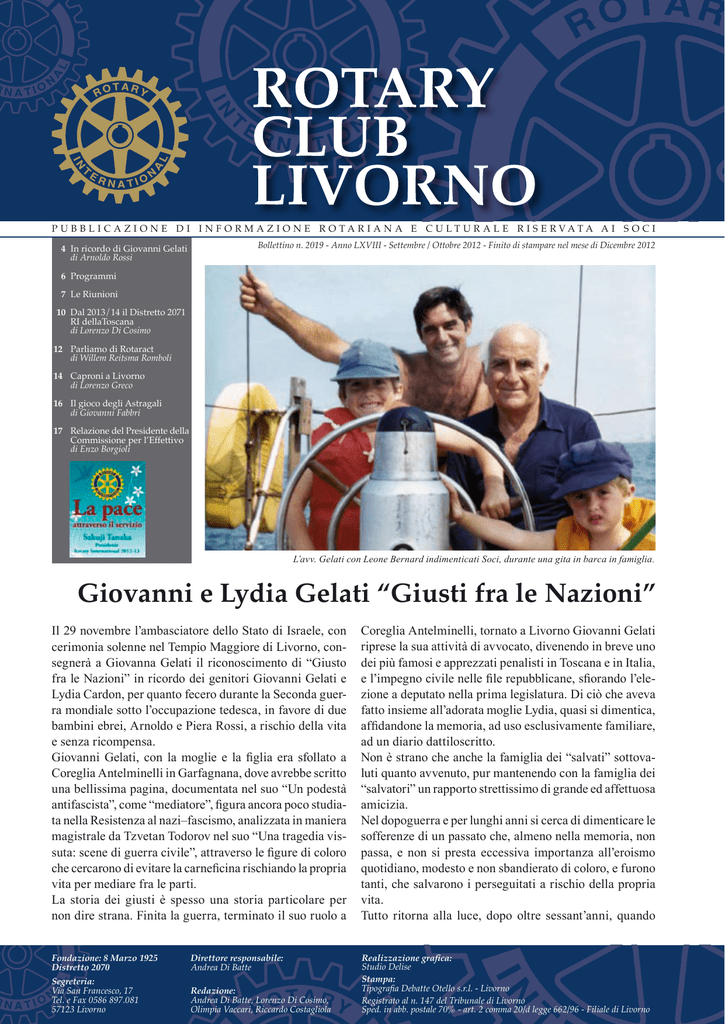 P u b b l i c a z i o n e d i i n f o r m a z i o n e r o ta r i a n a e c u lt u r a l e r i s e rvata a i S o c i 4 In ricordo di Giovanni Gelati di Arnoldo Rossi Bollettino n. 2019 - Anno lxVIII - Settembre / Ottobre 2012 - Finito di stampare nel mese di Dicembre 2012 6 Programmi 7 Le Riunioni 10Dal 2013/14 il Distretto 2071 RI dellaToscana di Lorenzo Di Cosimo 12 Parliamo di Rotaract di Willem Reitsma Romboli 14Caproni a Livorno di Lorenzo Greco 16Il gioco degli Astragali di Giovanni Fabbri 17Relazione del Presidente della Commissione per l’Effettivo di Enzo Borgioli L’avv. Gelati con Leone Bernard indimenticati Soci, durante una gita in barca in famiglia. Giovanni e Lydia Gelati “Giusti fra le Nazioni” Il 29 novembre l’ambasciatore dello Stato di Israele, con cerimonia solenne nel Tempio Maggiore di Livorno, consegnerà a Giovanna Gelati il riconoscimento di “Giusto fra le Nazioni” in ricordo dei genitori Giovanni Gelati e Lydia Cardon, per quanto fecero durante la Seconda guerra mondiale sotto l’occupazione tedesca, in favore di due bambini ebrei, Arnoldo e Piera Rossi, a rischio della vita e senza ricompensa. Giovanni Gelati, con la moglie e la figlia era sfollato a Coreglia Antelminelli in Garfagnana, dove avrebbe scritto una bellissima pagina, documentata nel suo “Un podestà antifascista”, come “mediatore”, figura ancora poco studiata nella Resistenza al nazi–fascismo, analizzata in maniera magistrale da Tzvetan Todorov nel suo “Una tragedia vissuta: scene di guerra civile”, attraverso le figure di coloro che cercarono di evitare la carneficina rischiando la propria vita per mediare fra le parti. La storia dei giusti è spesso una storia particolare per non dire strana. Finita la guerra, terminato il suo ruolo a Fondazione: 8 Marzo 1925 Distretto 2070 Segreteria: Via San Francesco, 17 Tel. e Fax 0586 897.081 57123 Livorno Direttore responsabile: Andrea Di Batte Redazione: Andrea Di Batte, Lorenzo Di Cosimo, Olimpia Vaccari, Riccardo Costagliola Coreglia Antelminelli, tornato a Livorno Giovanni Gelati riprese la sua attività di avvocato, divenendo in breve uno dei più famosi e apprezzati penalisti in Toscana e in Italia, e l’impegno civile nelle file repubblicane, sfiorando l’elezione a deputato nella prima legislatura. Di ciò che aveva fatto insieme all’adorata moglie Lydia, quasi si dimentica, affidandone la memoria, ad uso esclusivamente familiare, ad un diario dattiloscritto. Non è strano che anche la famiglia dei “salvati” sottovaluti quanto avvenuto, pur mantenendo con la famiglia dei “salvatori” un rapporto strettissimo di grande ed affettuosa amicizia. Nel dopoguerra e per lunghi anni si cerca di dimenticare le sofferenze di un passato che, almeno nella memoria, non passa, e non si presta eccessiva importanza all’eroismo quotidiano, modesto e non sbandierato di coloro, e furono tanti, che salvarono i perseguitati a rischio della propria vita. Tutto ritorna alla luce, dopo oltre sessant’anni, quando Realizzazione grafica: Studio Delise Stampa: Tipografia Debatte Otello s.r.l. - Livorno Registrato al n. 147 del Tribunale di Livorno Sped. in abb. postale 70% - art. 2 comma 20/d legge 662/96 - Filiale di Livorno Piera Rossi mi parla di un diario dell’avvocato Giovanni Gelati, di cui aveva potuto prendere visione con lo scopo di richiedere allo Stato italiano un risarcimento per le persecuzioni razziali. Scritto in un italiano scorrevole ed elegante, sin dalla prima lettura mi affascina per il suo contenuto e mi colpisce soprattutto l’episodio di aver accolto due bambini ebrei affidatigli da un amico, Cesarino Rossi, in fuga dalla caccia all’uomo dopo l’8 settembre da parte delle truppe tedesche. Dei sentimenti antifascisti e repubblicani di Giovanni Gelati, della sua amicizia per molte famiglie ebraiche di Livorno abbiamo numerose prove e testimonianze, compresa la titolarità della libreria di mio nonno Belforte, che non poteva più mantenerla a causa delle Leggi razziali del 1938; e anche della sua fede religiosa che si sarebbe poi sviluppata e approfondita successivamente. Giovanni Gelati, uomo di legge e di fede di fronte all’alternativa se obbedire ad una legge ingiusta degli uomini oppure alla legge naturale non ha il minimo dubbio. Quelli erano momenti terribili, nei quali non era più possibile non capire, sfuggire ad una scelta: girare la testa da un’altra parte era già uno scegliere. Dice il Talmud che chi salva una vita salva il mondo; salvando una vita non si salva solo una persona ma anche la sua discendenza nelle generazioni che verranno. Nel memoriale di Yad Vashem a Gerusalemme fra i sei milioni di vittime della barbarie nazista sono ricordati i nomi di un milione e mezzo di bambini innocenti ai quali è stata negata la vita e la possibilità di una discendenza. Giovanni e Lydia Gelati appartengono perciò a pieno titolo a quella schiera di giusti, la cui esistenza, in ogni genera- Giovanni Gelati, inverno 1943-44. A sinistra Giovanni Gelati con la figlia Giovanna e, a destra, Lydia Gelati con la figlia Giovanna. zione, assicura la salvezza del mondo. Ma chi sono i Giusti fra le Nazioni e perché è così importante questo riconoscimento? Presso il Memoriale di Yad Vashem a Gerusalemme è insediata la commissione dei Giusti, il primo organismo del Novecento che si sia occupato della memoria del bene compiuto durante un genocidio. Moshè Beiski, che ne era il presidente, ricercava in ogni angolo del mondo gli uomini che avevano rischiato la vita per aiutare gli ebrei durante le persecuzioni naziste. Ripeteva con ossessione agli amici: “Non volevo che un solo giusto fosse dimenticato da noi ebrei”. In realtà non era interessato alla perfezione degli esseri umani, alle motivazioni che li avevano spinti a salvare i loro simili. Voleva solo ricordare chi aveva tentato, di fronte ad un male estremo, autorizzato dalla legge degli uomini, di salvare anche una sola vita, chi era stato capace di comp