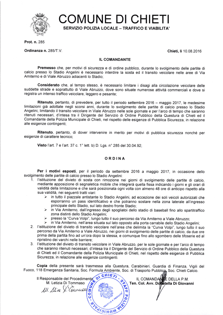 COMUNE DI CHIETI SERVIZIO POLIZIA LOCALE - TRAFFICO E VIABILITA' Prot. n.285 Ordinanza n.285/T.V. Chieti, li 10.08.2016 IL COMANDANTE Premesso che, per motivi di sicurezza e di ordine pubblico, durante lo svolgimento delle partite di calcio presso lo Stadio Angelini è necessario interdire la sosta ed il transito veicolare nelle aree di Via Amiterno e diViale Abruzzo adiacenti lo Stadio; Considerato che, al tempo stesso, è necessario limitare i disagi alla circolazione veicolare delle suddette strade e soprattutto di Viale Abruzzo, dove sono situate numerose attività commerciali e dove si registra un intenso traffico veicolare, leggero e pesante; Ritenuto, pertanto, di prevedere, per tutto il periodo settembre 2016 - maggio 2017, le medesime limitazioni già adottate negli scorsi anni, durante lo svolgimento delle partite di calcio presso lo Stadio Angelini, limitando il transito veicolare in Viale Abruzzo nelle sole giornate e per l'arco di tempo che saranno ritenuti necessari, d'intesa tra il Dirigente del Servizio di Ordine Pubblico della Questura di Chieti ed il Comandante della Polizia Municipale di Chieti, nel rispetto delle esigenze di Pubblica Sicurezza, in relazione alle esigenze contingenti; Ritenuto, pertanto, di dover intervenire in merito per motivi di pubblica sicurezza nonché per esigenze di carattere tecnico, Visto l'art. 7 e I'art. 37 c. 1' lett. b) D. Lgs. n" 285 del 30.04.92; ORDINA Per i motivi esposti, per il periodo da settembre 2016 a maggio 2017, in occasione dello svolgimento delle partite di calcio presso lo Stadio Angelini. 1. 2. 3. l'istituzione del divieto di sosta con rimozione nei giorni di svolgimento delle partite di calcio, mediante apposizione di segnaletica mobile che integrerà quella fissa indicando i giorni e gli orari di validità della limitazione e che sarà posizionata ogni volta con almeno 48 ore di anticipo rispetto alla sua validità, nei seguenti tratti viari: ', in tutto il piazzale antistante lo Stadio Angelini, ad eccezione dei soli veicoli autorizzati che esporranno un pass identificativo e che potranno sostare nella zona laterale all'ingresso principale dello Stadio, sul lato destro fronte Stadio; 'r in Via Amiterno, dall'ingresso degli spogliatoi dello stadio di baseball fino allo spartitraffico zona distinti dello Stadio Angelini; '/ presso la "Curva Volpi", lungo tutto il suo percorso da Via Amiterno a Viale Abruzzo; 'p in Via Amiterno, nell'area situata sul lato opposto alla porta carrabile dello Stadio Angelini; I'istituzione del divieto di transito veicolare nell'area che delimita la "Curva Volpi", lungo tutto il suo percorso da Via Amiterno a Viale Abruzzo, nei giorni di svolgimento delle partite di calcio, da due ore prima della partita fino ad un'ora dopo la stessa, e comunque fino allo sgombero delle tifoserie ed al ripristino dei varchi nelle barriere; I'istituzione del divieto di transito veicolare in Viale Abruzzo, per le sole giornate e per l'arco di tempo che saranno ritenuti necessari, d'intesa tra il Dirigente del Servizio di Ordine Pubblico della Questura di Chieti ed il Comandante della Polizia Municipale di Chieti, nel rispetto delle esigenze di Pubblica Sicurezza, in relazione alle esigenze contingenti. Copia della presente sarà trasmessa alla Questura, Carabinieri, Guardia di Finanza, Vigili del Fuoco, 118 Emergenza Sanitaria, Soc. Formula ll Responsabile del M. Letizia DiTommaso ill "dll*t § 0 r) te, Soc. diTrasporto r"n.è;;ii,: '%\ Soc. ChietiCalcio DELLA P.M DiGiovanni