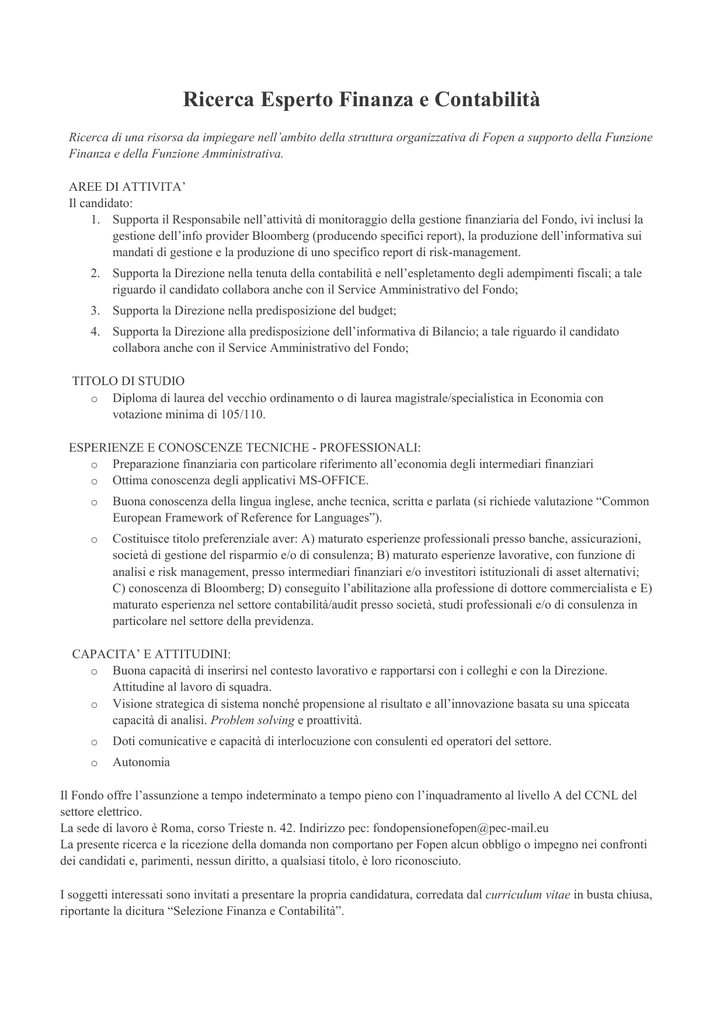Ricerca Esperto Finanza e Contabilità Ricerca di una risorsa da impiegare nell’ambito della struttura organizzativa di Fopen a supporto della Funzione Finanza e della Funzione Amministrativa. AREE DI ATTIVITA’ Il candidato: 1. Supporta il Responsabile nell’attività di monitoraggio della gestione finanziaria del Fondo, ivi inclusi la gestione dell’info provider Bloomberg (producendo specifici report), la produzione dell’informativa sui mandati di gestione e la produzione di uno specifico report di risk-management. 2. Supporta la Direzione nella tenuta della contabilità e nell’espletamento degli adempimenti fiscali; a tale riguardo il candidato collabora anche con il Service Amministrativo del Fondo; 3. Supporta la Direzione nella predisposizione del budget; 4. Supporta la Direzione alla predisposizione dell’informativa di Bilancio; a tale riguardo il candidato collabora anche con il Service Amministrativo del Fondo; TITOLO DI STUDIO o Diploma di laurea del vecchio ordinamento o di laurea magistrale/specialistica in Economia con votazione minima di 105/110. ESPERIENZE E CONOSCENZE TECNICHE - PROFESSIONALI: o Preparazione finanziaria con particolare riferimento all’economia degli intermediari finanziari o Ottima conoscenza degli applicativi MS-OFFICE. o Buona conoscenza della lingua inglese, anche tecnica, scritta e parlata (si richiede valutazione “Common European Framework of Reference for Languages”). o Costituisce titolo preferenziale aver: A) maturato esperienze professionali presso banche, assicurazioni, società di gestione del risparmio e/o di consulenza; B) maturato esperienze lavorative, con funzione di analisi e risk management, presso intermediari finanziari e/o investitori istituzionali di asset alternativi; C) conoscenza di Bloomberg; D) conseguito l’abilitazione alla professione di dottore commercialista e E) maturato esperienza nel settore contabilità/audit presso società, studi professionali e/o di consulenza in particolare nel settore della previdenza. CAPACITA’ E ATTITUDINI: o Buona capacità di inserirsi nel contesto lavorativo e rapportarsi con i colleghi e con la Direzione. Attitudine al lavoro di squadra. o Visione strategica di sistema nonché propensione al risultato e all’innovazione basata su una spiccata capacità di analisi. Problem solving e proattività. o Doti comunicative e capacità di interlocuzione con consulenti ed operatori del settore. o Autonomia Il Fondo offre l’assunzione a tempo indeterminato a tempo pieno con l’inquadramento al livello A del CCNL del settore elettrico. La sede di lavoro è Roma, corso Trieste n. 42. Indirizzo pec: [email protected] La presente ricerca e la ricezione della domanda non comportano per Fopen alcun obbligo o impegno nei confronti dei candidati e, parimenti, nessun diritto, a qualsiasi titolo, è loro riconosciuto. I soggetti interessati sono invitati a presentare la propria candidatura, corredata dal curriculum vitae in busta chiusa, riportante la dicitura “Selezione Finanza e Contabilità”. Le candidature dovranno pervenire presso la sede operativa del Fondo, in Corso Trieste, 42 – 00198 ROMA, a pena di esclusione, entro e non oltre le ore 12:00 del giorno 10 marzo 2017, tramite consegna a mano, corriere, PEC o raccomandata a/r (quest’ultima spedita entro il medesimo termine, facendo a tal fine fede la data del timbro postale).