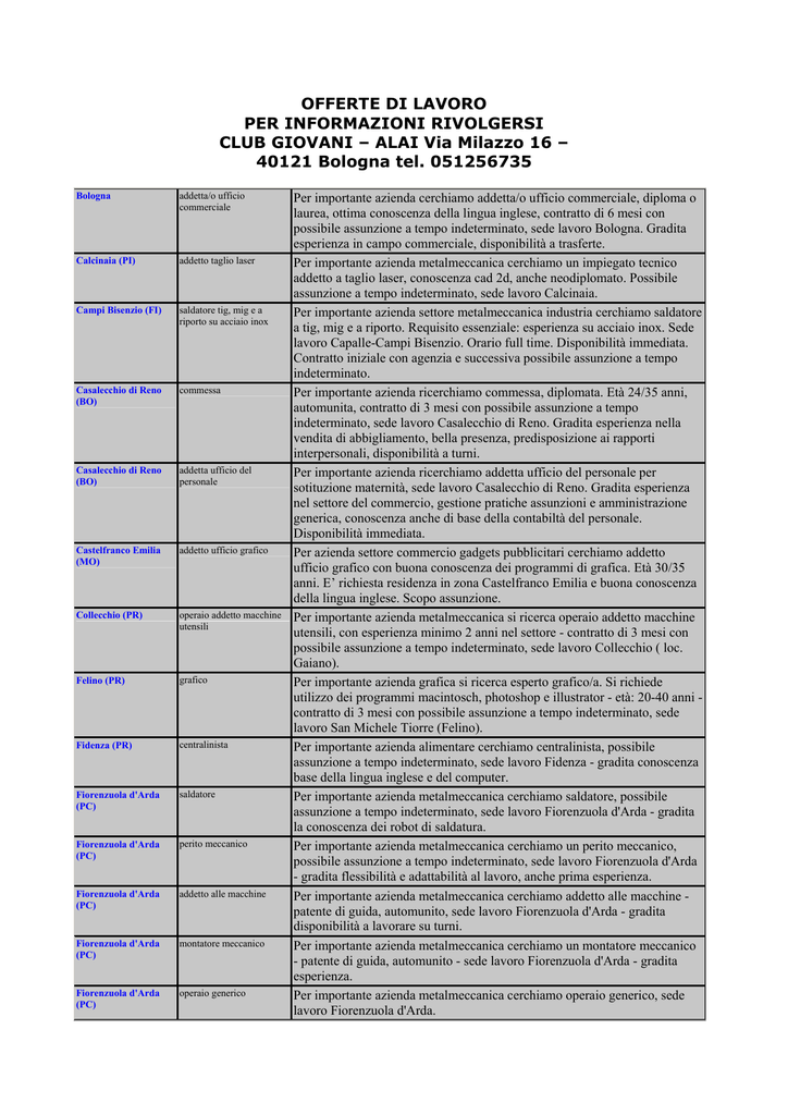 OFFERTE DI LAVORO PER INFORMAZIONI RIVOLGERSI CLUB GIOVANI ā ALAI Via Milazzo 16 ā 40121 Bologna tel. 051256735 Bologna addetta/o ufficio commerciale Calcinaia (PI) addetto taglio laser Campi Bisenzio (FI) saldatore tig, mig e a riporto su acciaio inox Casalecchio di Reno (BO) commessa Casalecchio di Reno (BO) addetta ufficio del personale Castelfranco Emilia (MO) addetto ufficio grafico Collecchio (PR) operaio addetto macchine utensili Felino (PR) grafico Fidenza (PR) centralinista Fiorenzuola d'Arda (PC) saldatore Fiorenzuola d'Arda (PC) perito meccanico Fiorenzuola d'Arda (PC) addetto alle macchine Fiorenzuola d'Arda (PC) montatore meccanico Fiorenzuola d'Arda (PC) operaio generico Per importante azienda cerchiamo addetta/o ufficio commerciale, diploma o laurea, ottima conoscenza della lingua inglese, contratto di 6 mesi con possibile assunzione a tempo indeterminato, sede lavoro Bologna. Gradita esperienza in campo commerciale, disponibilità a trasferte. Per importante azienda metalmeccanica cerchiamo un impiegato tecnico addetto a taglio laser, conoscenza cad 2d, anche neodiplomato. Possibile assunzione a tempo indeterminato, sede lavoro Calcinaia. Per importante azienda settore metalmeccanica industria cerchiamo saldatore a tig, mig e a riporto. Requisito essenziale: esperienza su acciaio inox. Sede lavoro Capalle-Campi Bisenzio. Orario full time. Disponibilità immediata. Contratto iniziale con agenzia e successiva possibile assunzione a tempo indeterminato. Per importante azienda ricerchiamo commessa, diplomata. Età 24/35 anni, automunita, contratto di 3 mesi con possibile assunzione a tempo indeterminato, sede lavoro Casalecchio di Reno. Gradita esperienza nella vendita di abbigliamento, bella presenza, predisposizione ai rapporti interpersonali, disponibilità a turni. Per importante azienda ricerchiamo addetta ufficio del personale per sotituzione maternità, sede lavoro Casalecchio di Reno. Gradita esperienza nel settore del commercio, gestione pratiche assunzioni e amministrazione generica, conoscenza anche di base della contabiltà del personale. Disponibilità immediata. Per azienda settore commercio gadgets pubblicitari cerchiamo addetto ufficio grafico con buona conoscenza dei programmi di grafica. Età 30/35 anni. Eā richiesta residenza in zona Castelfranco Emilia e buona conoscenza della lingua inglese. Scopo assunzione. Per importante azienda metalmeccanica si ricerca operaio addetto macchine utensili, con esperienza minimo 2 anni nel settore - contratto di 3 mesi con possibile assunzione a tempo indeterminato, sede lavoro Collecchio ( loc. Gaiano). Per importante azienda grafica si ricerca esperto grafico/a. Si richiede utilizzo dei programmi macintosch, photoshop e illustrator - età: 20-40 anni contratto di 3 mesi con possibile assunzione a tempo indeterminato, sede lavoro San Michele Tiorre (Felino). Per importante azienda alimentare cerchiamo centralinista, possibile assunzione a tempo indeterminato, sede lavoro Fidenza - gradita conoscenza base della lingua inglese e del computer. Per importante azienda metalmeccanica cerchiamo saldatore, possibile assunzione a tempo indeterminato, sede lavoro Fiorenzuola d'Arda - gradita la conoscenza dei robot di saldatura. Per importante azienda metalmeccanica cerchiamo un perito meccanico, possibile assunzione a tempo indeterminato, sede lavoro Fiorenzuola d'Arda - gradita flessibilità e adattabilità al lavoro, anche prima esperienza. Per importante azienda metalmeccanica cerchiamo addetto alle macchine patente di guida, automunito, sede lavoro Fiorenzuola d'Arda - gradita disponibilità a lavorare su turni. Per importante azienda metalmeccanica cerchiamo un montatore meccanico - patente di guida, automunito - sede lavoro Fiorenzuola d'Arda - gradita esperienza. Per importante azienda metalmeccanica cerchiamo operaio generico, sede lavoro Fiorenzuola d'Arda. Fontevivio (PR) impiegati videoterminalisti Forlì (FC) autista Forlì (FC) autista Forlì (FC) magazziniere Formigine (MO) magazziniere part time Funo di Argelato (BO) operatore metalmeccanico Funo di Argelato (BO) verniciatore Imola (BO) disegnatore tecnico elettrico Lippo di Calderara di Reno (BO) ingegnere meccanico Lippo di Calderara di Reno (BO) impiegata/o ufficio magazzino Lippo di Calderara di Reno (BO) rettificatore Modena operatore controllo numerico Modena addetto agli acquisti Modena segretaria di direzione part time Modena e provincia impiegate/i contabili Modena e provincia periti meccanici Per azienda settore trasporti si ricercano impiegati videoterminalisti, esperti in bollettazione - gradita conoscenza sistema operativo SAP. Contratto di 6 mesi con possibile assunzione a tempo indeterminato, sede lavoro Fontevivo. Per azienda traslochi di Forlì cercasi addetti al carico e scarico con patente C per consegne. Si richiede la residenza in zona, età max 40 anni. Scopo assunzione. Per azienda di Forlì settore commercio cercasi autisti/magazzinieri patente C per consegne in zona. Si richiede residenza in zona. Età max 40 anni. Per azienda di Forlì cercasi urgentemente magazziniere addetto anche all'inserimento dati. Si richiede: diploma tecnico, (preferibilmente geometra) età max 28 anni, automunito, residenza in zona. Scopo assunzione. Per azienda di Formigine cerchiamo magazziniere part time per 3 giorni a settimana per un totale di 24 ore settimanali. Per importante azienda leader nella fornitura di trattamenti superficiali a reparti corse ricerchiamo operatore metalmeccanico, possibile assunzione a tempo indeterminato, sede lavoro Funo di Argelato. Gradita esperienza come tornitore esecutore di piazzamento o attrezzista, conoscenza del disegno meccanico e strumenti di misura, nozioni di cnc o plc. Per importante azienda ricerchiamo verniciatore con ottima comprensione alla lingua italiana, possibile assunzione a tempo indeterminato, sede lavoro Funo di Argelato. Gradita esperienza pluriennale nel settore delle vernici liquide, non fumatore. P