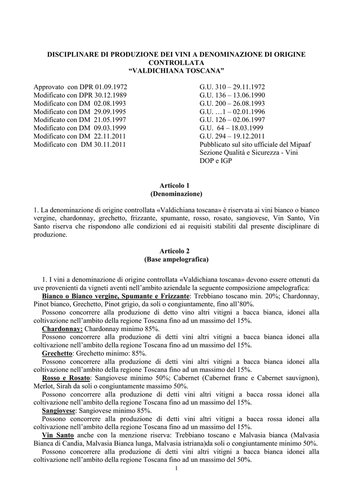 DISCIPLINARE DI PRODUZIONE DEI VINI A DENOMINAZIONE DI ORIGINE CONTROLLATA “VALDICHIANA TOSCANA” Approvato con DPR 01.09.1972 Modificato con DPR 30.12.1989 Modificato con DM 02.08.1993 Modificato con DM 29.09.1995 Modificato con DM 21.05.1997 Modificato con DM 09.03.1999 Modificato con DM 22.11.2011 Modificato con DM 30.11.2011 G.U. 310 – 29.11.1972 G.U. 136 – 13.06.1990 G.U. 200 – 26.08.1993 G.U. …1 – 02.01.1996 G.U. 126 – 02.06.1997 G.U. 64 – 18.03.1999 G.U. 294 – 19.12.2011 Pubblicato sul sito ufficiale del Mipaaf Sezione Qualità e Sicurezza - Vini DOP e IGP Articolo 1 (Denominazione) 1. La denominazione di origine controllata «Valdichiana toscana» è riservata ai vini bianco o bianco vergine, chardonnay, grechetto, frizzante, spumante, rosso, rosato, sangiovese, Vin Santo, Vin Santo riserva che rispondono alle condizioni ed ai requisiti stabiliti dal presente disciplinare di produzione. Articolo 2 (Base ampelografica) 1. I vini a denominazione di origine controllata «Valdichiana toscana» devono essere ottenuti da uve provenienti da vigneti aventi nell’ambito aziendale la seguente composizione ampelografica: Bianco o Bianco vergine, Spumante e Frizzante: Trebbiano toscano min. 20%; Chardonnay, Pinot bianco, Grechetto, Pinot grigio, da soli o congiuntamente, fino all’80%. Possono concorrere alla produzione di detto vino altri vitigni a bacca bianca, idonei alla coltivazione nell’ambito della regione Toscana fino ad un massimo del 15%. Chardonnay: Chardonnay minimo 85%. Possono concorrere alla produzione di detti vini altri vitigni a bacca bianca idonei alla coltivazione nell’ambito della regione Toscana fino ad un massimo del 15%. Grechetto: Grechetto minimo: 85%. Possono concorrere alla produzione di detti vini altri vitigni a bacca bianca idonei alla coltivazione nell’ambito della regione Toscana fino ad un massimo del 15%. Rosso e Rosato: Sangiovese minimo 50%; Cabernet (Cabernet franc e Cabernet sauvignon), Merlot, Sirah da soli o congiuntamente massimo 50%. Possono concorrere alla produzione di detti vini altri vitigni a bacca rossa idonei alla coltivazione nell’ambito della regione Toscana fino ad un massimo del 15%. Sangiovese: Sangiovese minimo 85%. Possono concorrere alla produzione di detti vini altri vitigni a bacca rossa idonei alla coltivazione nell’ambito della regione Toscana fino ad un massimo del 15%. Vin Santo anche con la menzione riserva: Trebbiano toscano e Malvasia bianca (Malvasia Bianca di Candia, Malvasia Bianca lunga, Malvasia istriana)da soli o congiuntamente minimo 50%. Possono concorrere alla produzione di detti vini altri vitigni a bacca bianca idonei alla coltivazione nell’ambito della regione Toscana fino ad un massimo del 50%. 1 Si riportano nell'allegato 1 i vitigni complementari che possono concorrere alla produzione dei vini sopra indicati, iscritti nel Registro nazionale delle varietà di vite per uve da vino approvato con D.M. 7 maggio 2004 (pubblicato sulla G.U. n. 242 del 14 ottobre 2004 e successivi aggiornamenti. Articolo 3 (Zona di produzione delle uve) 1. Le uve destinate alla produzione dei vini della denominazione di origine controllata «Valdichiana toscana» devono essere prodotte nella zona di produzione che comprende in parte il territorio amministrativo dei comuni di Arezzo, Castiglion Fiorentino, Cortona, Foiano, Lucignano, Marciano, Monte San Savino e Civitella in Val di Chiana in provincia di Arezzo e Sinalunga, Torrita di Siena, Chiusi, Montepulciano in provincia di Siena. Tale zona è così delimitata: in prossimità di Arezzo, in località La Mossa, al Km 145 della strada statale n.71, ha inizio la delimitazione del territorio dei vini “Valdichiana”. Da questo punto procede verso sud seguendo la suddetta statale e, dopo aver superato la confluenza (quota 281) con la strada statale n.75 per le località di Olmo, Pieve a Quarto, Policiano, Pieve di Rigutino. Da Rigutino verso nord-est, segue la strada per Pieve di Rigutino, quindi attraverso una mulattiera, passa per podere Rigutinelli, podere Sartiano, podere La Torre, quindi verso Villa Rada, quote 480, 526, poggio Sorbino, quote 430, 365 (Il Castello), giunge a Cozzano. Da Cozzano prosegue attraverso una rotabile prima e una carreggiabile poi verso Villa Apparita, quota 470 e Mammi. Da Mammi la linea di delimitazione prosegue attraverso una mulattiera fino a Villa Ranco, da dove attraverso una rotabile, passa per il Ceriolo, quota 534 e si immette in una mulattiera che conduce a Santa Margherita. Da santa Margherita (quota 295) passa per la mulattiera che conduce a colle Secco, quindi a Santa Cristina, Taragnano, Caprile, Le Capanne, La Badiola, Il Toppo e Santo Stefano. Da Santo Stefano la delimitazione si dirige verso sud e, per quota 307, raggiunge, attraverso una carreggiabile, Pieve di Chio, Petreto, quota 314, casa Materna, quota 296, quota 285 ed Orzale. Da Orzale prosegue attraverso una mulattiera per il Toppo, Pergonano, quote 299, 440, 576, 549, 581,516,459,396 e 357, costeggia il fosso Rostonchia fino a quota 309. Da qui prosegue per quota 332 e, attraverso una mulattiera, raggiunge il Moro, villa di Pozzo, quote 501 e 523, monte Le Civitelle quote 537, 496 e 449. Da quota 449 prosegue prima per una carrareccia e poi per una mulattiera e, passando vicino a quota 331, si immette nella carreggiabile di Quarantola e la discende fino a San Pietro. Da qui prosegue attraverso quota 382 per Cegliolo, quote 327, 386, 433 e 422, case Bocina, quote 441 e 439. I Cappuccini e quota 553. Da quota 553 si immette sulla carreggiabile che conduce per Maestà del Pianello, alla strada provinciale per Cortona. La linea di delimitazione segue detta provinciale fino al bivio del Torreone, quindi se ne distacca e per quota 565 e 510, attraverso una carreggiabile, giunge a Teccognano, quindi per quote 359 e 438, attraverso una mulattiera, giunge a Volpaia, prosegue per la stessa mulattiera fino al mulino al vento, quindi per quote 362 e 502 giung