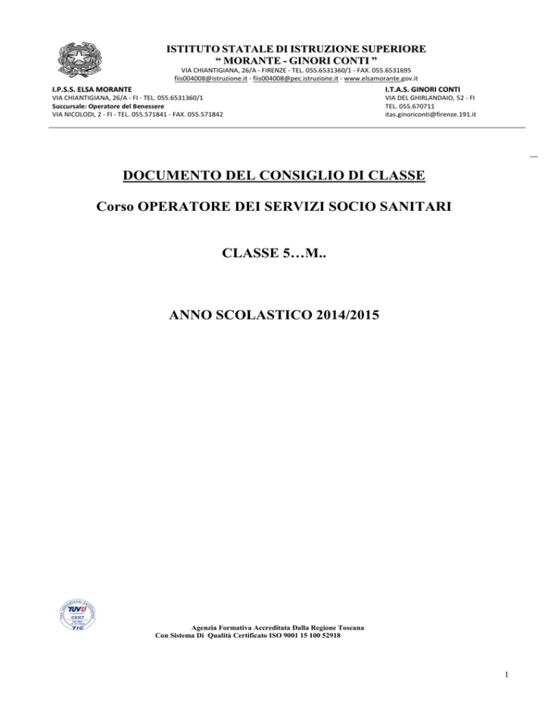 ISTITUTO STATALE DI ISTRUZIONE SUPERIORE “ MORANTE - GINORI CONTI ” VIA CHIANTIGIANA, 26/A - FIRENZE - TEL. 055.6531360/1 - FAX. 055.6531695 [email protected] - [email protected] - www.elsamorante.gov.it I.P.S.S. ELSA MORANTE I.T.A.S. GINORI CONTI VIA CHIANTIGIANA, 26/A - FI - TEL. 055.6531360/1 Succursale: Operatore del Benessere VIA NICOLODI, 2 - FI - TEL. 055.571841 - FAX. 055.571842 VIA DEL GHIRLANDAIO, 52 - FI TEL. 055.670711 [email protected] DOCUMENTO DEL CONSIGLIO DI CLASSE Corso OPERATORE DEI SERVIZI SOCIO SANITARI CLASSE 5…M.. ANNO SCOLASTICO 2014/2015 Agenzia Formativa Accreditata Dalla Regione Toscana Con Sistema Di Qualità Certificato ISO 9001 15 100 52918 1 1. PROFILO PROFESSIONALE: OPERATORE DEI SERVIZI SOCIO SANITARI Al termine del quinto anno lo studente deve aver acquisito le competenze necessarie per: ⇒ Organizzare ed attuare interventi adeguati alle esigenze socio-sanitarie di persone e comunità ⇒ Promuovere la salute ed il benessere bio-psico-sociale di persone e comunità L’indirizzo è caratterizzato da una visione integrata dei servizi sociali e sanitari per attività che riguardano l’inclusione sociale ed il benessere di persone e comunità, nelle aree che riguardano soprattutto: ♦ la mediazione familiare ♦ l’immigrazione ♦ le fasce sociali più deboli ♦ le attività di animazione socio-educative e culturali ♦ tutto il settore legato al benessere Le competenze acquisite permetteranno allo studente di: dialogare e migliorare il sistema delle relazioni con i diversi utenti interagire con la comunità sociale, con i servizi socio – sanitari del territorio , compreso il privato-sociale assumere ruoli adeguati nell’evoluzione dei bisogni socio-sanitari Le innovazioni in atto nel settore socio –sanitario richiederanno sempre più conoscenze scientifiche e tecniche, competenze correlate con le scienze umane e sociali, con la cultura medico-sanitaria questo per comprendere i mutamenti sociali, il nuovo concetto di salute e benessere, le dinamiche di una società multiculturale, per riconoscere le problematiche relative alle diverse tipologie di utenza al fine di contribuire a promuovere azioni a sostegno di persone e comunità con particolare attenzione alle fasce deboli. ATTIVITA’ DI ALTERNANZA SCUOLA – LAVORO Le attività di alternanza scuola-lavoro sono state orientate a far acquisire competenze professionali inerenti l’indirizzo di studi, a promuovere la conoscenza di tipologie diverse di utenza con cui rapportarsi, ad imparare a muoversi nel mondo del lavoro svolto nei servizi socio sanitari.. Considerando i diversi percorsi scolastici precedentemente seguiti dagli studenti sono stati organizzati alcuni stage nel settore infanzia per alcuni , mentre per quanti provengono dal corso Dirigenti di Comunità si è ritenuto sufficiente il tirocinio già effettuato . Durante questo anno gli studenti hanno partecipato al Progetto d’Istituto di Alternanza Scuola-Lavoro “Alter- Scuola”. Mirato al raggiungimento di competenze professionali nel settore dei servizi socio sanitari , anche attraverso il collocamento nei vari curriculi disciplinari di alcuni moduli specifici attinenti ai vari settori di collocamento lavorativo. Visto l'esiguo tempo a disposizione si è cercato di organizzare a scuola interventi con esperti che operano nei vari ambiti del socio-sanitario oltre a favorire la partecipazione ad eventi organizzati all'esterno da Enti pubblici e privati. Molti studenti hanno partecipato ad iniziative di formazione e di animazione quali: - visita al Museo Pacini, Anatomia patologica; Università di Firenze - incontro di Educazione alla salute sull’Aids, tenuto da M. Ravaglia, operatore LILA Firenze -incontro di Educazione alla salute sulle Dipendenze, tenuto dal dott. Cutrì, dirigente medico SerT, Firenze - spettacolo “ NON LO SO” presso il teatro REIMS – Firenze - visita del Museo e della struttura di servizi della Misericordia di Firenze in piazza Duomo - Museo Novecento in piazza Santa Maria Novella per partecipare alla installazione/laboratorio artistico MONDI LUMINOSI, con Associazione MUS.E, nell'ambito degli eventi organizzati nel Programma Kinds Notte Bianca Firenze 2015 2 PROFILO DELLA CLASSE ELENCO ALUNNI 1 2 BAON PAMELA RUTH DONFACK MAKEMGON MADELEINE 10 11 MONGE QUIROZ WENDY LISSETH MORI MATTEO 3 4 5 6 7 8 9 FROSALI STEFANIA GOLA ELENA INNOCENTI ELEONORA ISMAILI ROMILDA KOSOVA MILTON LAZRI JOSEFINA MICIC MIODRAG 12 13 14 15 16 17 18 ORTEGA PAMELA ALEJANDRA LUNA PALUSHI MAURO RAZZI ROSSELLA STATON EDOARDO TUESTA TERRONES KATIA YENQUE VARILLAS JUAN DARIO ZIDAROIU LISA PAMELA ELENCO DOCENTI PER MATERIA 2. Cultura Medico Sanitaria 3. Diritto e Legislazione Sanitaria 4. Italiano e Storia 5. Lingua Inglese 6. Lingua Spagnola 7. Matematica 8. Psicologia generale e applicata 9. Tecnica Ammin. ed Ec. Sociale Coordinatore Prof. Genovese Stella Maria Prof. Apollaro Carmela Prof. Lembo Ilaria Prof. Castagnoli Manuela Patrizia Prof. Tarantola Andrea Prof. Cecchi Stefano Prof. Pranzini Ilaria Prof. Pezzati Fiammetta Prof. Genovese Stella Maria Membri Interni Materia Prof.ssa Ilaria Lembo Prof.ssa Carmelina Apollaro Prof.ssa Fiammetta Pezzati Italiano e Storia Diritto e Legislazione Sanitaria Tecnica Amministrativa ed Educazione Sociale QUADRO ORARIO SETTIMANALE PER SINGOLA DISCIPLINA (classe quinta) A seguito della applicazione del nuovo regolamento sull'organizzazione dei corsi per adulti , il quadro orario ha subito delle riduzioni rispetto a quello dei corsi diurni MATERIA Cultura Medico Sanitaria Diritto e Legislazione Socio Sanitaria Italiano e Storia Lingua Inglese Lingua Spagnola Matematica Psicologia generale ed applicata Tecnica Ammin. Ed Ec. Sociale ORE SETTIMANALI 3 3 5 3 3 3 4 2 totale 26 3 DESCRIZIONE DELLA CLASSE La classe, formatisi in questo anno scolastico, si presenta molto eterogenea con alunni di età, nazionalità e percorsi di studi molto diversi. All'inizio risultavano formalmente iscritte 30 pers