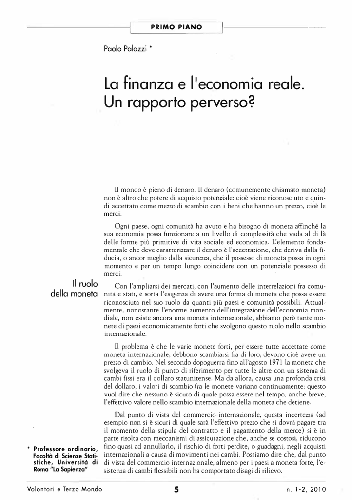PRIMO PIANO Paolo Palazzi • La finanza e l'economia reale. Un rapporto perverso? Il mondo è pieno di denaro. Il denaro (comunemente chiamato moneta) non è altro che potere di acquisto potenziale: cioè viene riconosciuto e quin di accettato come mezzo di scambio con i beni che hanno un prezzo, cioè le merci. Ogni paese, ogni comunità ha avuto e ha bisogno di moneta affinché la sua economia possa funzionare a un livello di complessità che vada al di là delle forme più primitive di vita sociale ed economica. L'elemento fonda mentale che deve caratterizzare il denaro è l'accettazione, che deriva dalla fi ducia, o ancor meglio dalla sicurezza, che il possesso di moneta possa in ogni momento e per un tempo lungo coincidere con un potenziale possesso di merci. Il ruolo della moneta Con l'ampliarsi dei mercati, con l'aumento delle interrelazioni fra comu nità e stati, è sorta l'esigenza di avere una forma di moneta che possa essere riconosciuta nel suo ruolo da quanti più paesi e comunità possibili. Attual mente, nonostante l'enorme aumento dell'integrazione dell'economia mon diale, non esiste ancora una moneta internazionale, abbiamo però tante mo nete di paesi economicamente forti che svolgono questo ruolo nello scambio internazionale. Il problema è che le varie monete forti, per essere tutte accettate come moneta internazionale, debbono scambiarsi fra di loro, devono cioè avere un prezzo di cambio. Nel secondo dopoguerra fino all'agosto 1971 la moneta che svolgeva il ruoto di punto di riferimento per tutte le altre con un sistema di cambi fissi era il dollaro statunitense. Ma da allora, causa una profonda crisi del dollaro, i valori di scambio fra le monete variano continuamente: questo vuoi dire che nessuno è sicuro di quale possa essere nel tempo, anche breve, l'effettivo valore nello scambio internazionale della moneta che detiene. Dal punto di vista del commercio internazionale, questa incertezza (ad esempio non si è sicuri di quale sarà l'effettivo prezzo che si dovrà pagare tra il momento della stipula del contratto e il pagamento della merce) si è in • Professore ordinario, Facoltà di Scienze Stati stiche, Universi t à d i Roma "La Sapienza" Volontari e Terzo Mondo parte risolta con meccanismi di assicurazione che, anche se costosi, riducono fino quasi ad annullarlo, il rischio di forti perdite, o guadagni, negli acquisti internazionali a causa di movimenti nei cambi. Possiamo dire che, dal punto di vista del commercio internazionale, almeno per i paesi a moneta forte, l'e sistenza di cambi flessibili non ha comportato disagi di rilievo. 5 n. 1-2, 2010 Paolo Palazzi C'è però un problema: se analizziamo i dati relativi ai movimenti inter nazionali di capitali ci appare subito come i movimenti internazionali di mo neta causati da effettivo scambio di merci siano una minima parte di tutti i movimenti di capitali finanziari che avvengono nel mondo. Non solo, ma i tassi di crescita di questo fenomeno tendono continuamente ad ampliarlo. Ad esempio negli anni '90, il commercio internazionale è cresciuto del 63%, mentre il movimento di capitali è cresciuto del 300%, senza nessun rapporto di riferimento con l'aumento di ricchezza reale (il PIL è cresciuto nello stesso periodo del 26%). Cosa sono, di chi sono, chi li gestisce e perché si muovono questi caPitali? Quali sono gli effetti? Si può fare qualcosa per evitarne le conseguenze negative? La risposta a tali domande non è facile, ma sono questi i nodi da affron tare per comprendere cosa succede nei apporti finanziari internazionali che cos1 grande peso hanno sulla vita di miliardi di persone, specialmente di quelle che vivono in posizioni marginali. Proviamo, ovviamente in modo sintetico, a rispondere. 1) Cosa sono questi capitali? Il capitale finanziario rappresenta una ricchezza accumulata e tenuta sot to forma di moneta (quindi non di beni). L'origine.di tale ricchezza, che non è altro che risparmio accumulato, è essenzialmente dovuta a due motivi: la incapacità e impossibilità di spendere il proprio reddito oppure l'intenzione di differire nel tempo l'acquisto di merci. Il primo fattore è dovuto all'esistenza di redditi superiori alla concreta ca La ricchezza e il sistema opeativo pacità di essere utilizzati per l'acquisto. Per i più ricchi il reddito si trasforma quindi da possibilità di acquisto a potere fine a sé stesso, con un ruolo simile alle antiche, anche se in parte non sparite, ostentazioni di ricchezza attraver so i beni di lusso. Quindi la ricchezza accumulata diventa la possibilità, da parte di imprese o singoli individui, di influenzare, di controllare o di gestire il sistema economico e anche quello politico. Il secondo fattore ha invece diverse cause e motivazioni ma che essen zialmente possono essere individuate in motivi precauzionali per sé o per i propri discendenti, e motivi di accumulazione per costi di acquisto molto elevati. Ma questi due fattori di creazione di risparmio, dal punto di vista motiva zionale molto diversi, hanno qualcosa in comune: in entrambi i casi l'aspet tativa è, come minimo, di mantenere inalterato nel tempo il potere di acqui sto d e l loro risparmio, ma tendenzialmente anche la ricerca di u n meccanismo che permetta u n accrescimento del valore reale nel tempo, un rendimento superiore all'inflazione. Nella stragrande maggioranza dei casi è impossibile per un singolo sog getto (impresa o individuo) avere la possibilità di raggiungere individual mente questo obiettivo, quindi ci si affida a professionisti che si sono specia lizzati nella gestione dei risparmi e che sono le banche e ·i vari intermediari finanziari. Volontari e Terzo Mondo 6 n. '-2,2010 PRIMO PIANO I La finanza e l'economia reale. Un rapporto perverso? L'aumento del 2) Di chi sono questi capitali? Parte dei capitali finanziari accumulati sono essenzialmente delle imprese risparmio e le disuguaglianze e dei singoli individui, cioè dei soggetti che in maggior misura possono libe 