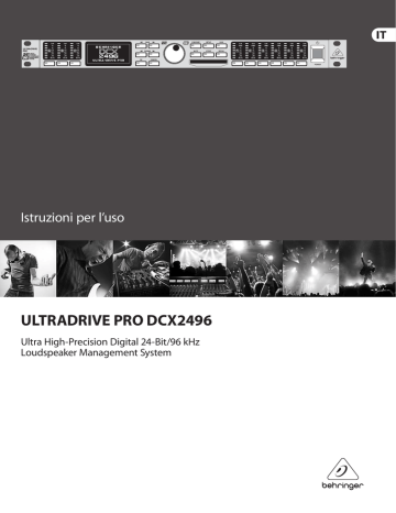 Istruzioni per l’uso ULTRADRIVE PRO DCX2496 Ultra High-Precision Digital 24-Bit/96 kHz Loudspeaker Management System 2 ULTRADRIVE PRO DCX2496 Istruzioni per l’uso Indice Grazie............................................................................... 2 Istruzioni di sicurezza importanti................................. 3 Diniego Legale................................................................. 3 Garanzia Limitata ........................................................... 3 1. Introduzione............................................................... 4 2. Elementi di Comando................................................. 4 3. Guida Rapida............................................................... 6 4. Struttura dei Menu ed Elaborazione........................ 7 5. Connessioni Audio.................................................... 18 6. Applicazioni.............................................................. 18 7. Specifiche.................................................................. 31 8. Block Diagram........................................................... 33 9. Menu Structure......................................................... 34 Grazie Molte grazie per la fiducia che ci avete dimostrato con l’acquisto dell’ULTRADRIVE PRO DCX2496. Questo apparecchio rappresenta un sistema digitale di gestione altoparlanti, ottimale per applicazioni sia dal vivo che in studio. 3 ULTRADRIVE PRO DCX2496 Istruzioni per l’uso Istruzioni di sicurezza importanti Attenzione I terminali contrassegnati con il simbolo conducono una corrente elettrica sufficiente a costituire un rischio di scossa elettrica. Usare unicamente cavi per altoparlanti (Speaker) d’elevata qualità con connettori jack TS da ¼" pre-installati. Ogni altra installazione o modifica deve essere effettuata esclusivamente da personale tecnico qualificato. Questo simbolo, avverte, laddove appare, della presenza di importanti istruzioni per l‘uso e per la manutenzione nella documentazione allegata. Si prega di consultare il manuale. Attenzione Per ridurre il rischio di scossa elettrica non rimuovere la copertura superiore (o la sezione posteriore). All‘interno non sono contenute parti che possono essere sottoposte a riparazione da parte dell‘utente. Interventi di riparazione possono essere eseguiti solo da personale qualificato. Attenzione Al fine di ridurre il rischio di incendi o di scosse elettriche, non esporre questo dispositivo alla pioggia ed all’umidità. L’apparecchio non deve essere esposto a sgocciolamenti o spruzzi, e sull’apparecchio non devono essere posti oggetti contenenti liquidi, ad esempio vasi. Attenzione Queste istruzioni per l’uso sono destinate esclusivamente a personale di servizio qualificato. Per ridurre il rischio di scosse elettriche non effettuare operazioni all’infuori di quelle contenute nel manuale istruzioni. Interventi di riparazione possono essere eseguiti solo da personale qualificato. 1. Leggere queste istruzioni. 2. Conservare queste istruzioni. 3. Fare attenzione a tutti gli avvertimenti. 4. Seguire tutte le istruzioni. 5. Non usare questo dispositivo vicino all’acqua. 6. Pulire solo con uno strofinaccio asciutto. 7. Non bloccare alcuna fessura di ventilazione. Installare conformemente alle istruzioni del produttore. 8. Non installare nelle vicinanze di fonti di calore come radiatori, caloriferi, stufe o altri apparecchi (amplificatori compresi) che generano calore. 9. Non annullare l’obiettivo di sicurezza delle spine polarizzate o con messa a terra. Le spine polarizzate hanno due lame, con una più larga dell’altra. Una spina con messa a terra ha due lame e un terzo polo di terra. La lama larga o il terzo polo servono per la sicurezza dell’utilizzatore. Se la spina fornita non è adatta alla propria presa, consultate un elettricista per la sostituzione della spina. 10. Disporre il cavo di alimentazione in modo tale da essere protetto dal calpestio e da spigoli taglienti e che non possa essere danneggiato. Accertarsi che vi sia una protezione adeguata in particolare nel campo delle spine, del cavo di prolunga e nel punto in cui il cavo di alimentazione esce dall’apparecchio. 11. L’apparecchio deve essere costantemente collegato alla rete elettrica mediante un conduttore di terra in perfette condizioni. 12. Se l’unità da disattivare è l’alimentatore o un connettore per apparecchiature esterne, essa dovrà rimanere costantemente accessibile. 13. Usare solo dispositivi opzionali/accessori specificati dal produttore. 14. Usare solo con carrello, supporto, cavalletto, sostegno o tavola specificate dal produttore o acquistati con l’apparecchio. Quando si usa un carrello, prestare attenzione, muovendo il carrello/la combinazione di apparecchi, a non ferirsi. 15. Staccare la spina in caso di temporale o quando non si usa l’apparecchio per un lungo periodo. 16. Per l’assistenza tecnica rivolgersi a personale qualificato. L’assistenza tecnica è necessaria nel caso in cui l’unità sia danneggiata, per es. per problemi del cavo di alimentazione o della spina, rovesciamento di liquidi od oggetti caduti nell’apparecchio, esposizione alla pioggia o all’umidità, anomalie di funzionamento o cadute dell’apparecchio. 17. Smaltimento corretto di questo prodotto: Questo simbolo indica che questo prodotto non deve essere smaltito con i rifiuti domestici, conformemente alle disposizioni WEEE (2002/96/CE) e alle leggi in vigore nel vostro paese. Questo prodotto deve essere consegnato ad un centro autorizzato alla raccolta per il riciclaggio dei dispositivi elettrici ed elettronici (DEE). Una gestione inadeguata di questo tipo di rifiuti potrebbe avere un impatto negativo sull’ambiente e sulla salute a causa delle sostanze potenzialmente pericolose generalmente associate ai DEE. Al tempo stesso, la vostra collaborazione per un corretto smaltimento di questo prodotto contribuirà ad uno sfruttamento più efficace delle risorse natu