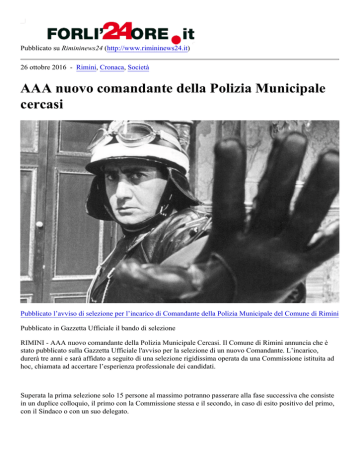 Pubblicato su Rimininews24 (http://www.rimininews24.it) 26 ottobre 2016 - Rimini, Cronaca, Società AAA nuovo comandante della Polizia Municipale cercasi Pubblicato l’avviso di selezione per l’incarico di Comandante della Polizia Municipale del Comune di Rimini Pubblicato in Gazzetta Ufficiale il bando di selezione RIMINI - AAA nuovo comandante della Polizia Municipale Cercasi. Il Comune di Rimini annuncia che è stato pubblicato sulla Gazzetta Ufficiale l'avviso per la selezione di un nuovo Comandante. L’incarico, durerà tre anni e sarà affidato a seguito di una selezione rigidissima operata da una Commissione istituita ad hoc, chiamata ad accertare l’esperienza professionale dei candidati. Superata la prima selezione solo 15 persone al massimo potranno passerare alla fase successiva che consiste in un duplice colloquio, il primo con la Commissione stessa e il secondo, in caso di esito positivo del primo, con il Sindaco o con un suo delegato. I colloqui prenderanno in esame differenti argomenti e ovviamente affronteranno anche gli aspetti legati alle leggi, alle tecniche direzionali e all'organizzazione del lavoro. Per partecipare al concorso le domande dovranno essere presentate entro il 14 novembre prossimo, mentre entro la metà di dicembre si procederà all’affidamento dell’incarico. L’intero testo dell’avviso pubblico è consultabile al sito internet www.comune.rimini.it. Tag: Polizia Municipaleconcorso pubblicoComune di Rimini Ti potrebbe interessare anche Pugno di ferro contro la prostituzione a Rimini RIMINI - delle circa trecento sanzioni emesse da inizio anno al 26 ottobre scorso, 289 sono state elevate per il mancato rispetto dell’ordinanza sindacale contingibile e urgente (valida dal 1° giugno al 15 ottobre) e che prevede un pagamento di 400 euro. Dieci invece i clienti e cinque le prostitute sanzionate rispettivamente per 1.000 e 200 euro per la violazione dell’articolo 32 del Regolamento di Polizia urbana Multe in via Euterpe, la Municipale impugnerà la sentenza RIMINI - Sanzioni amministrative per eccesso di velocità in via Euterpe: il Comando della Polizia Municipale di Rimini dichiara che impugnerà la sentenza del Giudice di Pace davanti al Giudice monocratico del Tribunale, "in quanto del tutto certo della regolarità e del rispetto delle normative vigenti sia in ordine alla notifica delle sanzioni che alla verifica della taratura dell’apparecchio di via Euterpe": così in una nota diffusa dall'amministrazione comunale riminese. Vendite promozionali: in vigore le nuove disposizioni regionali In ottemperanza con le recenti disposizioni della Giunta regionale, il Comando di Polizia municipale comunica che è stabilito che le vendite promozionali non possano essere effettuate, nei 30 giorni antecedenti i periodi delle vendite di fine stagione le vendite promozionali dei seguenti prodotti: abbigliamento, calzature, biancheria intima, accessori di abbigliamento, pelletteria e tessuti per abbigliamento ed arredamento. Collegamento sorgente: http://www.rimininews24.it/news/rimini/0045967-aaa-nuovo-comandante-dellapolizia-municipale-cercasi