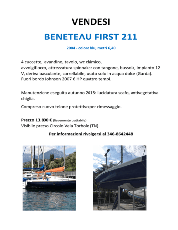 VENDESI BENETEAU FIRST 211 2004 - colore blu, metri 6,40 4 cuccette, lavandino, tavolo, wc chimico, avvolgifiocco, attrezzatura spinnaker con tangone, bussola, impianto 12 V, deriva basculante, carrellabile, usato solo in acqua dolce (Garda). Fuori bordo Johnson 2007 6 HP quattro tempi. Manutenzione eseguita autunno 2015: lucidatura scafo, antivegetativa chiglia. Compreso nuovo telone protettivo per rimessaggio. Prezzo 13.800 € (lievemente trattabile) Visibile presso Circolo Vela Torbole (TN). Per informazioni rivolgersi al 346-8642448