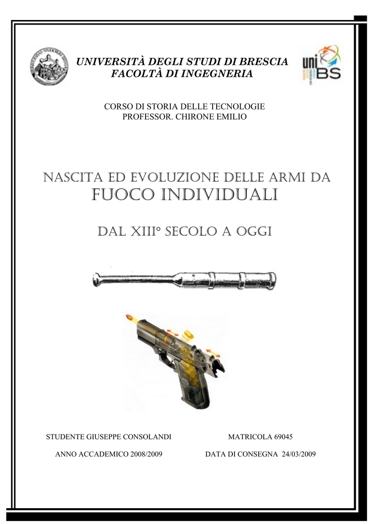 UNIVERSITÀ DEGLI STUDI DI BRESCIA FACOLTÀ DI INGEGNERIA CORSO DI STORIA DELLE TECNOLOGIE PROFESSOR. CHIRONE EMILIO NASCITA ED EVOLUZIONE DELLE ARMI DA FUOCO INDIVIDUALI DAL XIII° SECOLO A OGGI STUDENTE GIUSEPPE CONSOLANDI MATRICOLA 69045 ANNO ACCADEMICO 2008/2009 DATA DI CONSEGNA 24/03/2009 LA POLVERE E IL CANNONE L’invenzione più importante che diede il via alle armi da fuoco fù la polvere da sparo 75% di salnitro, 15% di carbone, 10% di zolfo altrimenti detta polvere nera per il tipico colore. Già fin dall’anno 1000 vi sono testimonianze attendibili che i Cinesi facevano un uso pirotecnico di composti a base di salnitro; i vari nazionalismi danno però il merito della scoperta sia a Roger Bacon (per gli Inglesi) sia al monaco Bertold Schwartz (per i Tedeschi); l’unico punto in comune era l’epoca: il XIII° secolo. Le prime attendibili informazioni sulla polvere da sparo sono invece contenute nel libro di Marcus Graecus che, nel XIII° secolo, si riferisce ad un’opera di un anonimo autore arabo del secolo precedente. Se nessuno è ed è stato in grado di stabilire con esattezza chi, quando e dove, abbia fatto questa importante scoperta più o meno fortuita, notizie più precise si hanno sulle prime applicazioni della stessa, utilizzata per proiettare oggetti il più lontano e violentemente possibile. Tavola tratta dall'opera di Marcus Graecus. Un’arma da fuoco si può quindi semplicemente descrivere come un robusto tubo contenente della carica esplosiva allo scopo di lanciare proiettili; inizialmente costituiti da sfere di pietra o metallo e da particolari tipi di lance o frecce. Anche qui il nazionalismo vizia la storia e, pertanto, si trovano testimonianze circa il primo uso di cannoni a Siviglia nel 1247, ad Amberga nel 1301 o nelle Fiandre attorno al 1310. Di sicuro c’è che la prima certa rappresentazione grafica di cannoni è contenuta in un manoscritto dell’Inglese Walter de Millimete, redatto nel 1327 in omaggio per l’incoronazione, avvenuta l’anno prima, di Re Edoardo III° d’Inghilterra; in esso i cannoni sono raffigurati . Edoardo III° , sembra sia stato il primo monarca ad impiegare cannoni in battaglia, anche se i suoi cannonieri provenivano da Hainault, per l’appunto, nelle Fiandre. Il "Tannenberger Bucshe". Consolidato l’uso del cannone, ci si rese conto che rimpicciolendo il tutto si potevano dotare i singoli soldati di armi micidiali anche se costruzione e funzionamento erano gli stessi per qualunque tipo di utilizzo e dimensione; solo la forma e la denominazione erano, a volte, diverse (cannone, bombarda, falcone, colubrina, ecc.) Il difficile di queste armi era rendere sicuro e certo il funzionamento dei nuovi ordigni; i sistemi di accensione della polvere da sparo hanno infatti creato problemi fin dalle loro origini praticamente sino alla seconda metà del XIX° secolo, nel tempo, si sono inventati nel tempo più disparati congegni. All’inizio la polvere veniva accesa mettendole a contatto diretto un tizzone ardente e le canne (o bocche da fuoco) erano normalmente in bronzo fuso, fissate a semplici affusti in legno (sia che si trattasse di cannoni o di “bombe manesche”). 1 L’arma da fuoco portatile più antica che attualmente è conosciuta e conservata è il cosiddetto “Tannenberger Bucshe”, risalente al XIV° secolo; esso è un vero e proprio schioppo costituito da un tubo di bronzo fuso della lunghezza totale di circa 34 centimetri, dei quali 16 sono di canna avente diametro interno (calibro) di 17 millimetri, 12 di camera di scoppio (dove veniva messa la polvere) a diametro ridotto, e gli ultimi 6 cm erano il sistema di collegamento ad un palo in legno che fungeva da impugnatura o calcio. L’accensione avveniva portando qualcosa di incandescente a contatto di un foro praticato nella camera di scoppio (focone); il risultato, per chi era dietro l’arma, era di una fiammata bi direzionale che ustionava molto spesso chi maneggiava l’arma. Quasi subito ci si accorse che le armi portatili, affinché dessero la possibilità ragionevole di colpire un bersaglio e, quindi, di prendere la mira, dovevano essere tenute ben ferme; questa considerazione portò a ricercare sistemi di accensione migliori e più idonei con condizioni più ergonomiche di impugnature; nel frattempo per le canne si passava dal bronzo al più economico ferro. I primi risultati della ricerca diedero vita ai cosiddetti sistemi a serpentino , nei quali una miccia a lenta combustione veniva portata a contatto del focone per mezzo di una leva a forma di S, dapprima mediante semplice pressione e, successivamente, mediante un sistema di scatto a molla (nasce il primo grilletto). E’ dello stesso periodo l’invenzione della rigatura interna della canna, intesa a stabilizzare la traiettoria del proiettile: dapprima venne realizzata rettilinea e poi a spirale (circa nel 1470). Dopo aver stabilizzato la “volata“ il proiettile si pensò di applicare i primi rudimentali sistemi di mira perfezionandoli a tal punto che già nel 1500 consentivano di portare il tiro utile delle armi portatili a ben 200 metri, e con una discreta precisione. Sistema di accensione "a miccia" Il principale problema di funzionamento rimaneva però ancora insoluto ed era la pioggia: la miccia, se bagnata, si spegneva; la prima soluzione pratica fu l’invenzione del cosiddetto sistema “ meccanismo a ruota”. Il principio è semplice una rotella ruvida viene fatta sfregare, mediante un meccanismo a molla, caricato ad ogni colpo come un orologio, su una pietra focaia per sprigionare scintille al fine di accendere un innesco che, attraverso il focone, fa esplodere la polvere; le prime armi a ruota apparvero in Germania attorno al 1510. Questo meccanismo era però assai costoso ma, dopo qualche tempo venne trovata, una pratica soluzione già attorno al 1525: bastava invertire il funzionamento. Sistema di accensione "a ruota". 2 Sistema di accensione "a pietra". Non una superficie ruvida f
