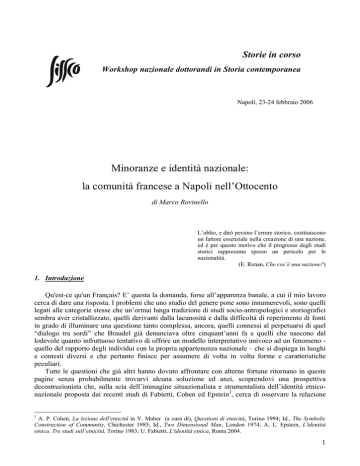 Storie in corso Workshop nazionale dottorandi in Storia contemporanea Napoli, 23-24 febbraio 2006 Minoranze e identità nazionale: la comunità francese a Napoli nell’Ottocento di Marco Rovinello L’oblio, e dirò persino l’errore storico, costituiscono un fattore essenziale nella creazione di una nazione, ed è per questo motivo che il progresso degli studi storici rappresenta spesso un pericolo per le nazionalità. (E. Renan, Che cos’è una nazione?) 1. Introduzione Qu'est-ce qu'un Français? E’ questa la domanda, forse all’apparenza banale, a cui il mio lavoro cerca di dare una risposta. I problemi che uno studio del genere pone sono innumerevoli, sono quelli legati alle categorie stesse che un’ormai lunga tradizione di studi socio-antropologici e storiografici sembra aver cristallizzato, quelli derivanti dalla lacunosità e dalla difficoltà di reperimento di fonti in grado di illuminare una questione tanto complessa, ancora, quelli connessi al perpetuarsi di quel “dialogo tra sordi” che Braudel già denunciava oltre cinquant’anni fa e quelli che nascono dal lodevole quanto infruttuoso tentativo di offrire un modello interpretativo univoco ad un fenomeno quello del rapporto degli individui con la propria appartenenza nazionale – che si dispiega in luoghi e contesti diversi e che pertanto finisce per assumere di volta in volta forme e caratteristiche peculiari. Tutte le questioni che già altri hanno dovuto affrontare con alterne fortune ritornano in queste pagine senza probabilmente trovarvi alcuna soluzione ed anzi, scoprendovi una prospettiva decostruzionista che, sulla scia dell’immagine situazionalista e strumentalista dell’identità etniconazionale proposta dai recenti studi di Fabietti, Cohen ed Epstein1, cerca di osservare la relazione 1 A. P. Cohen, La lezione dell'etnicità in V. Maher (a cura di), Questioni di etnicità, Torino 1994; Id., The Symbolic Construction of Community, Chichester 1985; Id., Two Dimensional Man, London 1974; A. L. Epstein, L'identità etnica. Tre studi sull’etnicità, Torino 1983; U. Fabietti, L'identità etnica, Roma 2004. 1 soggetto-Nazione, non solo attraverso la lente dello Stato e della Legge2 ma anche attraverso gli occhi di coloro i quali, cittadini di ogni ceto e livello culturale, si trovano quotidianamente a fare i conti con il peso/l’opportunità di essere parte della grande “famiglia nazionale”. Il caso francese, colto in quell’Ottocento unanimemente considerato “the Nation building century”3, rappresenta senza dubbio un oggetto di studio privilegiato, sia perché da più parti è ormai invalsa l’idea che sia proprio la Rivoluzione ad aver aperto la strada alla moderna concezione di un’idea dalla storia già secolare come quella di Nazione4, sia perché proprio sul caso francese si sono già avuti i primi riscontri, tanto del mutevole atteggiamento delle autorità politiche sul tema dell’appartenenza nazionale5, quanto della debolezza (si potrebbe meglio dire dell’inconsistenza) nella maggioranza della popolazione di un simile sentimento, ancora alla fine del secolo6. Se dunque oggi sappiamo che la “francesizzazione” dei sauvages della campagnia d’Oltralpe ha rappresentato un processo lungo, dall’andamento assolutamente non lineare e dall’estensione, per così dire, a macchie di leopardo7, nulla sappiamo sull’atteggiamento che le migliaia di persone che in quegli stessi anni partono da quelle terre per recarsi altrove dimostrano di avere riguardo la propria “francesità”. Anche se si tratta di una parte di gran lunga minoritaria della popolazione totale, la questione è tutt’altro che secondaria, soprattutto alla luce delle considerazioni che l’analisi sociologica ha anche recentemente proposto circa la tendenza delle minoranze etnico-nazionali a rafforzare i propri elementi identitari una volta insediatesi in paesi avvertiti come stranieri, a “fabbricare” - per dirla con le parole di Ugo Fabietti - un’identità etnia8. Prendere in esame le vicende dei francesi immigrati nella Napoli prima giuseppino-murattiana e poi borbonica significa dunque affrontare due problemi insieme: da un lato, quello relativo al rapporto che essi dimostrano di avere con la propria identità nazionale e la percezione che di questo rapporto hanno le rispettive autorità politico-diplomatiche (tanto quelle francesi quanto quelle regnicole), dall’altro, quello rappresentato dal modus vivendi, dalle strategie, dal grado d’integrazione della colonia francese all’interno della società partenopea, allo scopo di verificare l’idea che vuole le minoranze presenti nel Mezzogiorno ottocentesco essere come monadi caratterizzate dalla “continua e orgogliosa affermazione della propria identità”9. 2. I flussi migratori: i tempi e i luoghi 2.1. I tempi E’ il 14 aprile 1818 quando, forse preso da un momento di scoramento per le difficoltà connesse al suo ruolo istituzionale, l’ambasciatore francese a Napoli scrive “C’est impossible de savoir combien de citoyens français arrivent dans cette ville par jour”10. 2 Come ammonisce Eric Hobsbawm, “le ideologie ufficiali di Stati e movimenti non sono molto indicative di ciò che effettivamente passa per la testa dei cittadini, nemmeno dei cittadini più devoti, né degli stessi sostenitori di tali movimenti.”. E. Hobsbawm, Nazioni e nazionalismi dal 1780, Torino 1991, p.13. 3 W. Bagehot, Physics and Politics, London 1887, p. 20. 4 Per uno sguardo di lungo periodo sullo spostamento semantico del termine “Nazione” cfr. tra gli altri F. Chabod, L'idea di nazione, Roma-Bari 2004; F. Tuccari, La Nazione, Roma-Bari 2000. 5 P. Weil, Qu'est-ce qu'un Français? Histoire de la nationalité française depuis la Révolution, Paris 2002; G. Noiriel, La tyrannie du national. Le droit d’asile en Europe 1793-1993, Paris 1991; R. Brubaker, Cittadinanza e nazionalità in Francia e Germania, Bologna 1997. 6 E. Weber, Da contadini a francesi. La mod