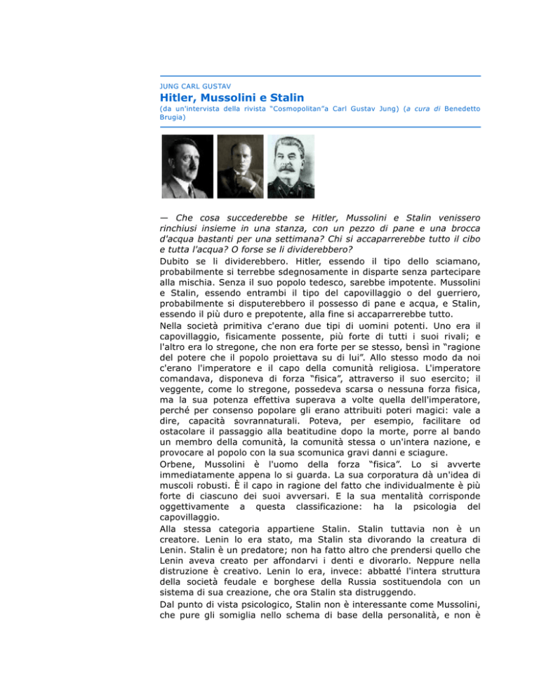 JUNG CARL GUSTAV Hitler, Mussolini e Stalin (da un'intervista della rivista “Cosmopolitan”a Carl Gustav Jung) (a cura di Benedetto Brugia) — Che cosa succederebbe se Hitler, Mussolini e Stalin venissero rinchiusi insieme in una stanza, con un pezzo di pane e una brocca d'acqua bastanti per una settimana? Chi si accaparrerebbe tutto il cibo e tutta l'acqua? O forse se li dividerebbero? Dubito se li dividerebbero. Hitler, essendo il tipo dello sciamano, probabilmente si terrebbe sdegnosamente in disparte senza partecipare alla mischia. Senza il suo popolo tedesco, sarebbe impotente. Mussolini e Stalin, essendo entrambi il tipo del capovillaggio o del guerriero, probabilmente si disputerebbero il possesso di pane e acqua, e Stalin, essendo il più duro e prepotente, alla fine si accaparrerebbe tutto. Nella società primitiva c'erano due tipi di uomini potenti. Uno era il capovillaggio, fisicamente possente, più forte di tutti i suoi rivali; e l'altro era lo stregone, che non era forte per se stesso, bensì in “ragione del potere che il popolo proiettava su di lui”. Allo stesso modo da noi c'erano l'imperatore e il capo della comunità religiosa. L'imperatore comandava, disponeva di forza “fisica”, attraverso il suo esercito; il veggente, come lo stregone, possedeva scarsa o nessuna forza fisica, ma la sua potenza effettiva superava a volte quella dell'imperatore, perché per consenso popolare gli erano attribuiti poteri magici: vale a dire, capacità sovrannaturali. Poteva, per esempio, facilitare od ostacolare il passaggio alla beatitudine dopo la morte, porre al bando un membro della comunità, la comunità stessa o un'intera nazione, e provocare al popolo con la sua scomunica gravi danni e sciagure. Orbene, Mussolini è l'uomo della forza “fisica”. Lo si avverte immediatamente appena lo si guarda. La sua corporatura dà un'idea di muscoli robusti. È il capo in ragione del fatto che individualmente è più forte di ciascuno dei suoi avversari. E la sua mentalità corrisponde oggettivamente a questa classificazione: ha la psicologia del capovillaggio. Alla stessa categoria appartiene Stalin. Stalin tuttavia non è un creatore. Lenin lo era stato, ma Stalin sta divorando la creatura di Lenin. Stalin è un predatore; non ha fatto altro che prendersi quello che Lenin aveva creato per affondarvi i denti e divorarlo. Neppure nella distruzione è creativo. Lenin lo era, invece: abbatté l'intera struttura della società feudale e borghese della Russia sostituendola con un sistema di sua creazione, che ora Stalin sta distruggendo. Dal punto di vista psicologico, Stalin non è interessante come Mussolini, che pure gli somiglia nello schema di base della personalità, e non è neppure lontanamente interessante come lo stregone, il mito, come Hitler. — Chiunque assuma il comando di centosettanta milioni di individui, come ha fatto Stalin, non può non essere interessante, che piaccia o meno. No, Stalin è solo un bruto, un contadino furbo, una belva istintiva e possente, di gran lunga il più potente, questo è vero, di tutti i dittatori. Con quel collo taurino, i baffoni spioventi, e il sorriso di un gatto che ha appena rubato la panna, fa venire in mente una tigre siberiana dalle zanne a sciabola. Gengis Khan, diciamo, potrebbe essere considerato uno Stalin “ante litteram”. Non mi stupirei se si facesse acclamare zar. Hitler è tutt'altra cosa. La sua costituzione fisica non dà un'idea di forza. La caratteristica più evidente della sua fisionomia è lo sguardo sognante. È questo che mi ha colpito più di tutto nel vedere le fotografie scattate durante la crisi cecoslovacca: nei suoi occhi c'era lo sguardo del veggente. Non c'è dubbio che Hitler rientri nella categoria dello sciamano. Come ebbe a osservare qualcuno durante l'ultimo congresso del partito a Norimberga, non si è visto niente di simile dai tempi di Maometto. La caratteristica segnatamente mistica di Hitler è ciò che lo spinge a fare cose che “a noi” sembrano illogiche, inesplicabili, stravaganti e irragionevoli. Ma riflettiamo: persino la terminologia dei nazisti è chiaramente mistica. Prendiamo il nome stesso dello Stato nazista. Lo chiamano il Terzo Reich. Perché? — Perché il Primo Reich fu il Sacro Romano Impero, il secondo quello fondato da Bismarck e quello di Hitler è il terzo. Certo. Ma c'è un significato più profondo. Nessuno chiamò il regno di Carlo Magno il Primo Reich, né quello di Guglielmo il Secondo Reich. Solo i nazisti chiamano il proprio Stato il Terzo Reich. Perché ha un profondo significato “mistico”: nell'inconscio di ogni tedesco l'espressione “Terzo Reich” risveglia echi della gerarchia biblica. Perciò Hitler, che per parte sua ha più di una volta lasciato intendere di essere conscio della propria missione mistica, appare ai devoti del Terzo Reich qualcosa di più di un semplice uomo. E, ancora, prendiamo la diffusa reviviscenza del culto di Wotan nel Terzo Reich. Chi era Wotan? Il dio del vento. Prendiamo la denominazione “Sturmabteilung”, milizia della tempesta. La tempesta, capisce: il vento. Alla stessa stregua, la svastica è una ruota che forma un vortice ruotante incessantemente verso sinistra: il che nella simbologia buddhista ha un significato appunto sinistro, infausto, diretto verso l'inconscio. E tutti questi simboli di un Terzo Reich guidato dal suo profeta sotto le insegne del vento e della tempesta e del vortice incessante alludono a un movimento di massa che, in un uragano di emotività irrazionale, trascinerà il popolo tedesco sempre più verso un destino che nessuno può predire, tranne il veggente, il profeta, il Führer, e forse neppure lui. — Come mai, allora, Hitler, che fa cadere in adorazione ai suoi piedi ogni tedesco, sembra così insignificante a qualunque straniero? Appunto. Negli stranieri non provoca la minima risposta emotiva, mentre in Germania sì, in ogni tedesco, a quanto pare. Perché Hitler è lo specchio dell'inc