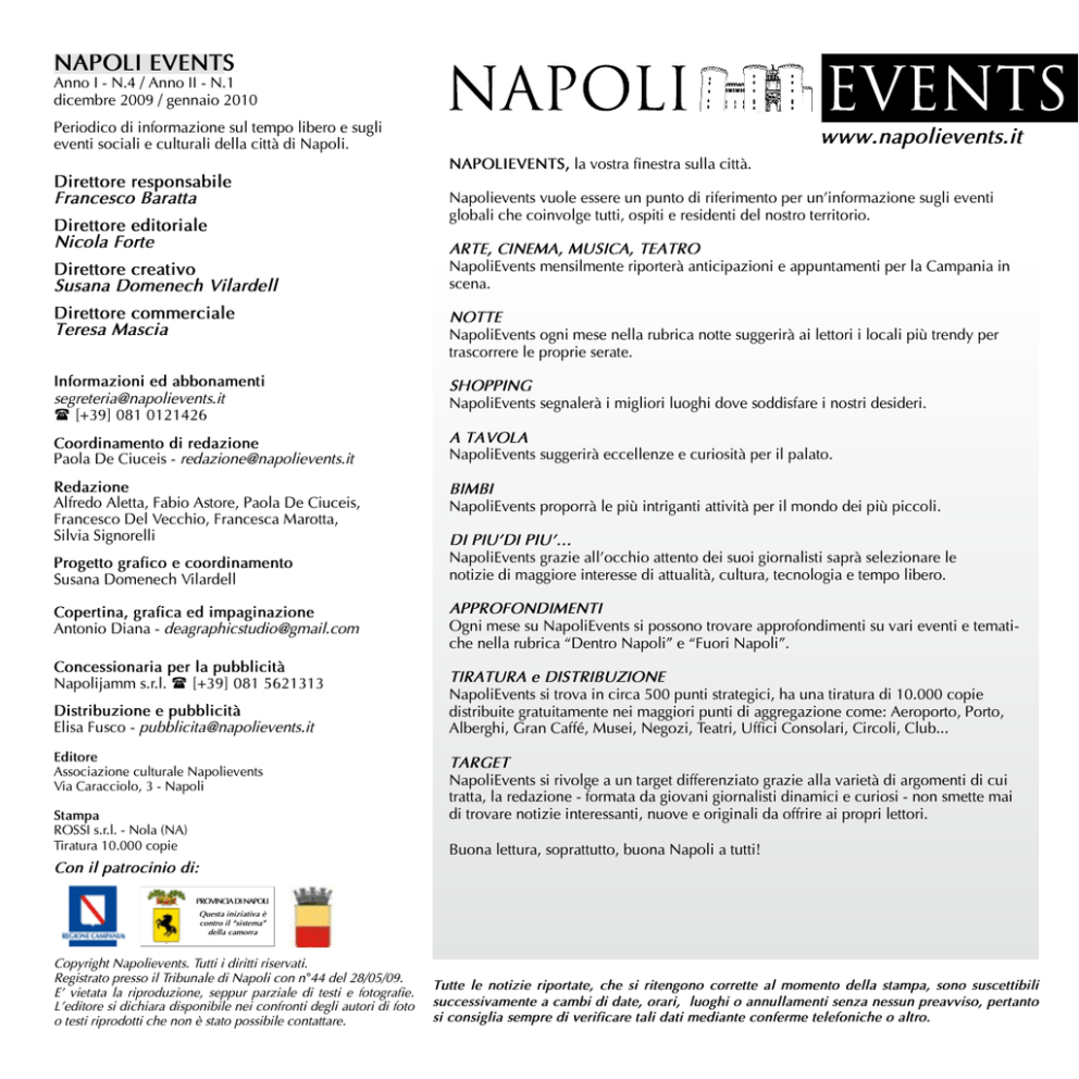 NAPOLI EVENTS Anno I - N.4 / Anno II - N.1 dicembre 2009 / gennaio 2010 Periodico di informazione sul tempo libero e sugli eventi sociali e culturali della città di Napoli. Direttore responsabile Francesco Baratta Direttore editoriale Nicola Forte Direttore creativo Susana Domenech Vilardell www.napolievents.it NAPOLIEVENTS, la vostra finestra sulla città. Napolievents vuole essere un punto di riferimento per un’informazione sugli eventi globali che coinvolge tutti, ospiti e residenti del nostro territorio. ARTE, CINEMA, MUSICA, TEATRO NapoliEvents mensilmente riporterà anticipazioni e appuntamenti per la Campania in scena. Direttore commerciale Teresa Mascia NOTTE NapoliEvents ogni mese nella rubrica notte suggerirà ai lettori i locali più trendy per trascorrere le proprie serate. Informazioni ed abbonamenti [email protected] ( [+39] 081 0121426 SHOPPING NapoliEvents segnalerà i migliori luoghi dove soddisfare i nostri desideri. Coordinamento di redazione Paola De Ciuceis - [email protected] A TAVOLA NapoliEvents suggerirà eccellenze e curiosità per il palato. Redazione Alfredo Aletta, Fabio Astore, Paola De Ciuceis, Francesco Del Vecchio, Francesca Marotta, Silvia Signorelli BIMBI NapoliEvents proporrà le più intriganti attività per il mondo dei più piccoli. Progetto grafico e coordinamento Susana Domenech Vilardell Copertina, grafica ed impaginazione Antonio Diana - [email protected] Concessionaria per la pubblicità Napolijamm s.r.l. ( [+39] 081 5621313 Distribuzione e pubblicità Elisa Fusco - [email protected] Editore Associazione culturale Napolievents Via Caracciolo, 3 - Napoli Stampa ROSSI s.r.l. - Nola (NA) Tiratura 10.000 copie DI PIU’DI PIU’… NapoliEvents grazie all’occhio attento dei suoi giornalisti saprà selezionare le notizie di maggiore interesse di attualità, cultura, tecnologia e tempo libero. APPROFONDIMENTI Ogni mese su NapoliEvents si possono trovare approfondimenti su vari eventi e tematiche nella rubrica “Dentro Napoli” e “Fuori Napoli”. TIRATURA e DISTRIBUZIONE NapoliEvents si trova in circa 500 punti strategici, ha una tiratura di 10.000 copie distribuite gratuitamente nei maggiori punti di aggregazione come: Aeroporto, Porto, Alberghi, Gran Caffé, Musei, Negozi, Teatri, Uffici Consolari, Circoli, Club... TARGET NapoliEvents si rivolge a un target differenziato grazie alla varietà di argomenti di cui tratta, la redazione - formata da giovani giornalisti dinamici e curiosi - non smette mai di trovare notizie interessanti, nuove e originali da offrire ai propri lettori. Buona lettura, soprattutto, buona Napoli a tutti! Con il patrocinio di: PROVINCIA DI NAPOLI Questa iniziativa è contro il “sistema” della camorra Copyright Napolievents. Tutti i diritti riservati. Registrato presso il Tribunale di Napoli con n°44 del 28/05/09. E’ vietata la riproduzione, seppur parziale di testi e fotografie. L’editore si dichiara disponibile nei confronti degli autori di foto o testi riprodotti che non è stato possibile contattare. Tutte le notizie riportate, che si ritengono corrette al momento della stampa, sono suscettibili successivamente a cambi di date, orari, luoghi o annullamenti senza nessun preavviso, pertanto si consiglia sempre di verificare tali dati mediante conferme telefoniche o altro. 2 3 Sommario EDITORIALE N.4 - dicembre 2009 / N.1 - gennaio 2010 EDITORIALE 3 ARTE TEATRO 10 La clemenza di Tito - Il Sud non è forse! - Zio Vanja - Enrico IV - L’oro di Napoli - Natale in casa Cupiello... MUSICA 26 Kaleidoscope Festival - The Dodos Giorgio Canali e Rossofuoco Cristiano De Andrè - Mario Biondi... NOTTE Bluestone - Evaluna - Tender Dug Out... SHOPPING Doni sotto l’albero - Mirlinum... FUORI PORTA 42 4 Carsten Nicolai - S. Keenleyside Ritorno al Barocco - Rebeca Menéndez - Barock - D.Santanelli... CINEMA 18 Capri/Hollywood, International Film Festival - A Christmas Carol - Io, loro e Lara - Cineforum... A TAVOLA Il Natale tra tradizione e gastronomia - La Chiacchierata Casa del nonno 13... BIMBI 58 80 Festa del torrone e del croccantino Luci d’artista - Benevento città luce Mercatino delle strenne natalizie... Disney live, le più belle fiabe Disney - La bella addormentata Il secolo d’oro... DI PIU’ DI PIU’ 34 46 62 Showcolate, la mostra del cioccolato Natale in mostra... PASSEGGIANDO TRA I SEGNI DELLA MEMORIA... Non sempre, anzi, quasi mai, il cuore di una città pulsa lì dove è il suo centro rappresentativo istituzionale, o dove si distendono le sue vie più eleganti dal lusso fastoso e raffinato. Così, come l’anima più vera di Roma vibra non a Via del Corso o a Piazza Colonna, ma tra le romantiche rovine del monte Palatino, il cuore di Napoli pulsa non al Vomero o a Palazzo San Giacomo, bensì nella stretta via di San Gregorio Armeno.Questa via fu già il cardine maggiore dell’antica Neapolis, congiungendo l’agorà - centro politico, civile e sociale della città - al decumano inferiore, l’arteria longitudinale ricca di vita, di movimento, di traffici. Il tracciato delle antiche strade resta immutato sotto lo stratificarsi delle memorie. Questa strada è oggi nota al gran pubblico come via dei “presepi” o “dei pastori”, è infatti il centro, oltre che della statuaria sacra in legno e cartapesta, di quell’artigianato delle figurine in creta, il cui ricordo toponomastico è conservato da una viuzza tra il decumano e il Grande Archivio che ancora porta il significativo nome di “via dei Figurari”. Ma, nella ricerca dei delle figurine con cui popolare il tuo presepe, o passeggiero curioso, non lasciarti sfuggire i segni della memoria, i segni della leggenda e della storia che sono i tratti distintivi dell’anima d’un popolo. Sul luogo della basilica romana si eleva la chiesa di san Lorenzo Maggiore, che il popolo chiama “chiesa di Sant’Antonio”: una pregevole, straordinaria immagine riceve la calda devozione che i Napoletani tributano all’affascinante taumaturgo di Padova. I