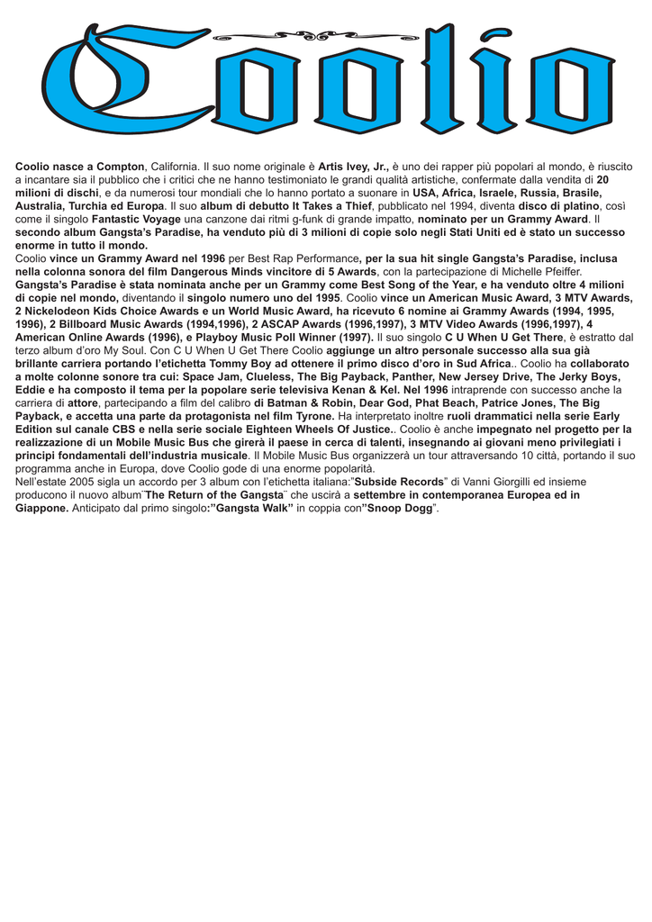Coolio nasce a Compton, California. Il suo nome originale è Artis Ivey, Jr., è uno dei rapper più popolari al mondo, è riuscito a incantare sia il pubblico che i critici che ne hanno testimoniato le grandi qualità artistiche, confermate dalla vendita di 20 milioni di dischi, e da numerosi tour mondiali che lo hanno portato a suonare in USA, Africa, Israele, Russia, Brasile, Australia, Turchia ed Europa. Il suo album di debutto It Takes a Thief, pubblicato nel 1994, diventa disco di platino, così come il singolo Fantastic Voyage una canzone dai ritmi g-funk di grande impatto, nominato per un Grammy Award. Il secondo album Gangsta’s Paradise, ha venduto più di 3 milioni di copie solo negli Stati Uniti ed è stato un successo enorme in tutto il mondo. Coolio vince un Grammy Award nel 1996 per Best Rap Performance, per la sua hit single Gangsta’s Paradise, inclusa nella colonna sonora del film Dangerous Minds vincitore di 5 Awards, con la partecipazione di Michelle Pfeiffer. Gangsta’s Paradise è stata nominata anche per un Grammy come Best Song of the Year, e ha venduto oltre 4 milioni di copie nel mondo, diventando il singolo numero uno del 1995. Coolio vince un American Music Award, 3 MTV Awards, 2 Nickelodeon Kids Choice Awards e un World Music Award, ha ricevuto 6 nomine ai Grammy Awards (1994, 1995, 1996), 2 Billboard Music Awards (1994,1996), 2 ASCAP Awards (1996,1997), 3 MTV Video Awards (1996,1997), 4 American Online Awards (1996), e Playboy Music Poll Winner (1997). Il suo singolo C U When U Get There, è estratto dal terzo album d’oro My Soul. Con C U When U Get There Coolio aggiunge un altro personale successo alla sua già brillante carriera portando l’etichetta Tommy Boy ad ottenere il primo disco d’oro in Sud Africa.. Coolio ha collaborato a molte colonne sonore tra cui: Space Jam, Clueless, The Big Payback, Panther, New Jersey Drive, The Jerky Boys, Eddie e ha composto il tema per la popolare serie televisiva Kenan & Kel. Nel 1996 intraprende con successo anche la carriera di attore, partecipando a film del calibro di Batman & Robin, Dear God, Phat Beach, Patrice Jones, The Big Payback, e accetta una parte da protagonista nel film Tyrone. Ha interpretato inoltre ruoli drammatici nella serie Early Edition sul canale CBS e nella serie sociale Eighteen Wheels Of Justice.. Coolio è anche impegnato nel progetto per la realizzazione di un Mobile Music Bus che girerà il paese in cerca di talenti, insegnando ai giovani meno privilegiati i principi fondamentali dell’industria musicale. Il Mobile Music Bus organizzerà un tour attraversando 10 città, portando il suo programma anche in Europa, dove Coolio gode di una enorme popolarità. Nell’estate 2005 sigla un accordo per 3 album con l’etichetta italiana:”Subside Records” di Vanni Giorgilli ed insieme producono il nuovo album¨The Return of the Gangsta¨ che uscirà a settembre in contemporanea Europea ed in Giappone. Anticipato dal primo singolo:”Gangsta Walk” in coppia con”Snoop Dogg”.
