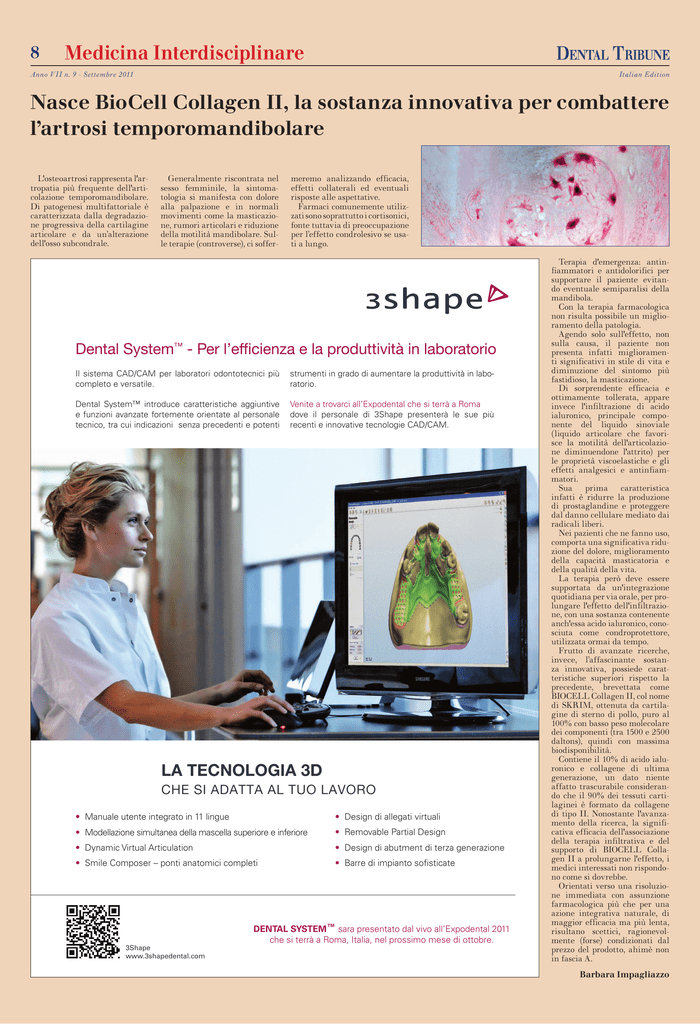 8 Medicina Interdisciplinare Anno VII n. 9 - Settembre 2011 Italian Edition Nasce BioCell Collagen II, la sostanza innovativa per combattere l’artrosi temporomandibolare L'osteoartrosi rappresenta l'artropatia più frequente dell'articolazione temporomandibolare. Di patogenesi multifattoriale è caratterizzata dalla degradazione progressiva della cartilagine articolare e da un’alterazione dell'osso subcondrale. Generalmente riscontrata nel sesso femminile, la sintomatologia si manifesta con dolore alla palpazione e in normali movimenti come la masticazione, rumori articolari e riduzione della motilità mandibolare. Sulle terapie (controverse), ci soffer- meremo analizzando efficacia, effetti collaterali ed eventuali risposte alle aspettative. Farmaci comunemente utilizzati sono soprattutto i cortisonici, fonte tuttavia di preoccupazione per l’effetto condrolesivo se usati a lungo. Dental System™ - Per l’efficienza e la produttività in laboratorio Il sistema CAD/CAM per laboratori odontotecnici più completo e versatile. strumenti in grado di aumentare la produttività in laboratorio. Dental System™ introduce caratteristiche aggiuntive e funzioni avanzate fortemente orientate al personale tecnico, tra cui indicazioni senza precedenti e potenti Venite a trovarci all’Expodental che si terrà a Roma dove il personale di 3Shape presenterà le sue più recenti e innovative tecnologie CAD/CAM. LA TECNOLOGIA 3D CHE SI ADATTA AL TUO LAVORO • Manuale utente integrato in 11 lingue • Design di allegati virtuali • Modellazione simultanea della mascella superiore e inferiore • Removable Partial Design • Dynamic Virtual Articulation • Design di abutment di terza generazione • Smile Composer – ponti anatomici completi • Barre di impianto sofisticate 3Shape www.3shapedental.com DENTAL SYSTEM™ sara presentato dal vivo all’Expodental 2011 che si terrà a Roma, Italia, nel prossimo mese di ottobre. Terapia d'emergenza: antinfiammatori e antidolorifici per supportare il paziente evitando eventuale semiparalisi della mandibola. Con la terapia farmacologica non risulta possibile un miglioramento della patologia. Agendo solo sull'effetto, non sulla causa, il paziente non presenta infatti miglioramenti significativi in stile di vita e diminuzione del sintomo più fastidioso, la masticazione. Di sorprendente efficacia e ottimamente tollerata, appare invece l'infiltrazione di acido ialuronico, principale componente del liquido sinoviale (liquido articolare che favorisce la motilità dell'articolazione diminuendone l'attrito) per le proprietà viscoelastiche e gli effetti analgesici e antinfiammatori. Sua prima caratteristica infatti è ridurre la produzione di prostaglandine e proteggere dal danno cellulare mediato dai radicali liberi. Nei pazienti che ne fanno uso, comporta una significativa riduzione del dolore, miglioramento della capacità masticatoria e della qualità della vita. La terapia però deve essere supportata da un'integrazione quotidiana per via orale, per prolungare l'effetto dell'infiltrazione, con una sostanza contenente anch'essa acido ialuronico, conosciuta come condroprotettore, utilizzata ormai da tempo. Frutto di avanzate ricerche, invece, l’affascinante sostanza innovativa, possiede caratteristiche superiori rispetto la precedente, brevettata come BIOCELL Collagen II, col nome di SKRIM, ottenuta da cartilagine di sterno di pollo, puro al 100% con basso peso molecolare dei componenti (tra 1500 e 2500 daltons), quindi con massima biodisponibilità. Contiene il 10% di acido ialuronico e collagene di ultima generazione, un dato niente affatto trascurabile considerando che il 90% dei tessuti cartilaginei è formato da collagene di tipo II. Nonostante l'avanzamento della ricerca, la significativa efficacia dell'associazione della terapia infiltrativa e del supporto di BIOCELL Collagen II a prolungarne l'effetto, i medici interessati non rispondono come si dovrebbe. Orientati verso una risoluzione immediata con assunzione farmacologica più che per una azione integrativa naturale, di maggior efficacia ma più lenta, risultano scettici, ragionevolmente (forse) condizionati dal prezzo del prodotto, ahimè non in fascia A. Barbara Impagliazzo