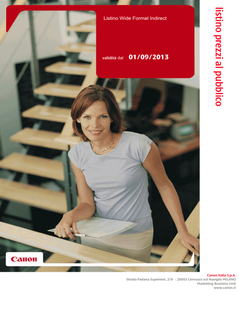 validità dal validità dal 01/09/2013 01/09/2013 listino prezzi al pubblico Listino Wide Format Indirect Canon Italia S.p.A. Strada Padana Superiore, 2/b - 20063 Cernusco sul Naviglio MILANO Marketing Business Unit www.canon.it Questa pagina è stata volutamente lasciata bianca Listino Wide Format Canon Italia S.p.A - Il presente listino annulla e sostituisce i precedenti - Edizione 01/09/2013 Le immagini possono mostrare i prodotti completi di accessori, e non sono contrattualmente vincolanti. Informazioni senza valore contrattuale, suscettibili di variazioni senza preavviso. Contributo RAEE assolto, ove dovuto. Salvo errori e/o omissioni. Pagina 3 di 114 Legenda dei simboli e degli spot: NEW DISCONTINUED ESAURITO Posto a sinistra del codice prodotto indica che si tratta di una novità Posto a sinistra del codice prodotto indica che il prodotto è in esaurimento Posto a sinistra del codice prodotto indica che il prodotto non è più disponibile é ê Posta a sinistra del prezzo IVA esclusa indica che vi è stato un rialzo rispetto all'edizione precedente Posta a sinistra del prezzo IVA esclusa indica che vi è stato un ribasso rispetto all'edizione precedente Pagina 4 di 114 Canon Italia S.p.A - Il presente listino annulla e sostituisce i precedenti - Edizione 01/09/2013 Le immagini possono mostrare i prodotti completi di accessori, e non sono contrattualmente vincolanti. Informazioni senza valore contrattuale, suscettibili di variazioni senza preavviso. Contributo RAEE assolto, ove dovuto. Salvo errori e/o omissioni. Donato Maggi Walter Bano Walter Bano Canon Italia S.p.A - Il presente listino annulla e sostituisce i precedenti - Edizione 01/09/2013 Le immagini possono mostrare i prodotti completi di accessori, e non sono contrattualmente vincolanti. Informazioni senza valore contrattuale, suscettibili di variazioni senza preavviso. Contributo RAEE assolto, ove dovuto. Salvo errori e/o omissioni. Grande Formato - Scanner Preparato da: Verificato da: Approvato da: Pagina 5 di 114 Questa pagina è stata volutamente lasciata bianca Pagina 6 di 114 Canon Italia S.p.A - Il presente listino annulla e sostituisce i precedenti - Edizione 01/09/2013 Le immagini possono mostrare i prodotti completi di accessori, e non sono contrattualmente vincolanti. Informazioni senza valore contrattuale, suscettibili di variazioni senza preavviso. Contributo RAEE assolto, ove dovuto. Salvo errori e/o omissioni. CAD/CAM/GIS Canon Italia S.p.A - Il presente listino annulla e sostituisce i precedenti - Edizione 01/09/2013 Le immagini possono mostrare i prodotti completi di accessori, e non sono contrattualmente vincolanti. Informazioni senza valore contrattuale, suscettibili di variazioni senza preavviso. Contributo RAEE assolto, ove dovuto. Salvo errori e/o omissioni. Pagina 7 di 114 COLORTRACCIEU Wide Format Wide Format Grande Formato - Scanner CAD/CAM/GIS ColorTrac SmartLF Ci series Scanner grande formato uso CAD per tutta la gamma plotter Canon Scanner in formato 40" (101,6 cm) per scansioni di documenti in scala di grigi, mono cromatici e colore. Con tecnologia (CIS) Contact Image Sensor, ColorTrac SmartLF Ci series ha una risoluzione ottica di 600 DPI, arrivando alla massima di 9.600 DPI (interpolata). Sviluppato appositamente per il mercato del disegno al tratto. Connessione USB 2.0 - Ethernet 1GB - Formati TIFF/ JPEG/ PDF. Spessore massimo originale 0,3mm Prodotti correlati Euro I.V.A. Esclusa Altri Accessori 0825V545 Computer Mount Kit Necessario Piedistallo 339,97 1467V483 Floor Stand for CI40 Piedistallo 484,19 1467V484 Paper Catchbasket CI40 Necessario Piedistallo 182,35 1782V209 Universal Repro Stand Common Part Fa si che lo scanner si possa posizionare sopra il Plotter. E' necessario ordinare anche il codice dell'URS specifico. 824,16 1782V212 URS Set Kit per serie Ci40 Fa si che lo scanner si possa posizionare sopra il Plotter. E' necessario ordinare anche il codice 1782V209 193,68 Euro I.V.A. Esclusa Software 0825V553 ISIS Driver Per Ci40m - Ci40c - Gx+ serie 216,34 1769V497 ISIS Driver CI40E Per Ci40e 216,34 1877V848 SmartWorks PRO Scan Compatibilità: SmartLF Ci Serie / SmartLF Gx+ Serie / SmartLF SC Serie Non compatibile con Scanner MFP 710,84 1877V849 SmartWorks PRO Copier Compatibilità: SmartLF Ci Serie / SmartLF Gx+ Serie / SmartLF SC Serie Non compatibile con Scanner MFP 710,84 1877V850 SmartWorks PRO Scan & Copier Compatibilità: SmartLF Ci Serie / SmartLF Gx+ Serie / SmartLF SC Serie Non compatibile con Scanner MFP 1.133,22 Garanzia Tagliando di Garanzia Il tagliando di garanzia "1 anno on-site" è scaricabile dal sito http://www.canon.it Euro I.V.A. Esclusa Estensione di garanzia Pagina 8 di 114 Canon Italia S.p.A - Il presente listino annulla e sostituisce i precedenti - Edizione 01/09/2013 Le immagini possono mostrare i prodotti completi di accessori, e non sono contrattualmente vincolanti. Informazioni senza valore contrattuale, suscettibili di variazioni senza preavviso. Contributo RAEE assolto, ove dovuto. Salvo errori e/o omissioni. CAD/CAM/GIS segue dalla pagina precedente Wide Format Grande Formato - Scanner COLORTRACCIEU Wide Format Pubblico Codice (Euro I.V.A. Esclusa) 1807V282 Easy Service Plan Scanner LF CX Estensione di garanzia per il 2° e 3° anno dall’acquisto, con assistenza presso la sede del Cliente. Comprende assistenza on-site, fornitura ricambi, servizio supporto tecnico. Tempo risposta: 8 ore lavorative medie. 1.003,00 Note Note Tempi di consegna della merce 40 giorni lavorativi, dal ricevimento dell'ordine, fatta salva la causa di forza maggiore o l'impossibilità sopravvenuta. Servizi Professionali Servizi Professionali Si prega di far riferimento alla parte dedicata ai Servizi Professionali o per qualsiasi informazione aggiuntiva contattare il Service Marketing all'indirizzo mail: [email protected] Canon Italia S.p.A - Il presente listino annulla e sostituisce i precedenti - Edizione 01/09/2013 Le immagini possono mostrare i prodotti completi di accessori,